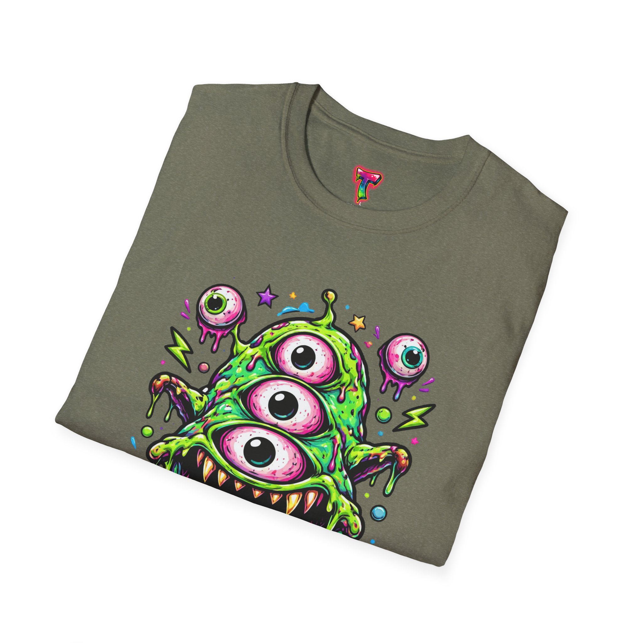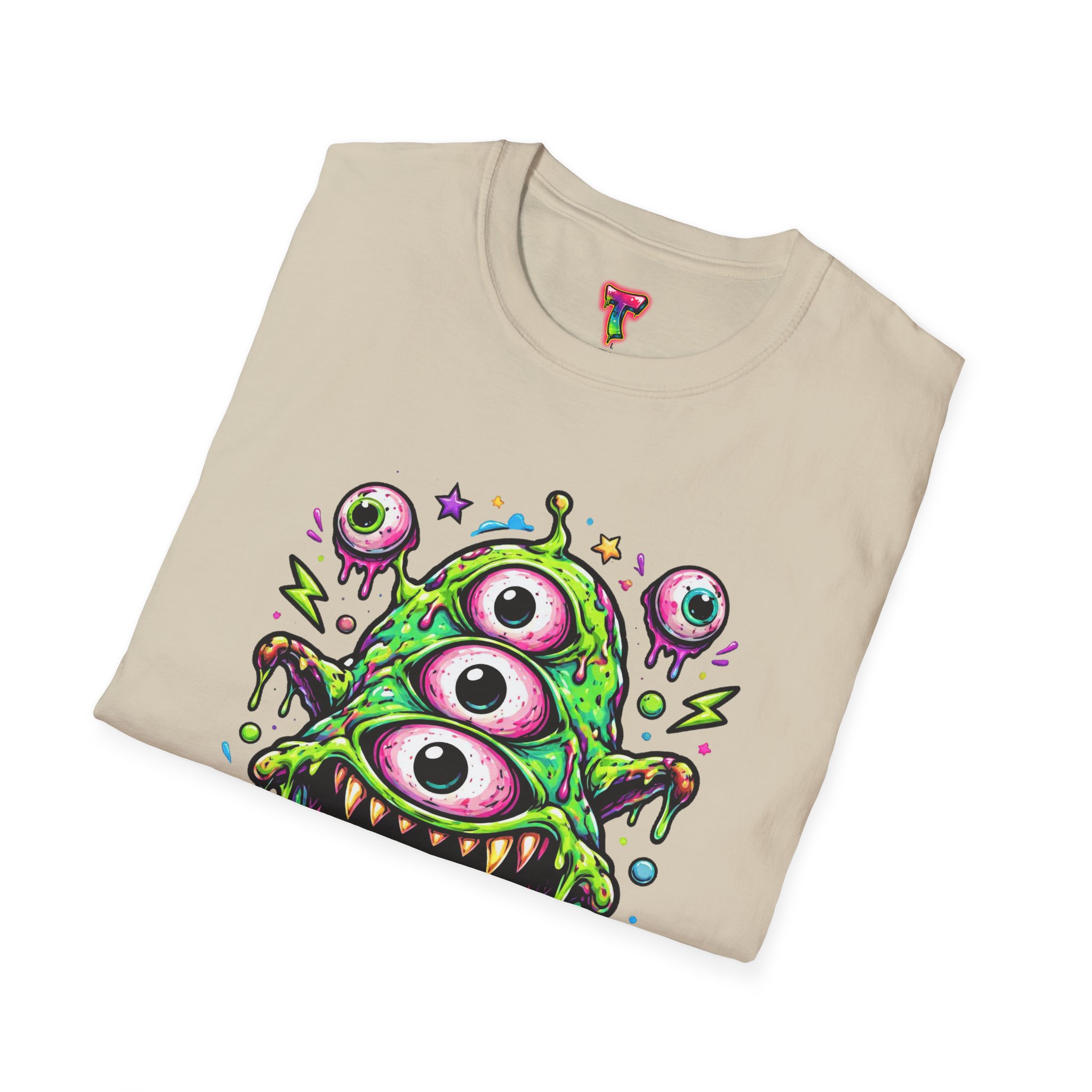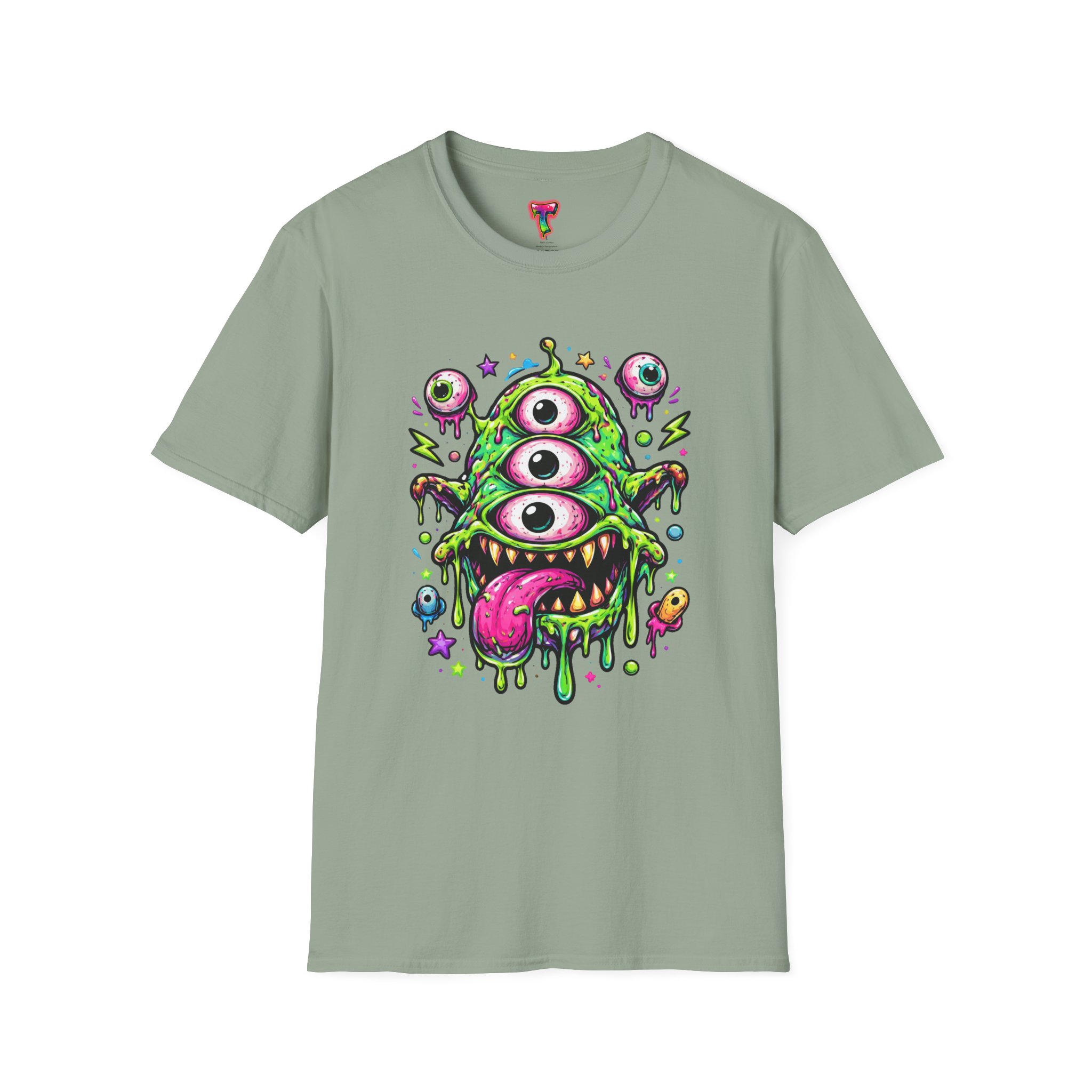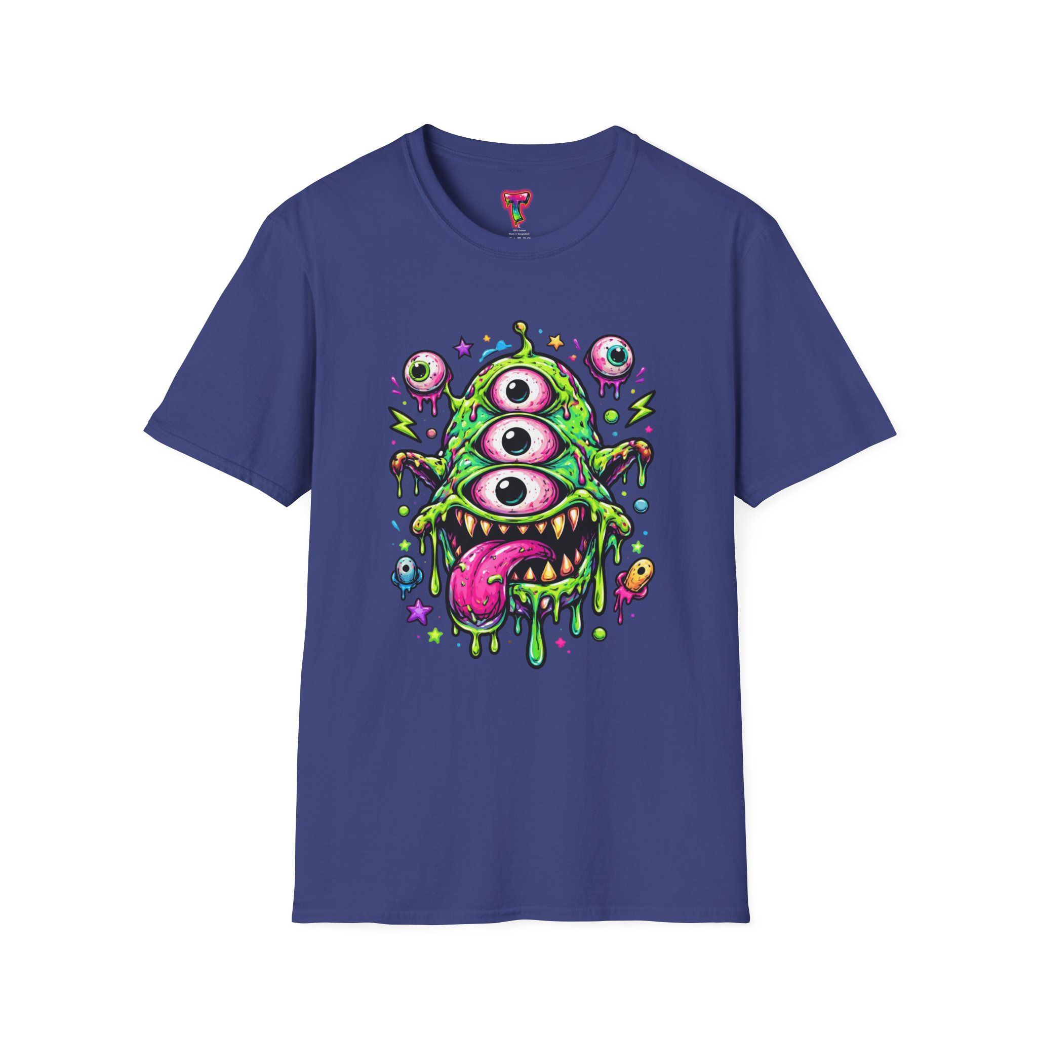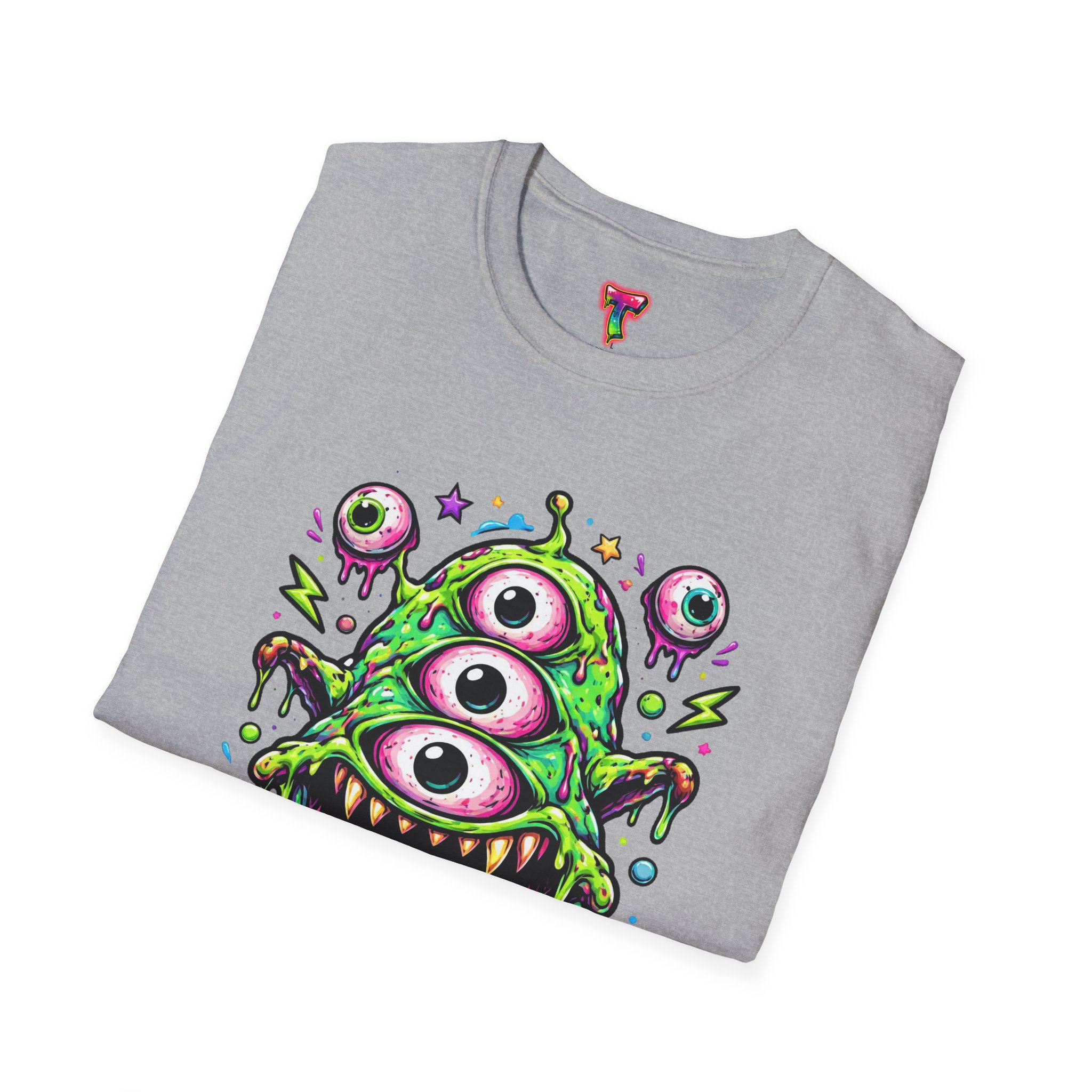 This lightweight cotton tee brings a wild, playful edge to everyday wear. A vivid, dripping three-eyed monster in neon greens and pinks bursts from the chest, its gooey textures and popped-out eyeballs giving the shirt a skate-punk, underground-art vibe. The soft ring-spun cotton feels airy against the skin while the clean crew neckline and classic fit keep the silhouette easy and wearable. Wear it to shows, late-night hangs, or while sketching in the studio — it reads loud without trying too hard and layers smoothly under a flannel or denim jacket.