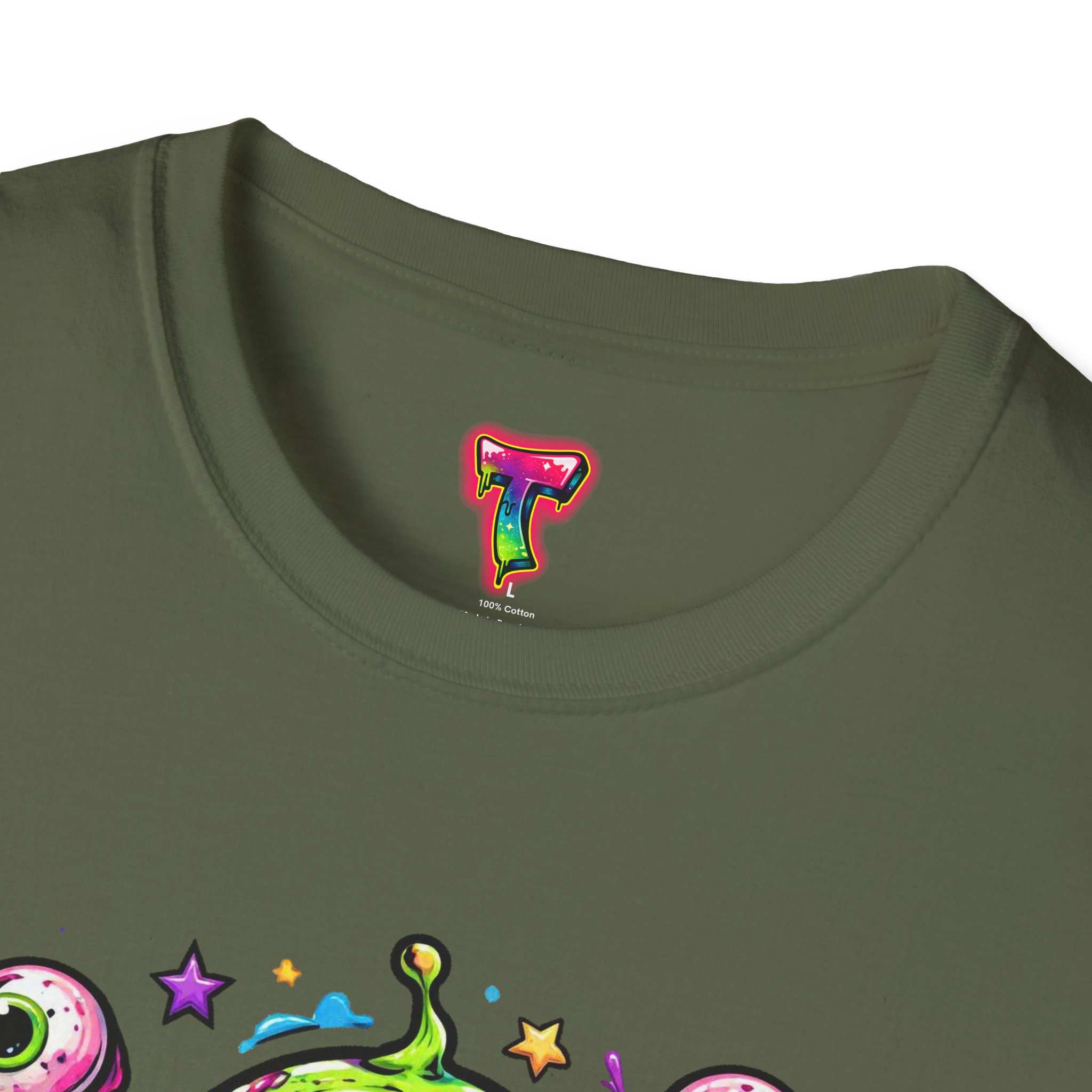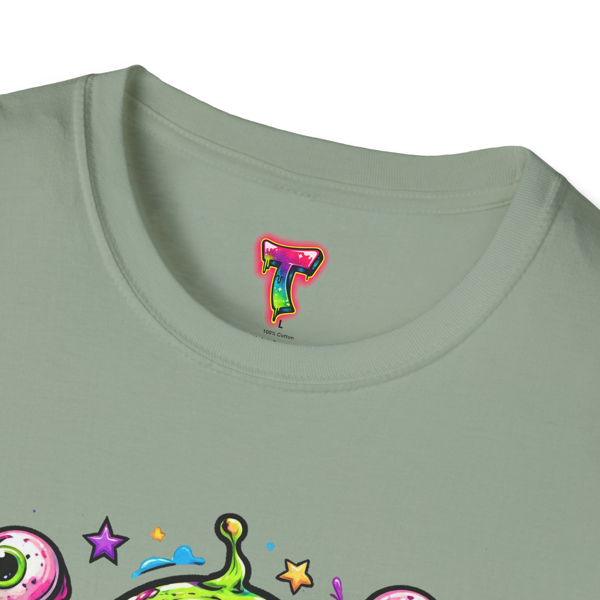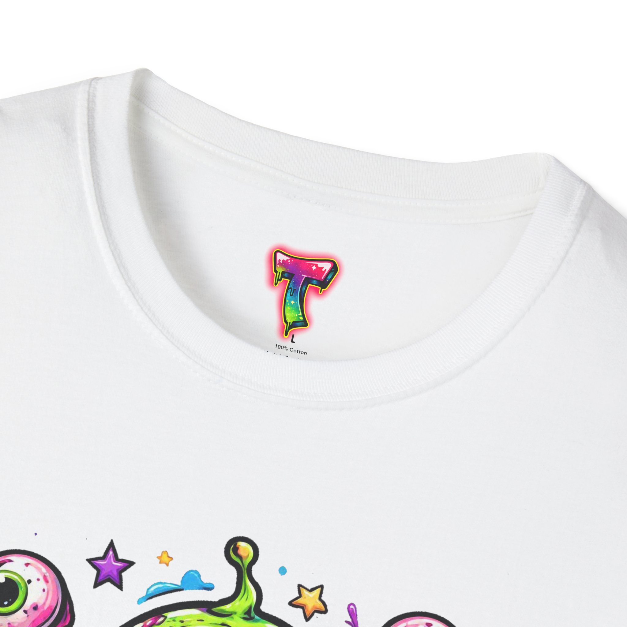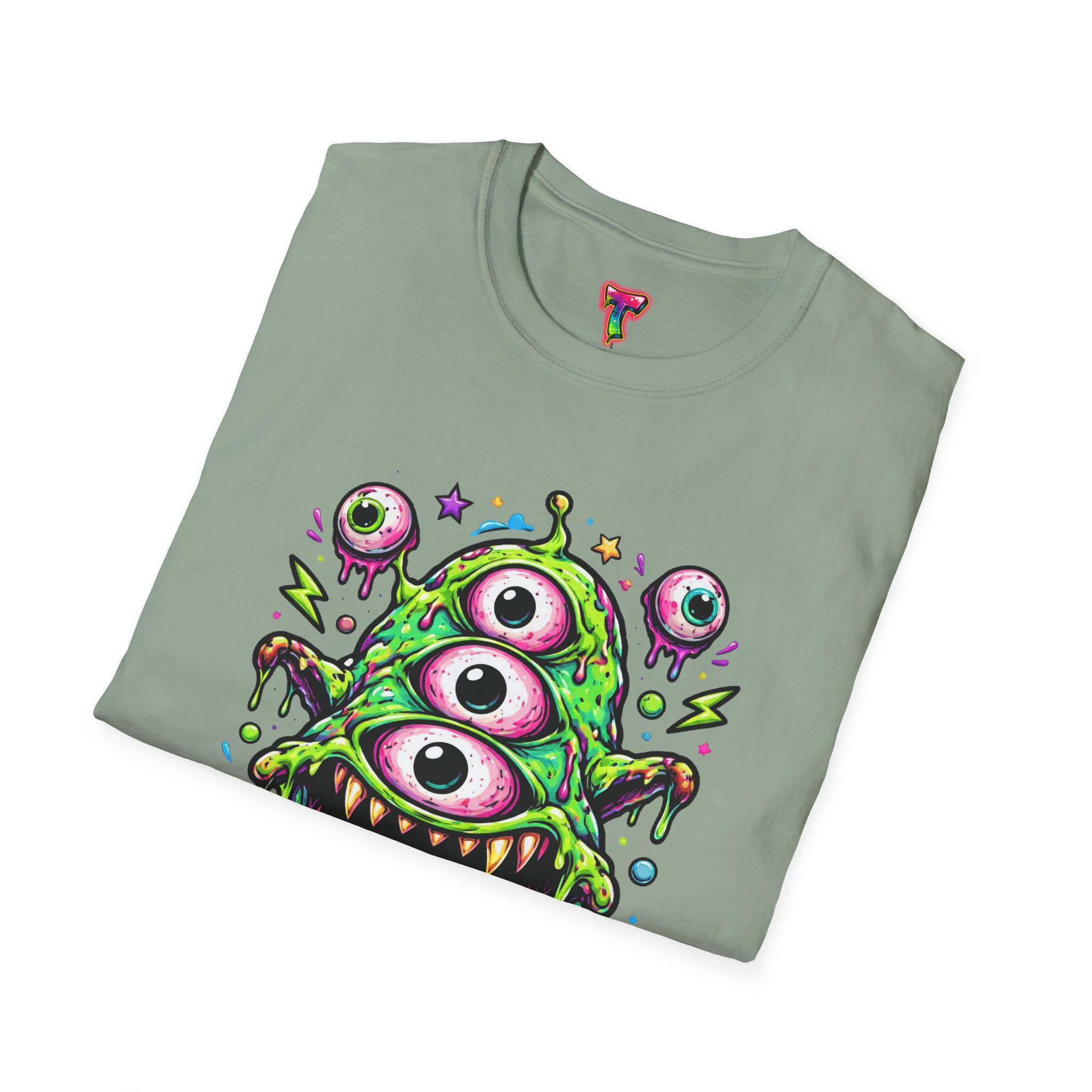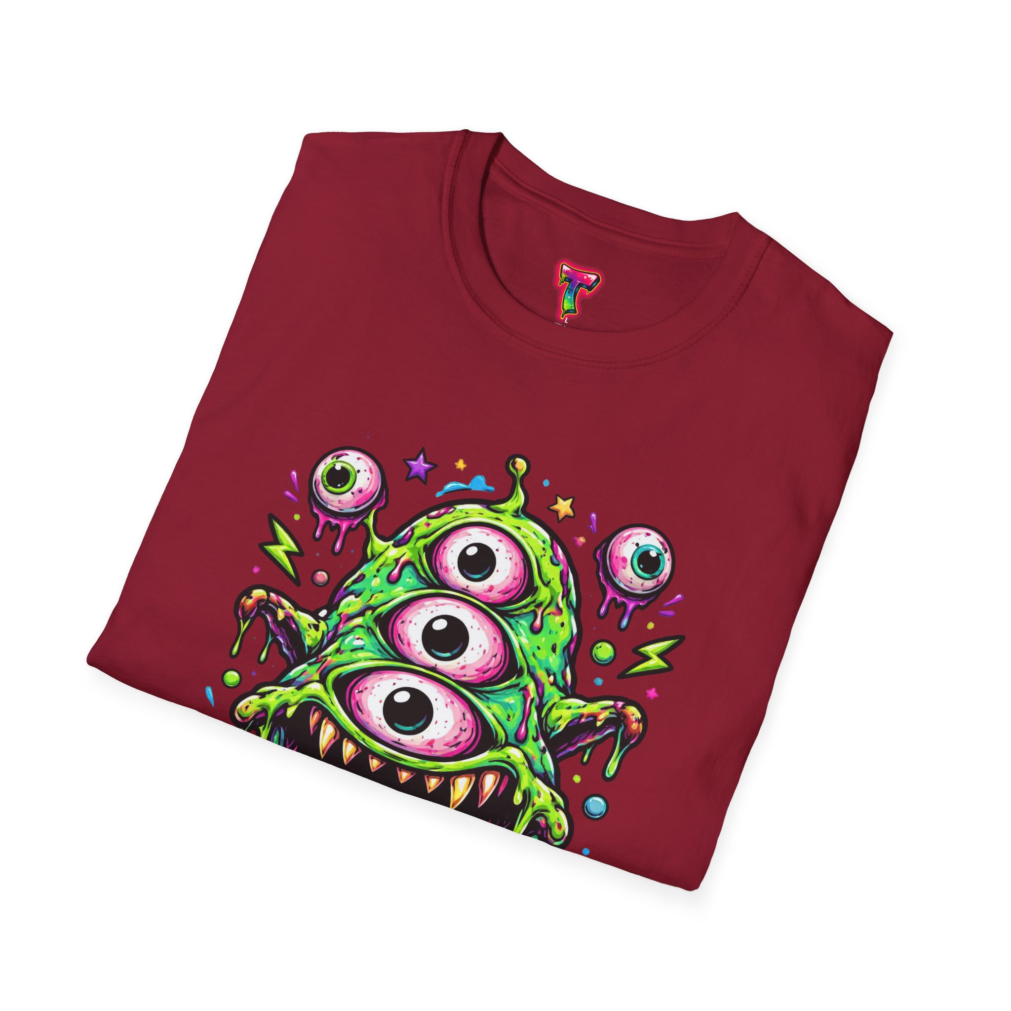This lightweight cotton tee brings a wild, playful edge to everyday wear. A vivid, dripping three-eyed monster in neon greens and pinks bursts from the chest, its gooey textures and popped-out eyeballs giving the shirt a skate-punk, underground-art vibe. The soft ring-spun cotton feels airy against the skin while the clean crew neckline and classic fit keep the silhouette easy and wearable. Wear it to shows, late-night hangs, or while sketching in the studio — it reads loud without trying too hard and layers smoothly under a flannel or denim jacket.