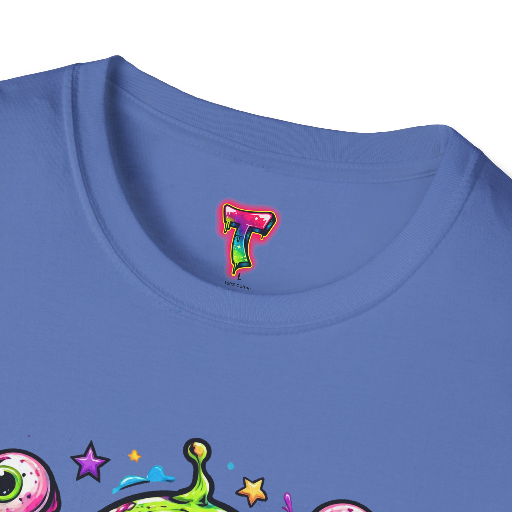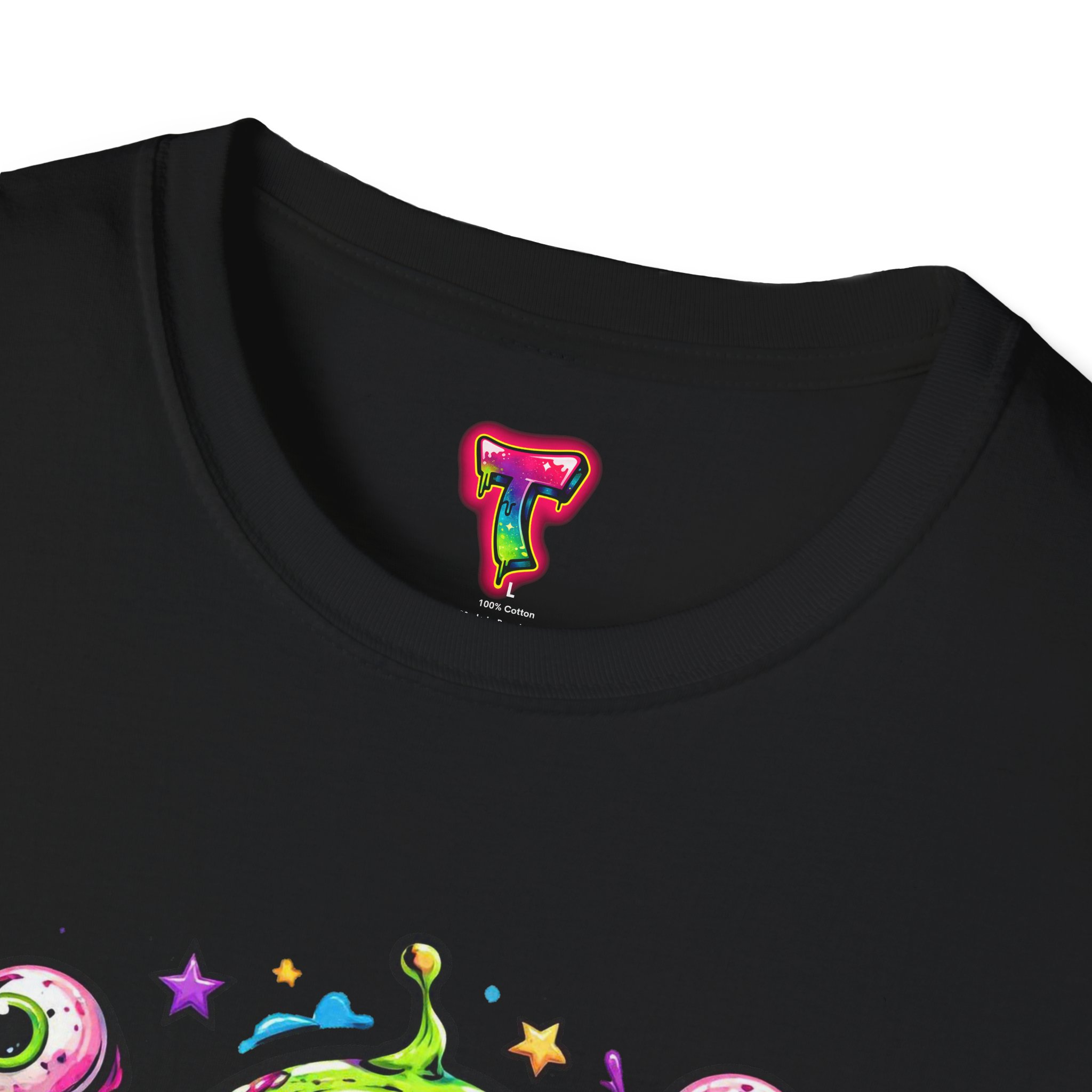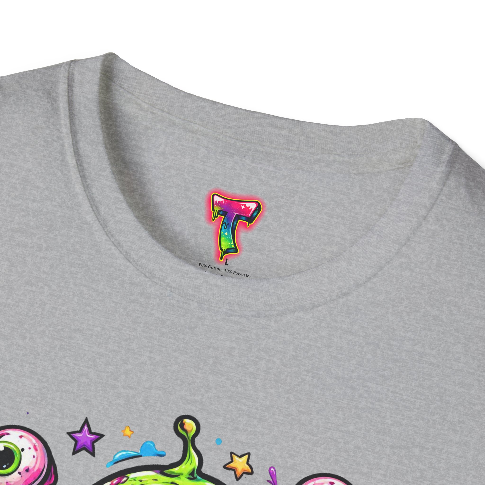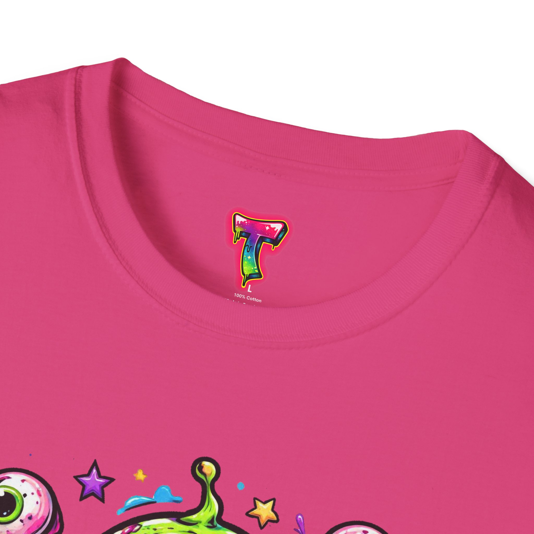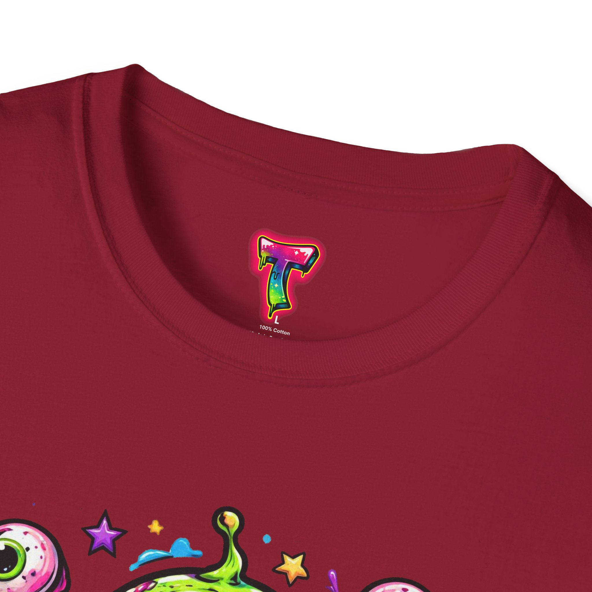 This lightweight cotton tee brings a wild, playful edge to everyday wear. A vivid, dripping three-eyed monster in neon greens and pinks bursts from the chest, its gooey textures and popped-out eyeballs giving the shirt a skate-punk, underground-art vibe. The soft ring-spun cotton feels airy against the skin while the clean crew neckline and classic fit keep the silhouette easy and wearable. Wear it to shows, late-night hangs, or while sketching in the studio — it reads loud without trying too hard and layers smoothly under a flannel or denim jacket.