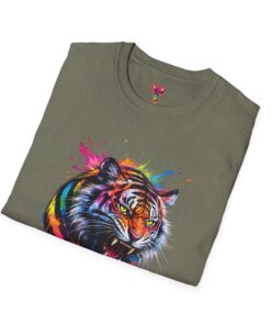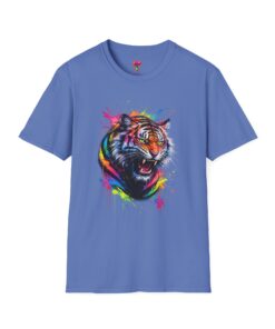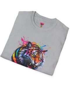 This lightweight crew-neck tee carries a roar — a bold, color-drenched tiger portrait splashed across a clean white canvas. The soft, ring-spun cotton feels gentle against skin while the tubular knit and taped shoulders keep the shape steady through repeated wear. The artwork’s energetic brushstrokes and paint-splatter accents read like street-art on fabric, bringing an urban, creative edge to everyday outfits. Wear it layered under a denim jacket for city nights or alone on warm afternoons; it’s built to move with you and to keep the design front and center. Ethically grown cotton, a tear-away label, and careful print methods mean the shirt looks great and wears comfortably for seasons to come.