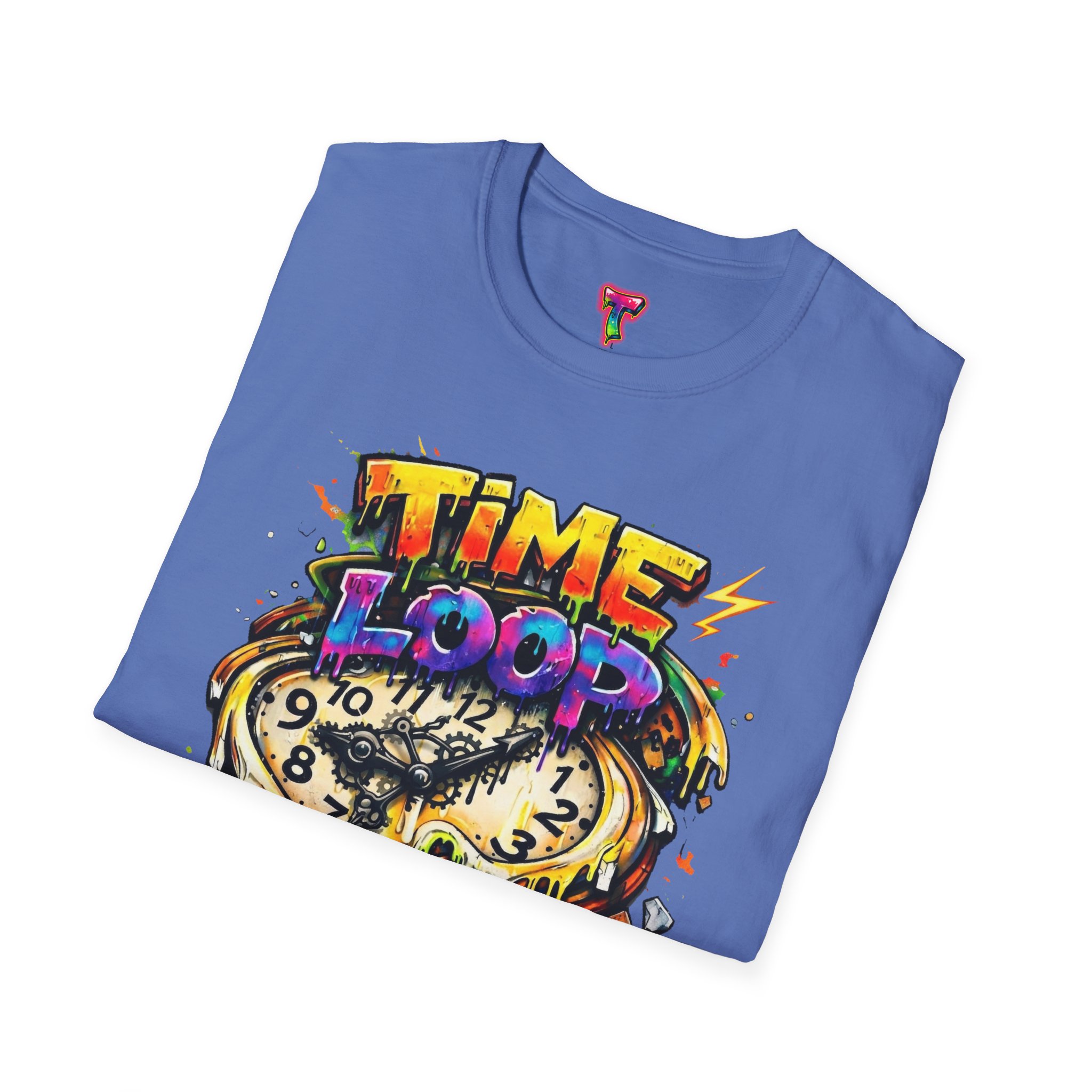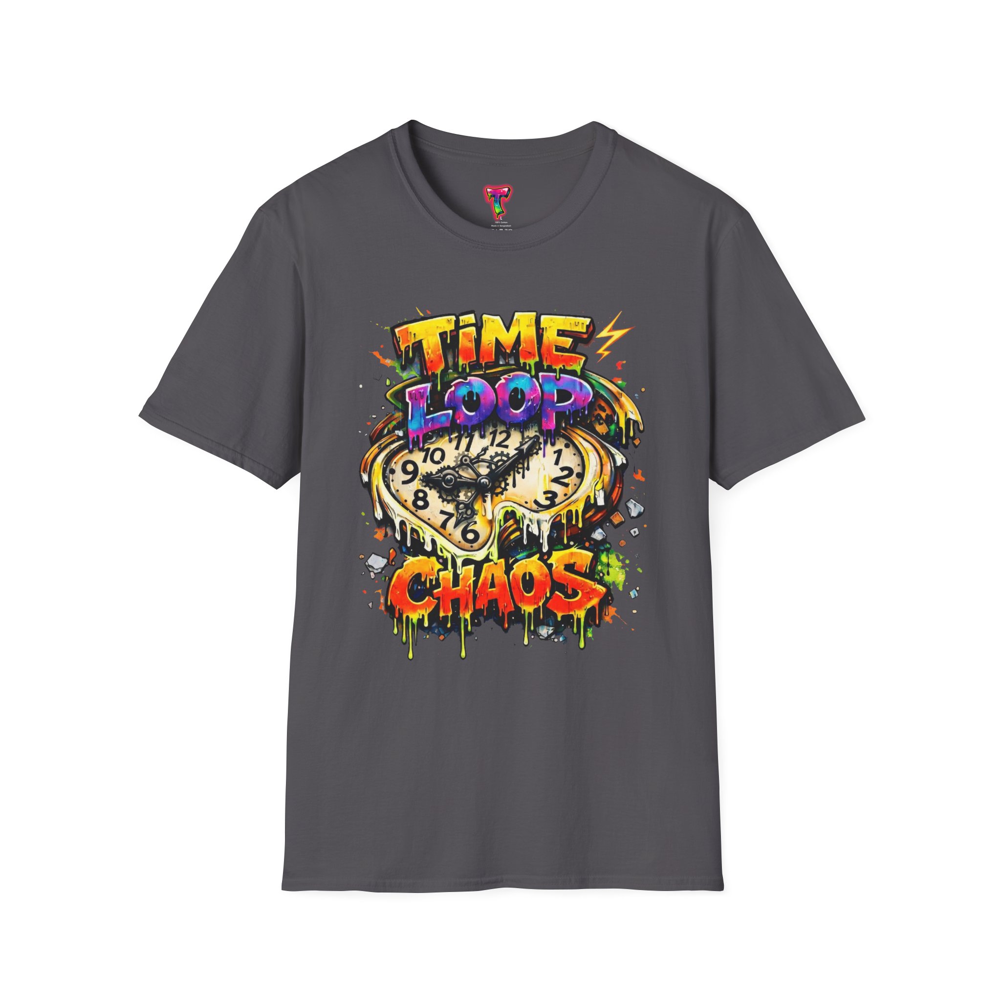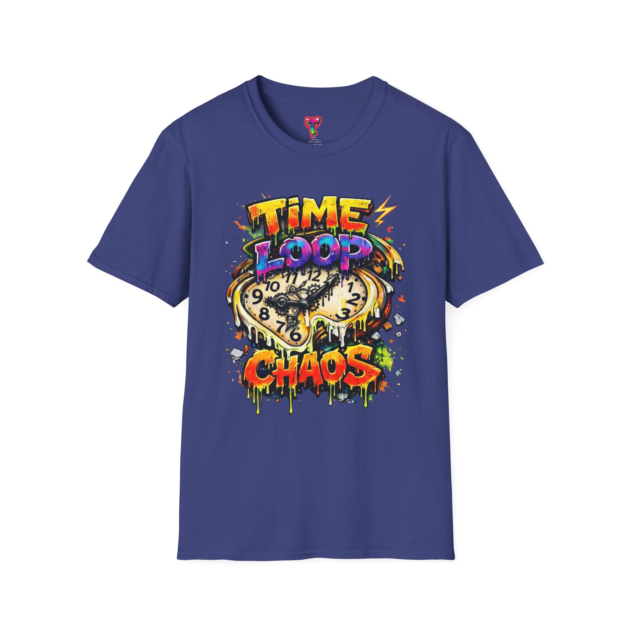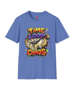 Wearable energy for days that blur into one another. This lightweight tee carries a bright, graffiti-style graphic of a melting clock and the words “TIME LOOP CHAOS,” a chaotic-but-playful design that nods to late nights, binge sessions, and time-bending adventures. The soft ring-spun cotton feels airy against skin, while the clean crew neck and classic fit keep the silhouette casual and easy to layer. Let this shirt be the loud, colorful anchor in a relaxed outfit — a conversation starter when stories get wild and schedules break down.