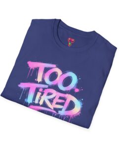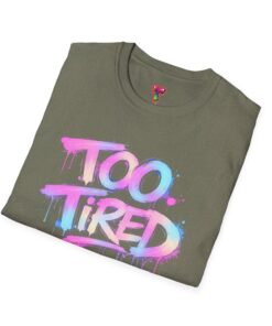 Soft, breathable, and built for everyday wear — this lightweight crew tee carries a hand-painted street-art graphic that reads “Too Tired” in dripping pastel spray. The cotton knit feels smooth against the skin and holds prints crisply, while the ribbed collar and shoulder tape keep the silhouette neat after many washes. Wear it on slow mornings, late studio nights, or when you want to make a playful, honest statement about your mood. The muted watercolor tones sit comfortably against the white fabric, giving a casual, artful look that layers effortlessly under jackets or stands on its own.