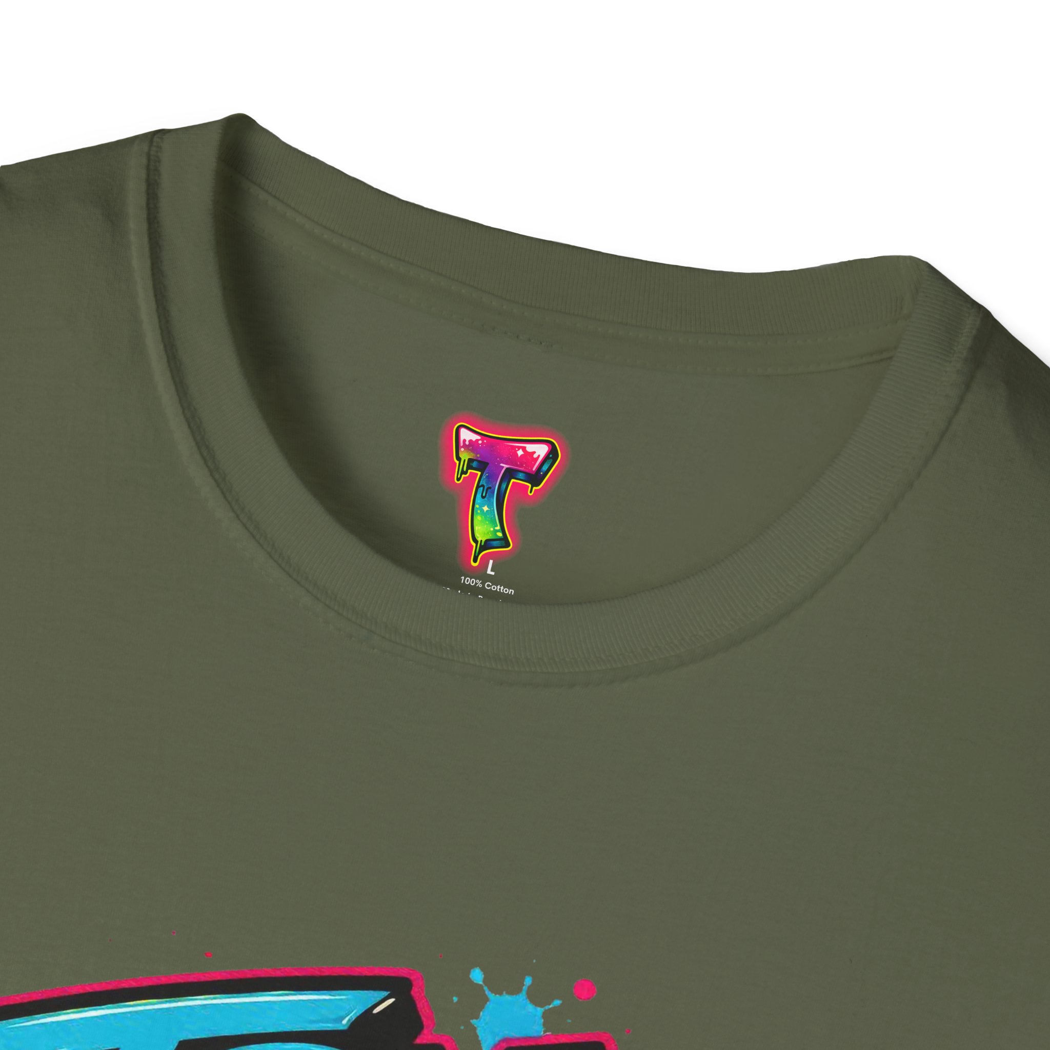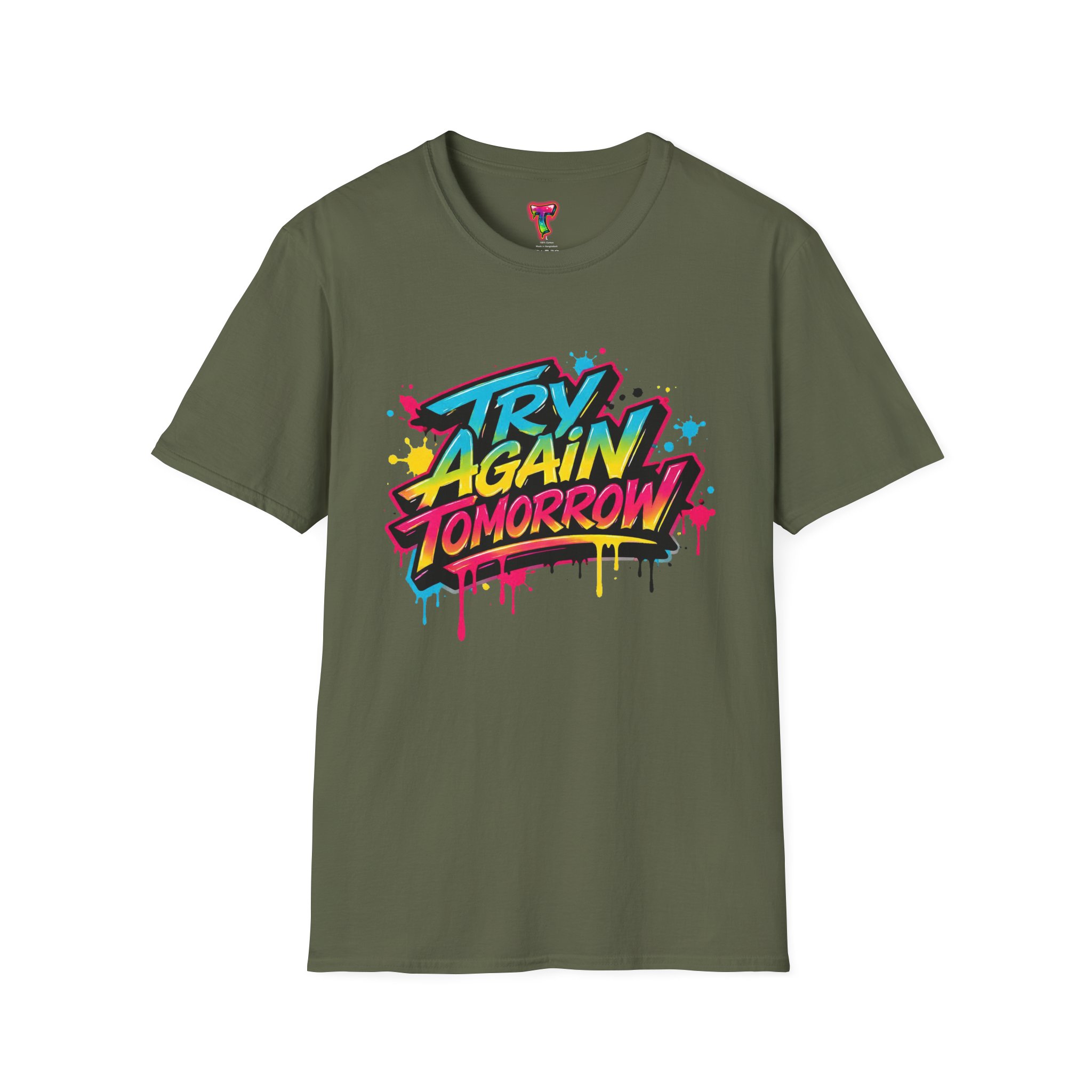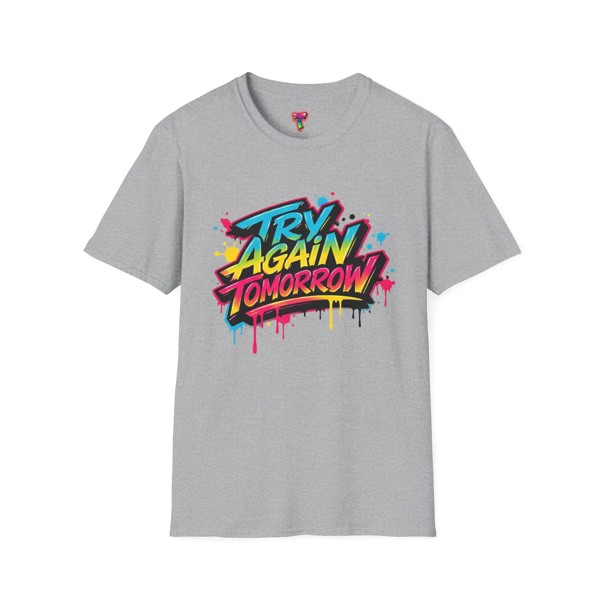 This lightweight cotton tee wears like a laid-back attitude. A bold, graffiti-style graphic — splattered paint, neon tones and dripping accents — sits at the chest, striking a playful, defiant note: it reads like a street mural you’d find between late-night skate sessions and morning coffee runs. The classic crew cut and clean silhouette keep the look casual and wearable, while the soft ring-spun cotton feels comfortable all day. Wear it over denim or layered under an open shirt to let the print do the talking. It’s the kind of shirt that swaps pressure for humor and reminds the wearer to breathe, laugh, and show up tomorrow.