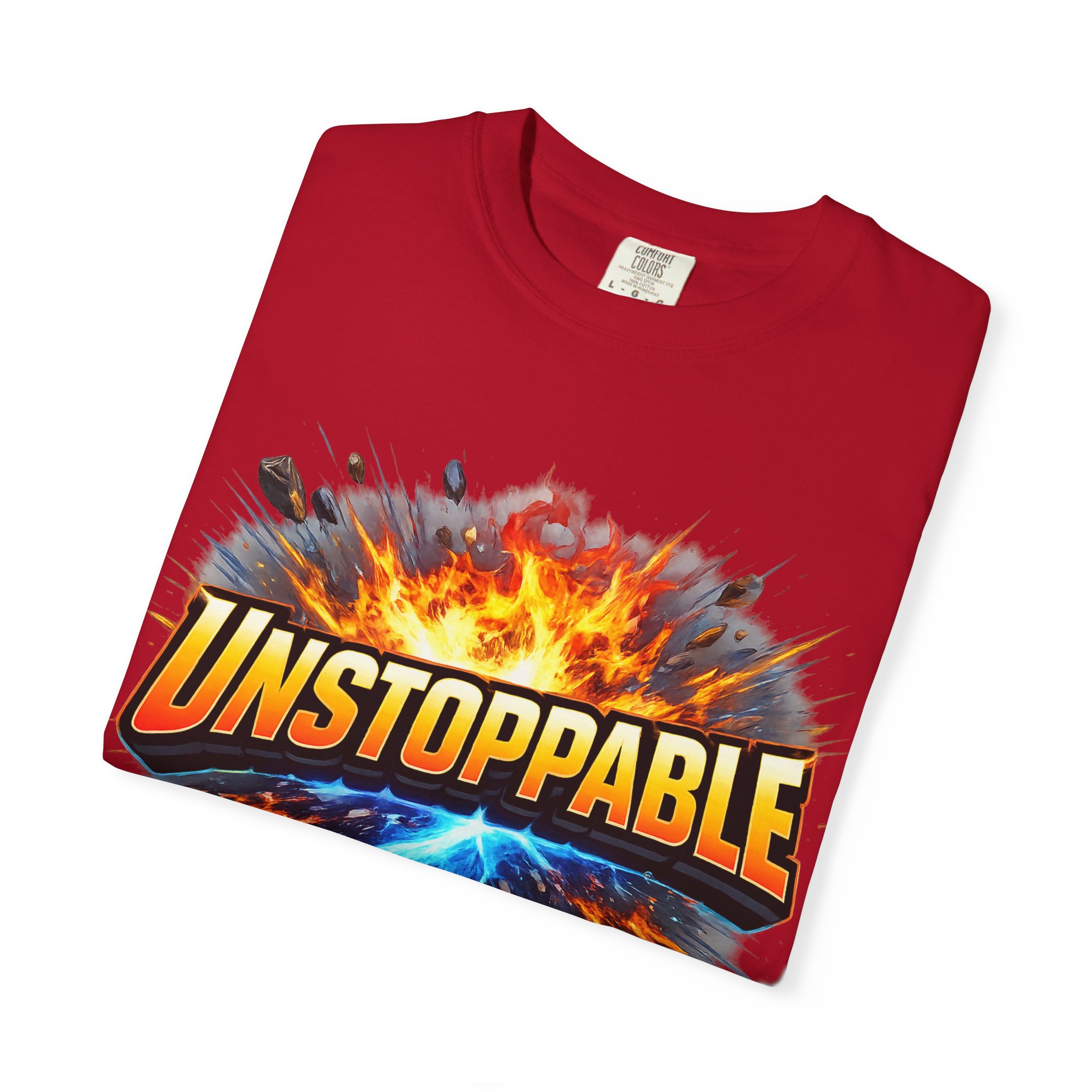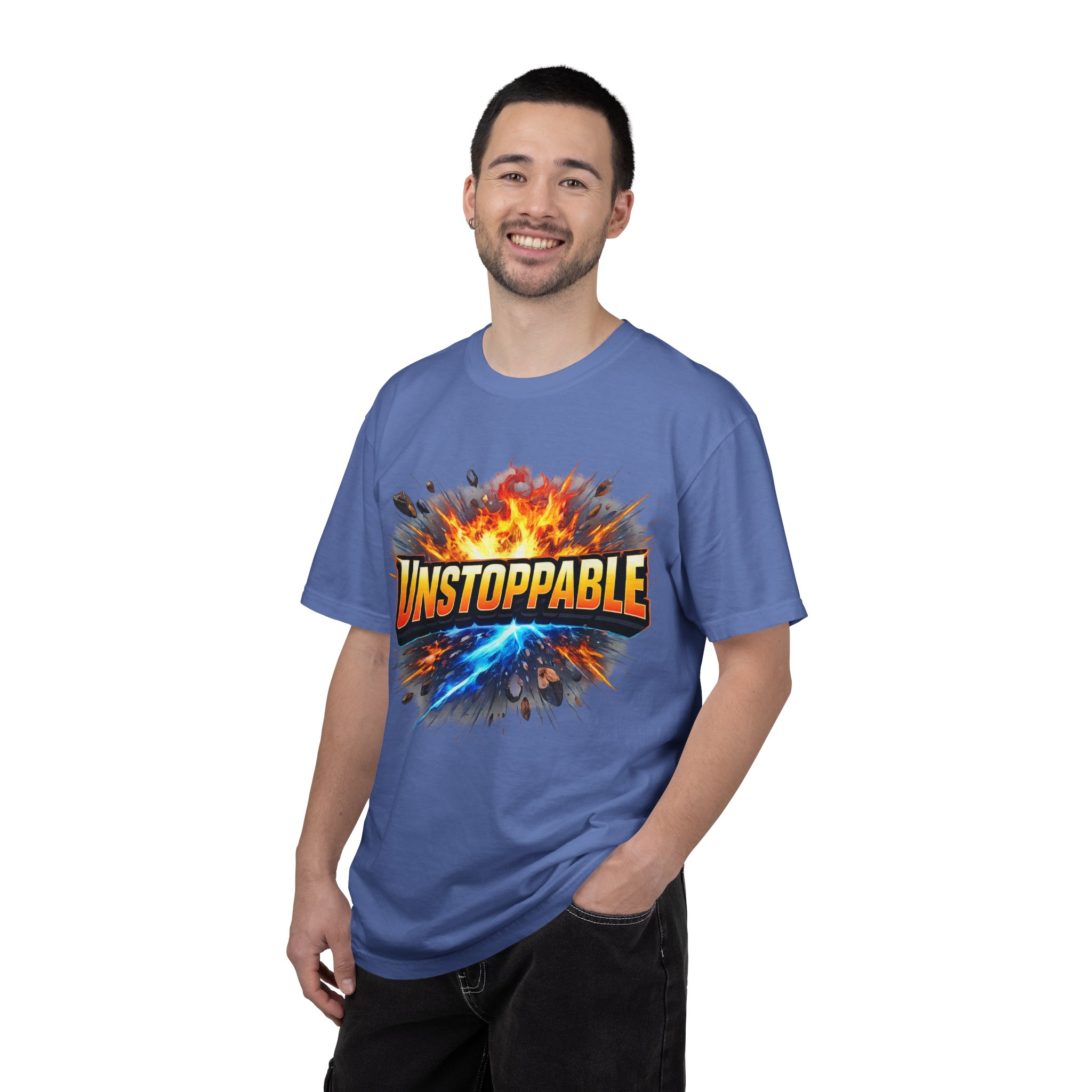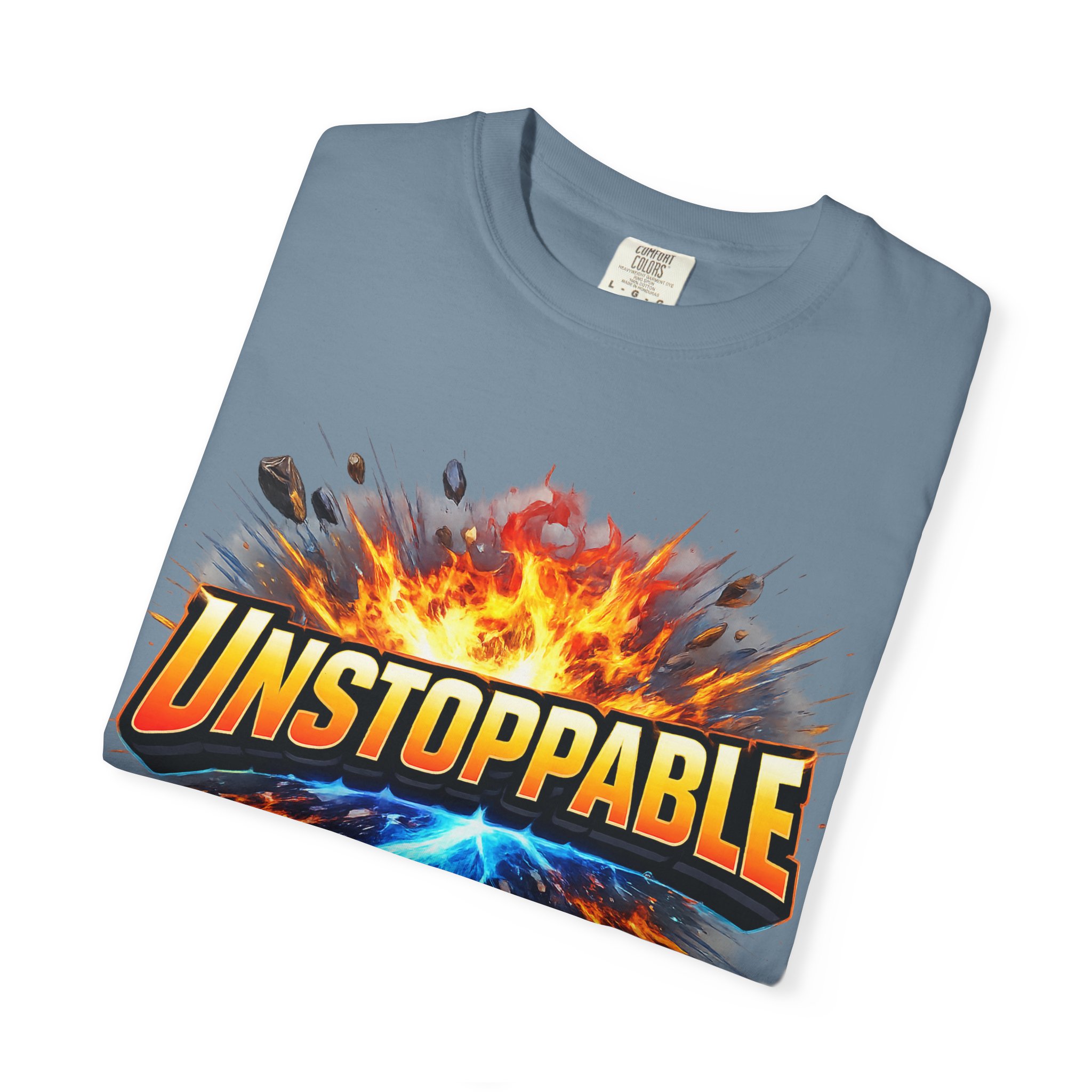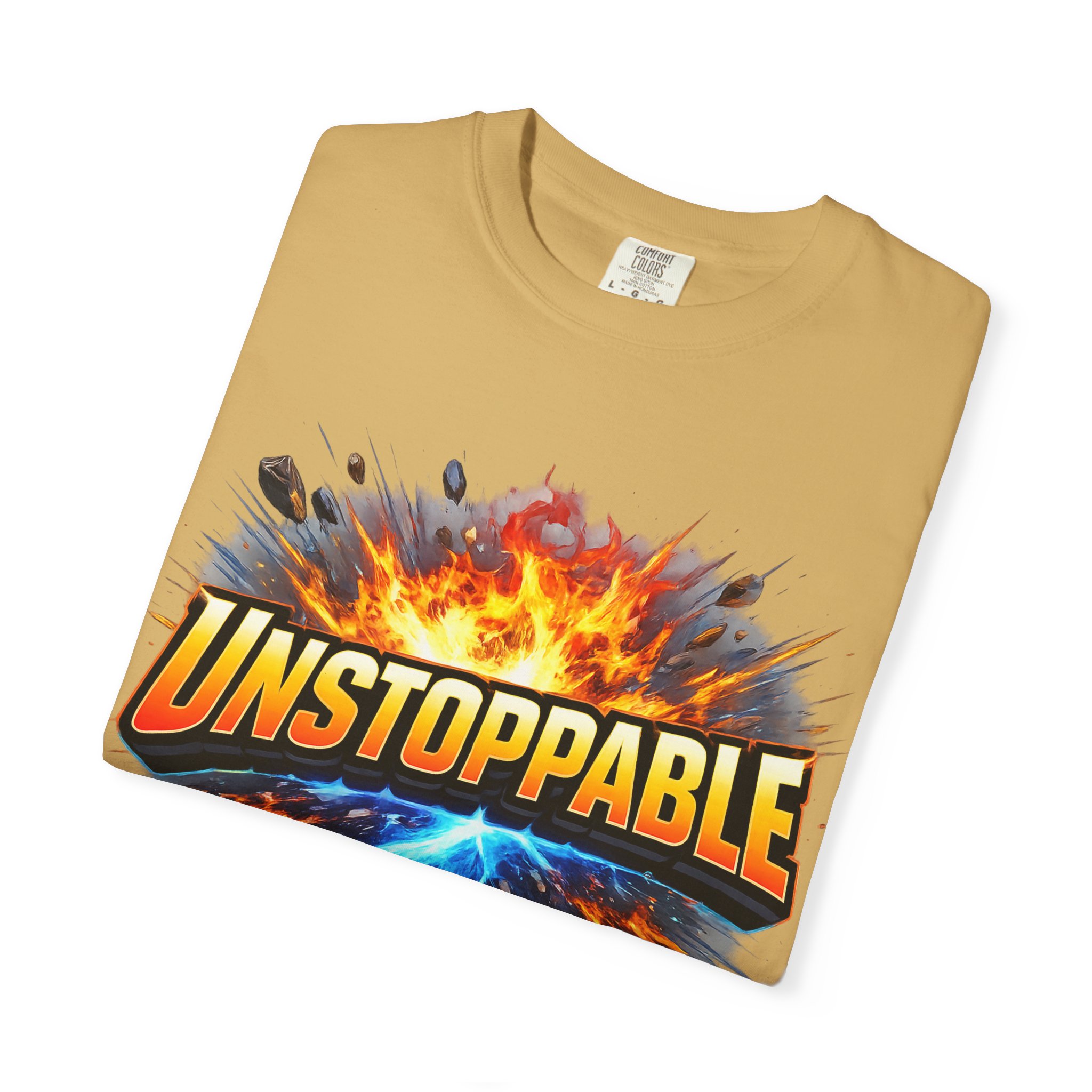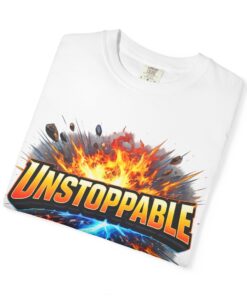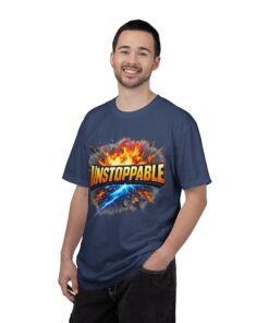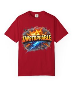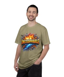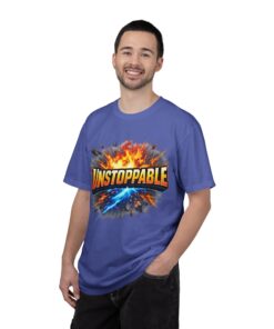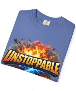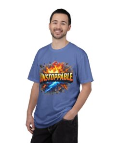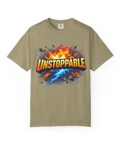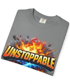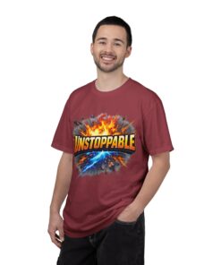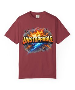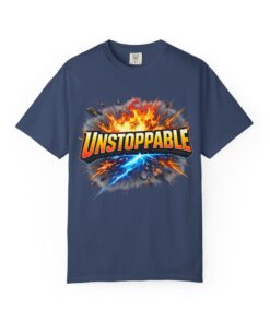 Lightweight but substantial, this garment-dyed tee carries a bold burst of energy across the chest — a graphic that reads “UNSTOPPABLE” set against a collision of fire and electric blue that feels like motion you can hear. The heavy-weight 100% ring-spun cotton softens with wear and the garment-dyed finish gives the color and texture a lived-in, vintage feel. Cut for a relaxed fit with durable double-needle stitching and a tubular knit that eliminates side seams, this shirt sits comfortably through long days of training, travel, or simply living loud. Wear it when you need that extra push — to the gym, on a road trip, or the day you decide to chase something big.