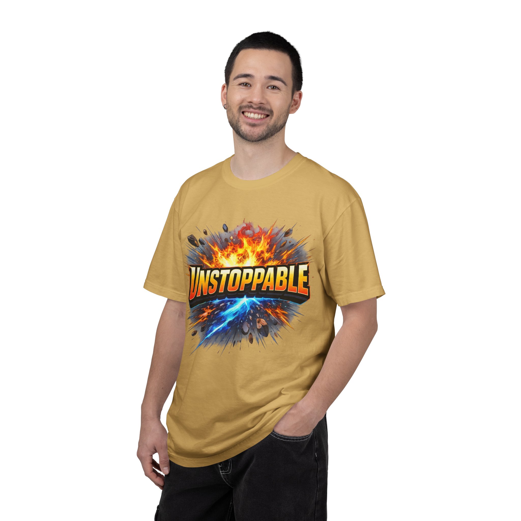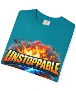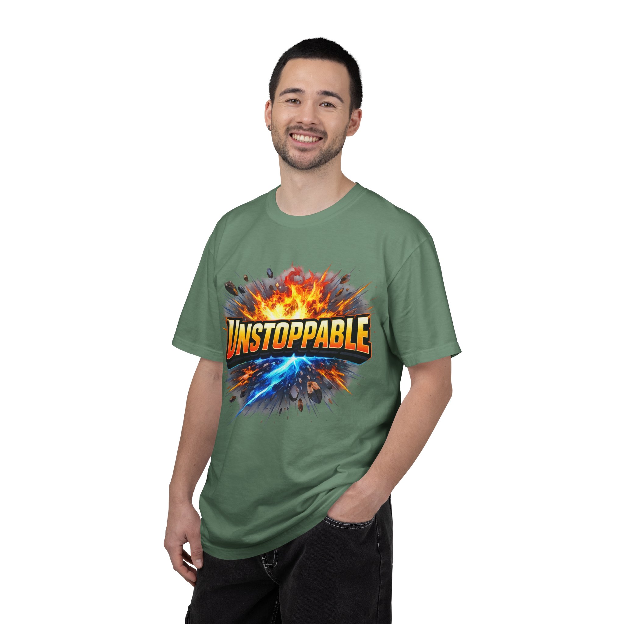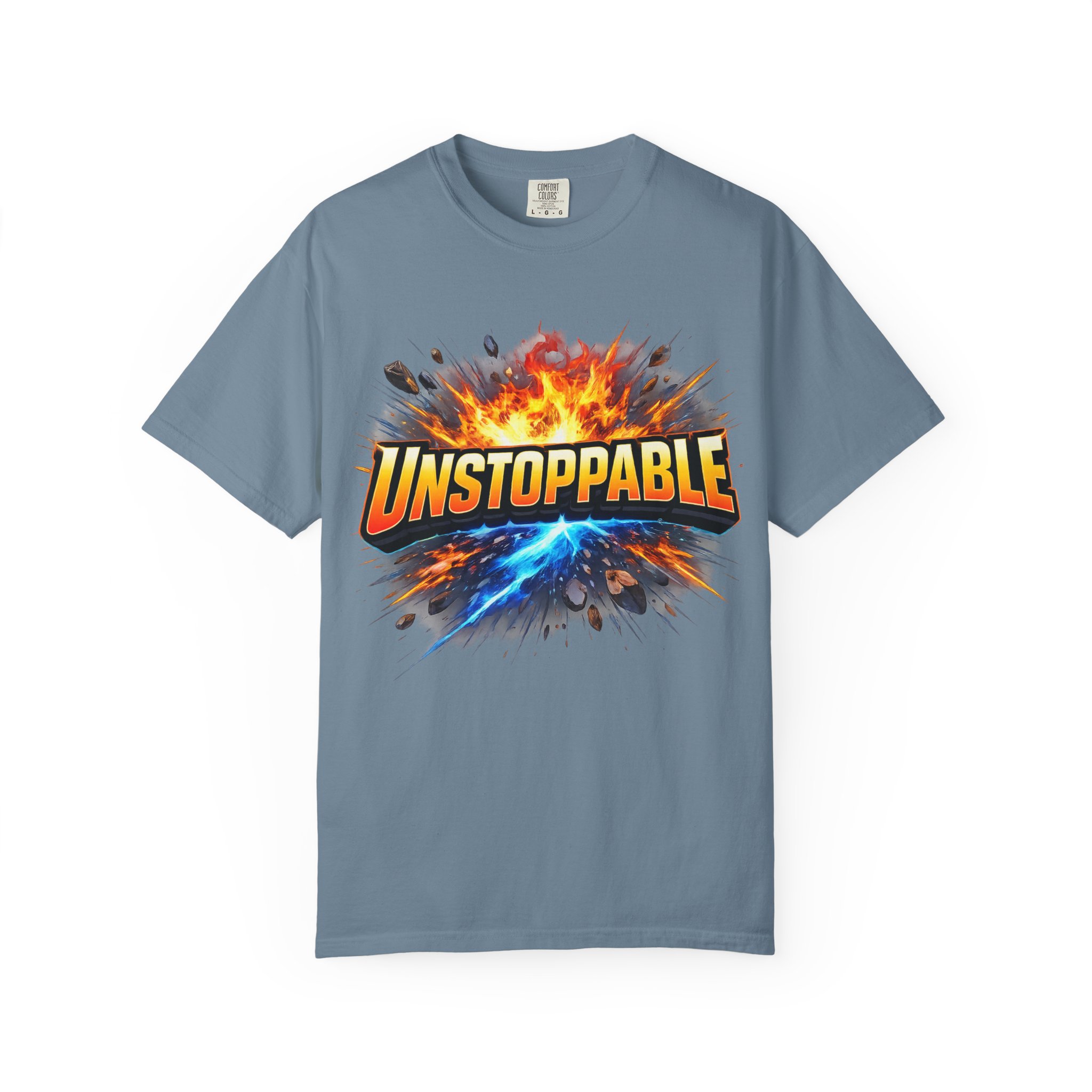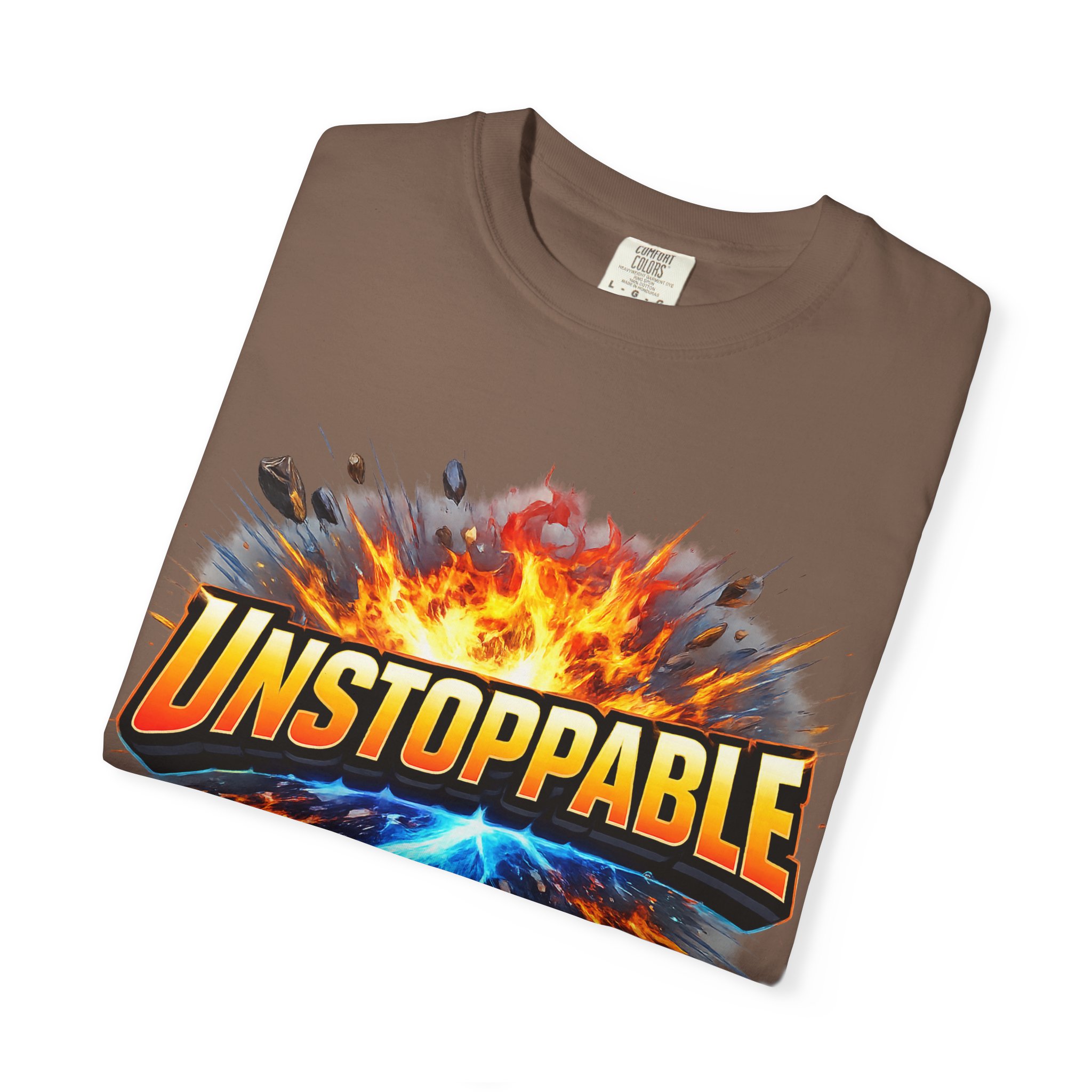 Lightweight but substantial, this garment-dyed tee carries a bold burst of energy across the chest — a graphic that reads “UNSTOPPABLE” set against a collision of fire and electric blue that feels like motion you can hear. The heavy-weight 100% ring-spun cotton softens with wear and the garment-dyed finish gives the color and texture a lived-in, vintage feel. Cut for a relaxed fit with durable double-needle stitching and a tubular knit that eliminates side seams, this shirt sits comfortably through long days of training, travel, or simply living loud. Wear it when you need that extra push — to the gym, on a road trip, or the day you decide to chase something big.