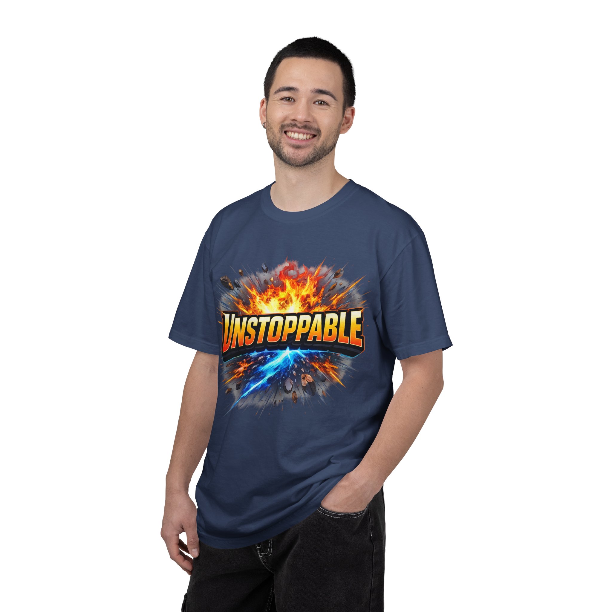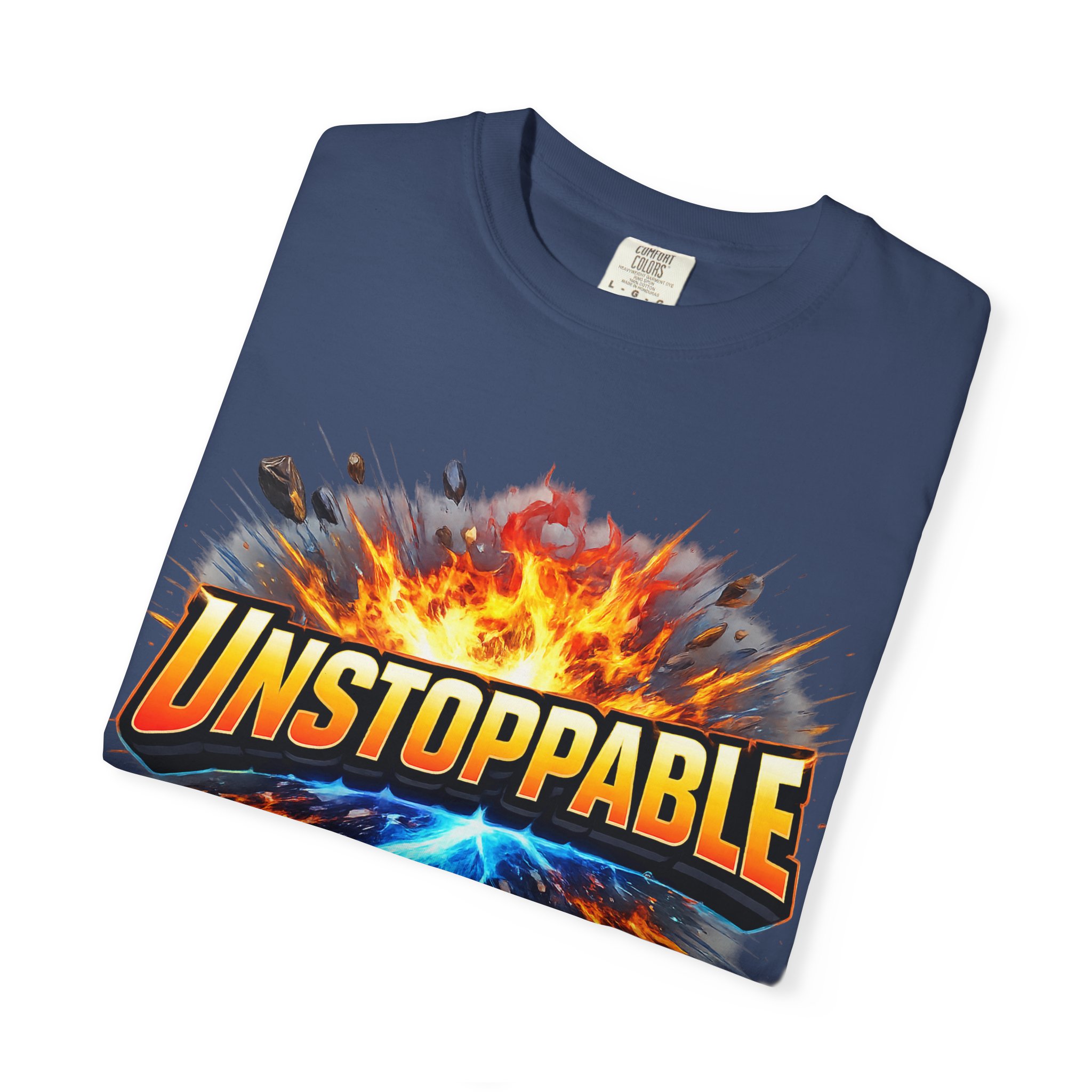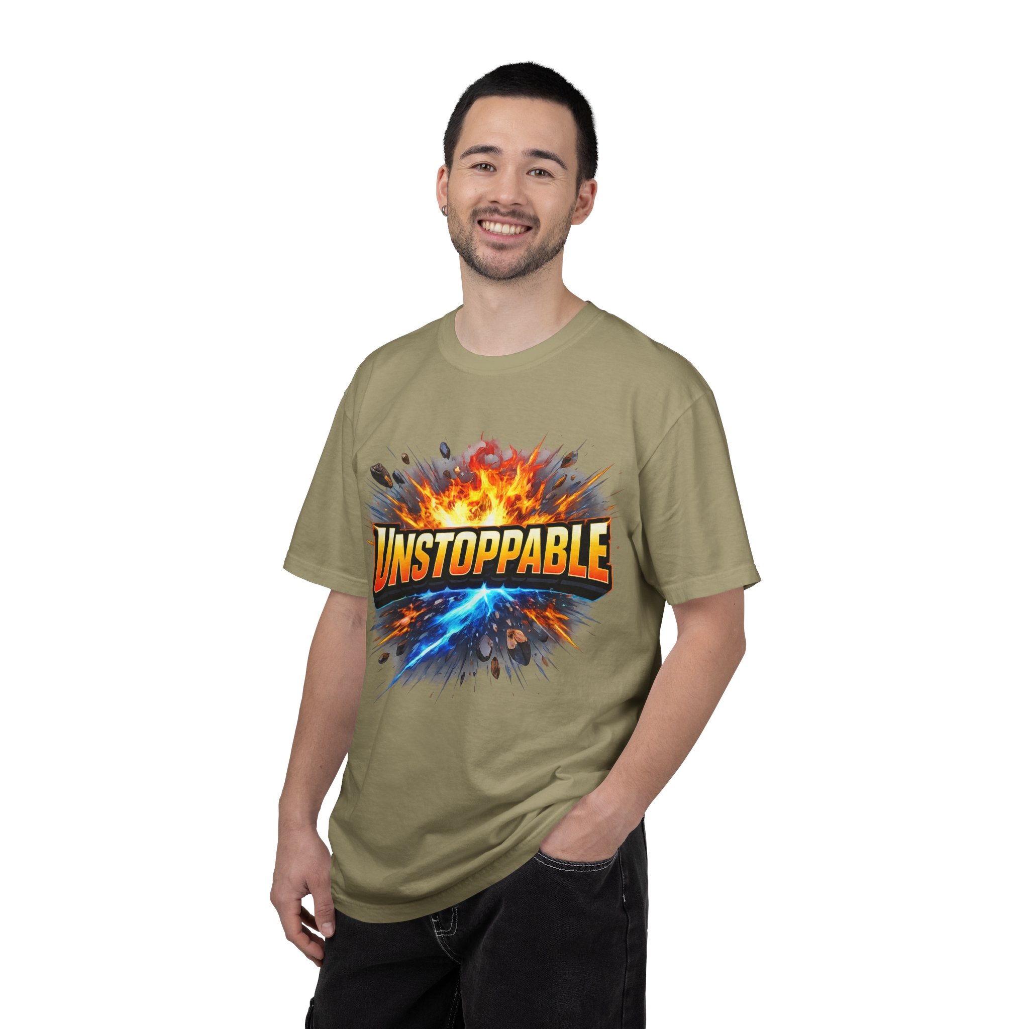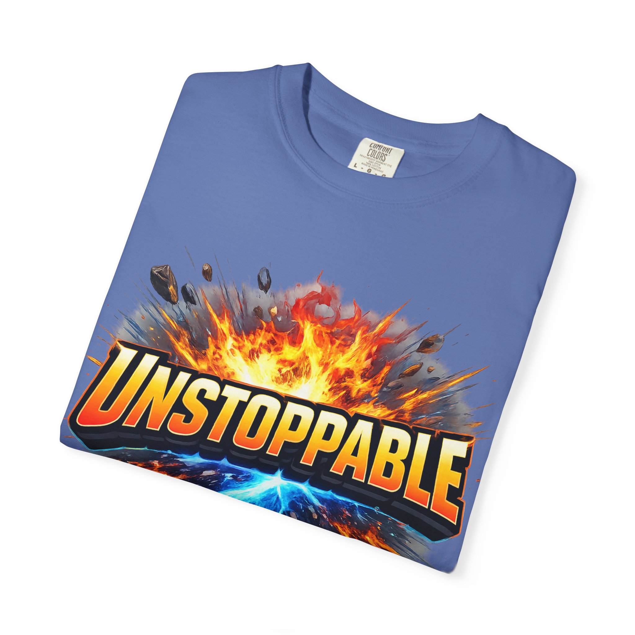 Lightweight but substantial, this garment-dyed tee carries a bold burst of energy across the chest — a graphic that reads “UNSTOPPABLE” set against a collision of fire and electric blue that feels like motion you can hear. The heavy-weight 100% ring-spun cotton softens with wear and the garment-dyed finish gives the color and texture a lived-in, vintage feel. Cut for a relaxed fit with durable double-needle stitching and a tubular knit that eliminates side seams, this shirt sits comfortably through long days of training, travel, or simply living loud. Wear it when you need that extra push — to the gym, on a road trip, or the day you decide to chase something big.