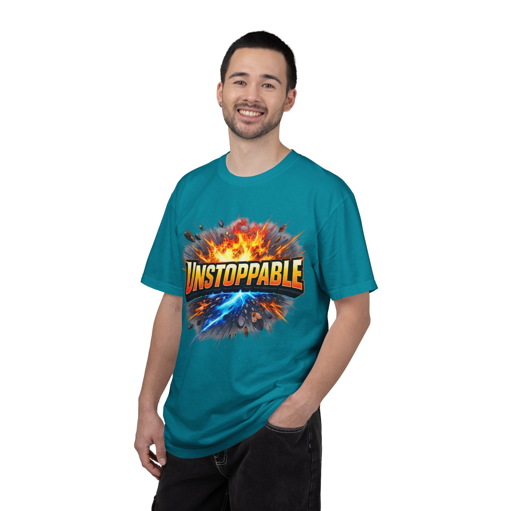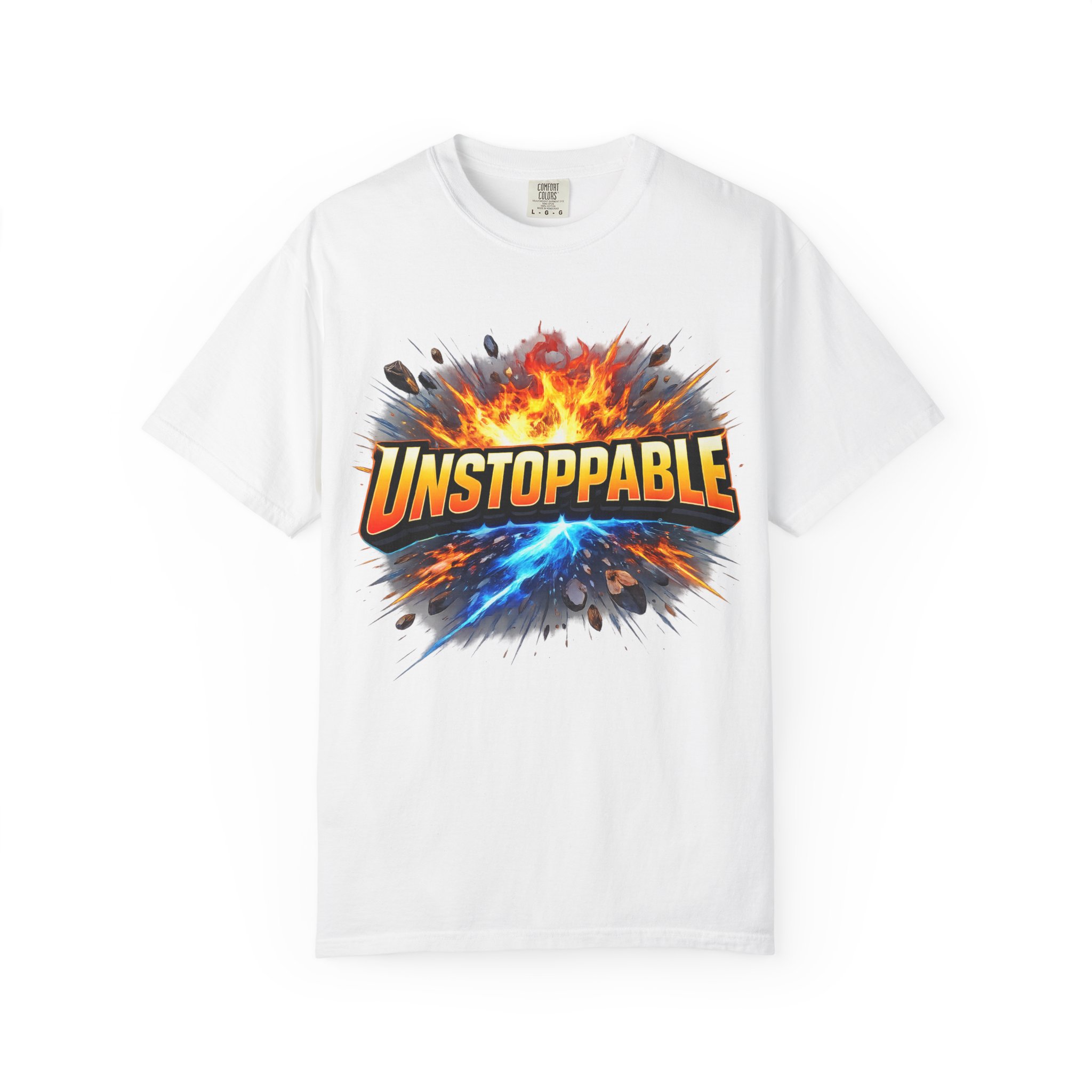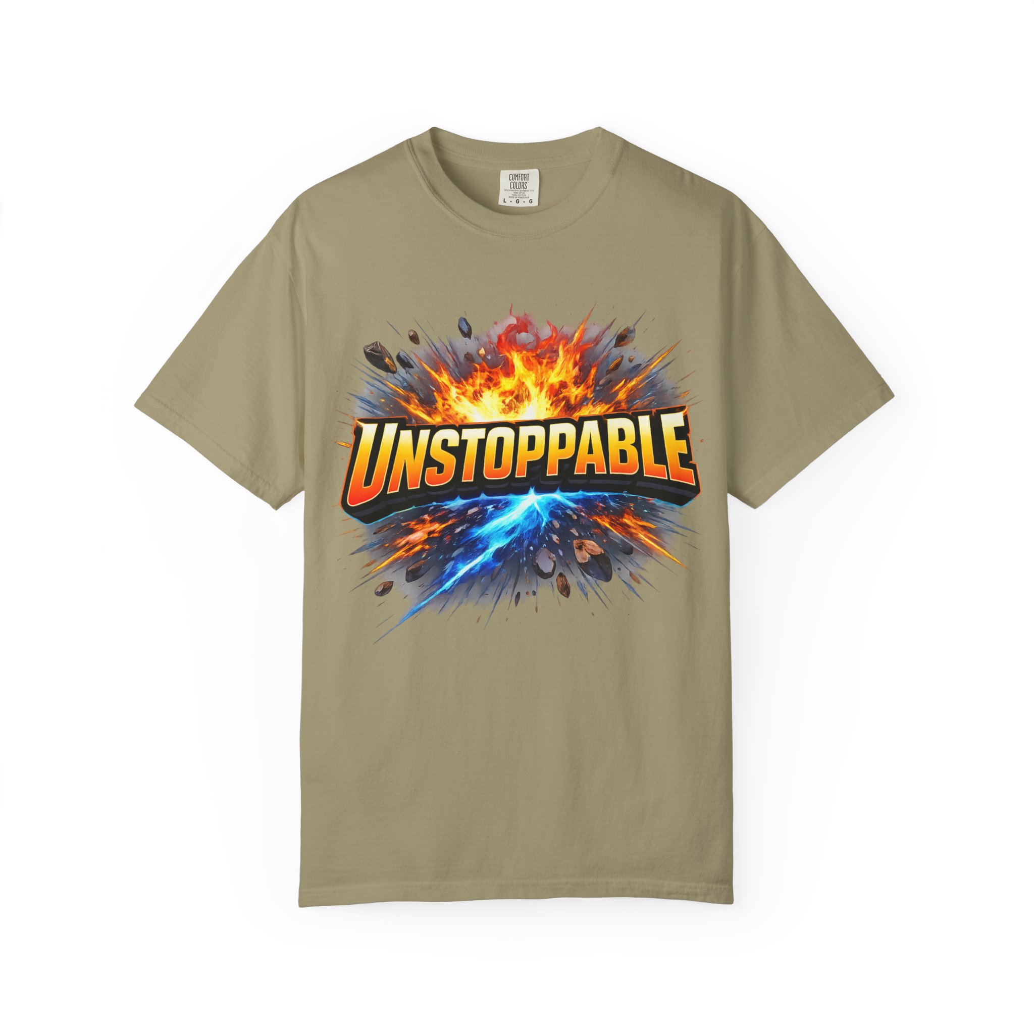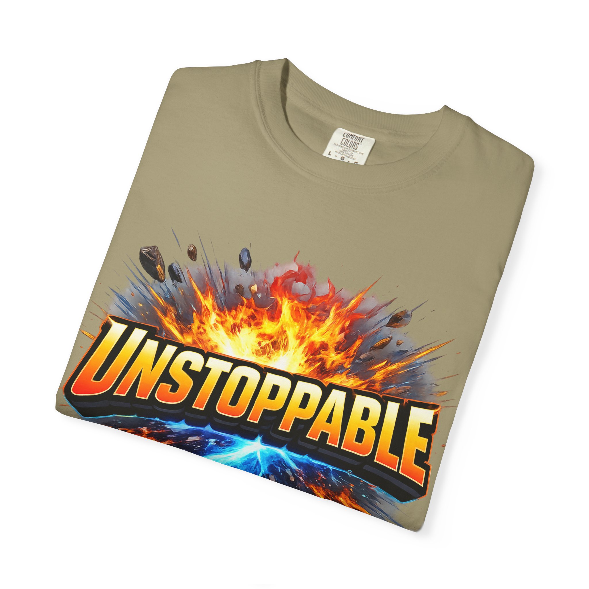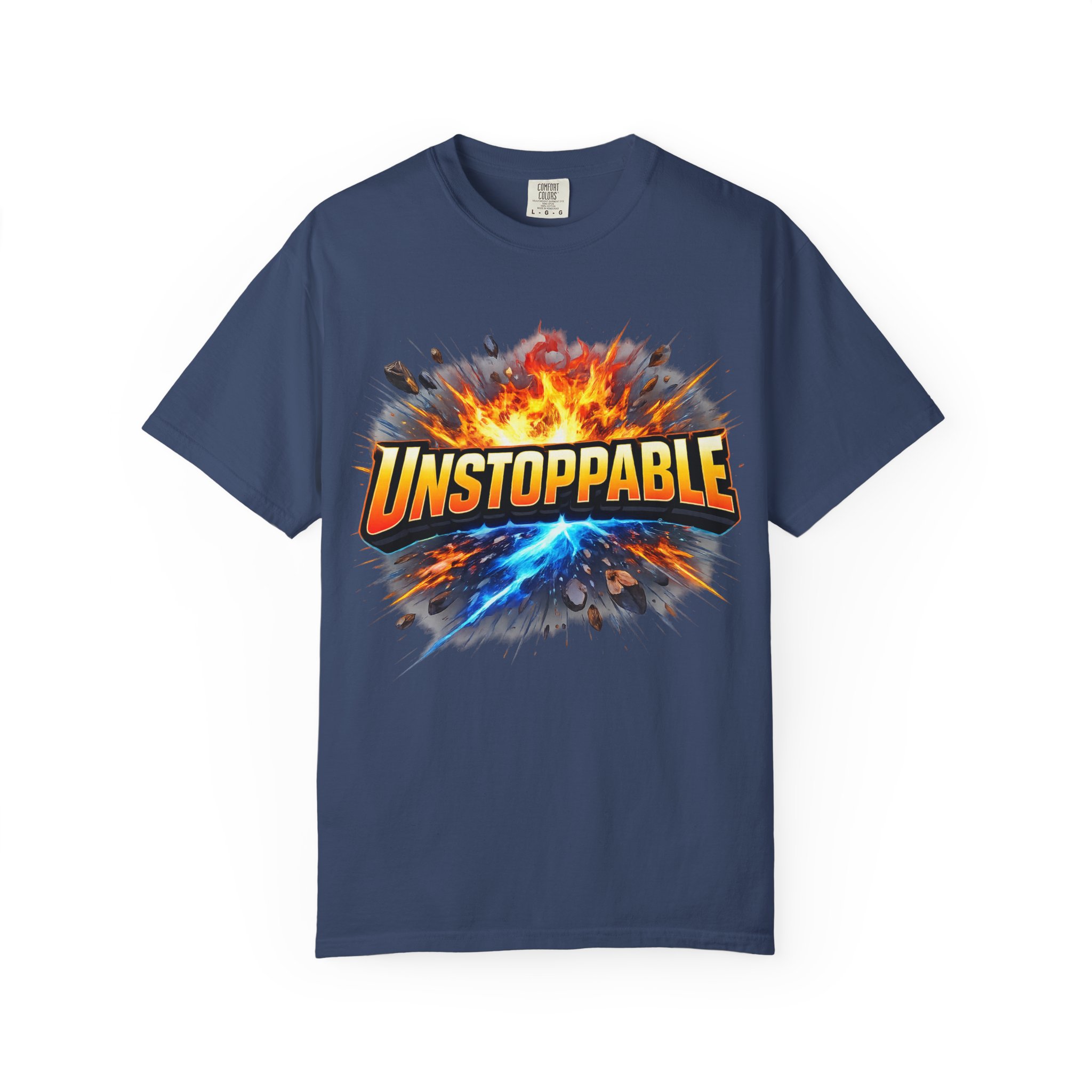 Lightweight but substantial, this garment-dyed tee carries a bold burst of energy across the chest — a graphic that reads “UNSTOPPABLE” set against a collision of fire and electric blue that feels like motion you can hear. The heavy-weight 100% ring-spun cotton softens with wear and the garment-dyed finish gives the color and texture a lived-in, vintage feel. Cut for a relaxed fit with durable double-needle stitching and a tubular knit that eliminates side seams, this shirt sits comfortably through long days of training, travel, or simply living loud. Wear it when you need that extra push — to the gym, on a road trip, or the day you decide to chase something big.