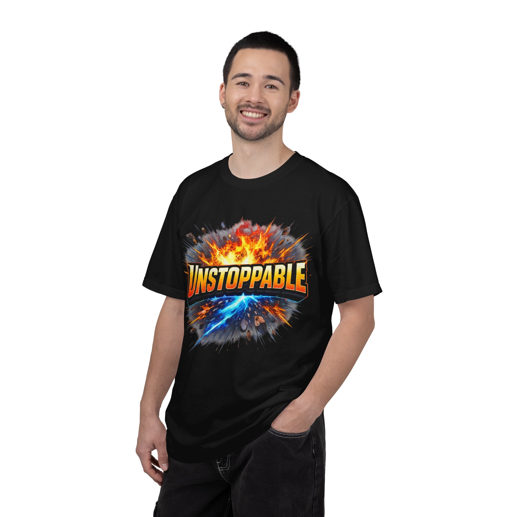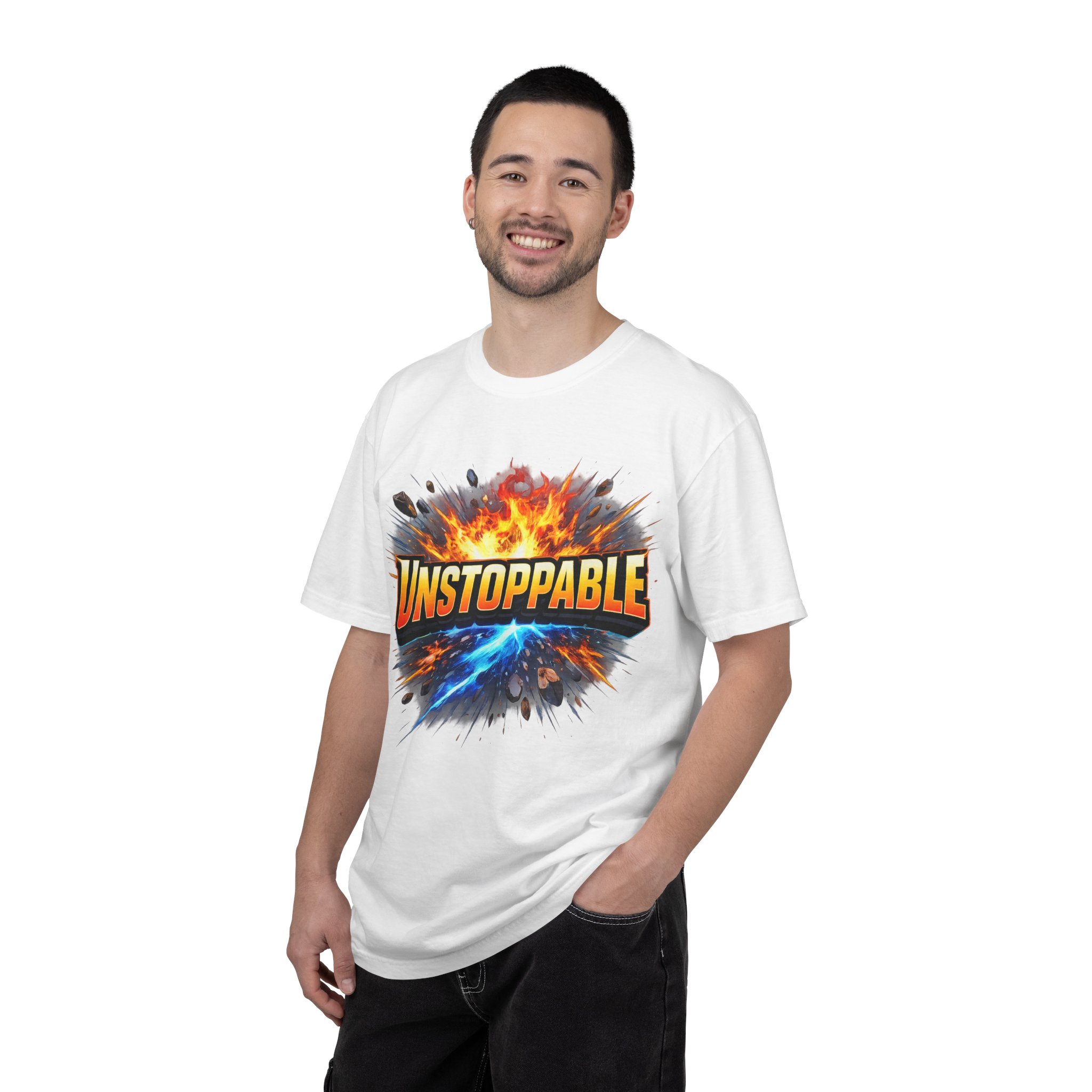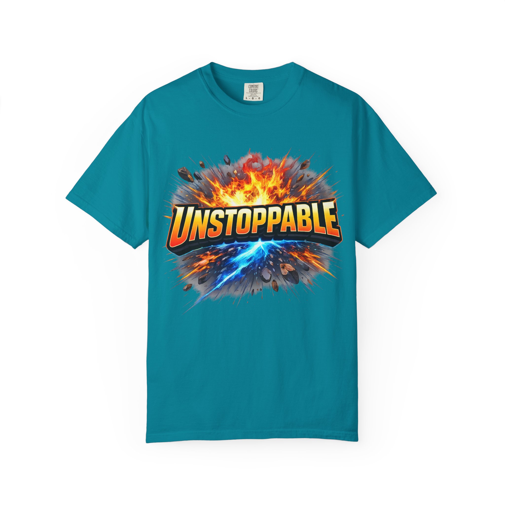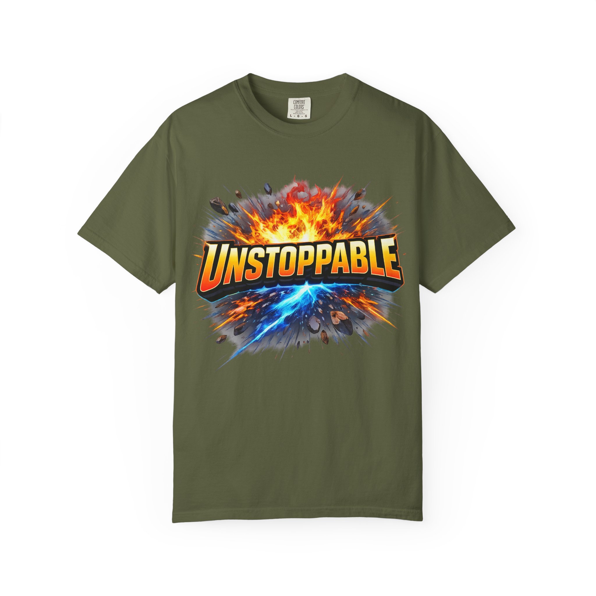 Lightweight but substantial, this garment-dyed tee carries a bold burst of energy across the chest — a graphic that reads “UNSTOPPABLE” set against a collision of fire and electric blue that feels like motion you can hear. The heavy-weight 100% ring-spun cotton softens with wear and the garment-dyed finish gives the color and texture a lived-in, vintage feel. Cut for a relaxed fit with durable double-needle stitching and a tubular knit that eliminates side seams, this shirt sits comfortably through long days of training, travel, or simply living loud. Wear it when you need that extra push — to the gym, on a road trip, or the day you decide to chase something big.