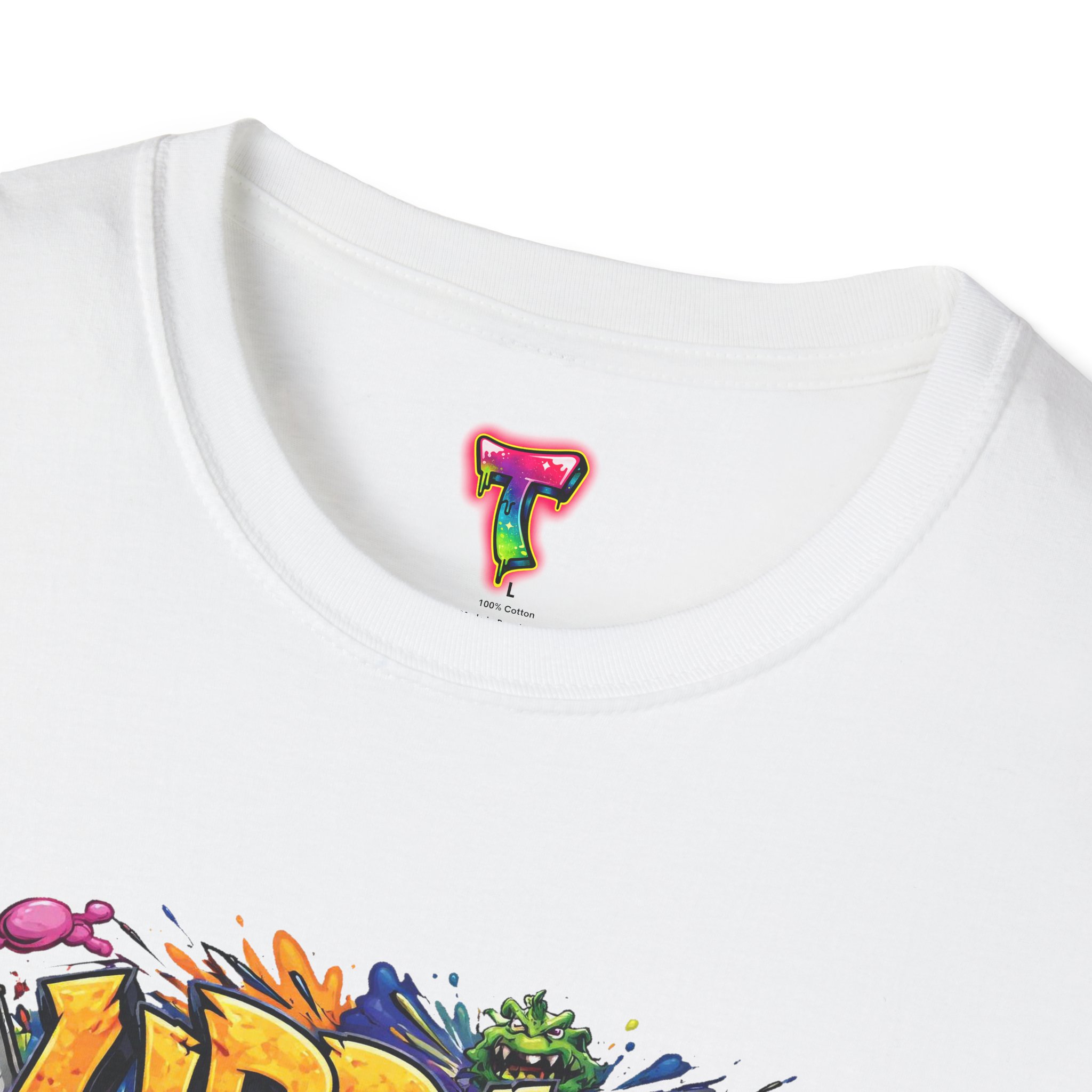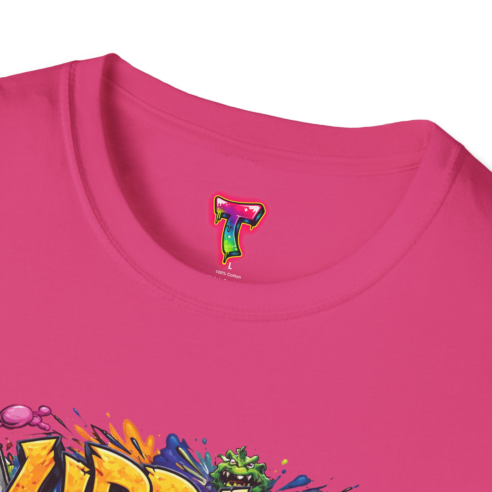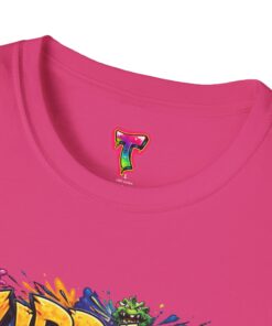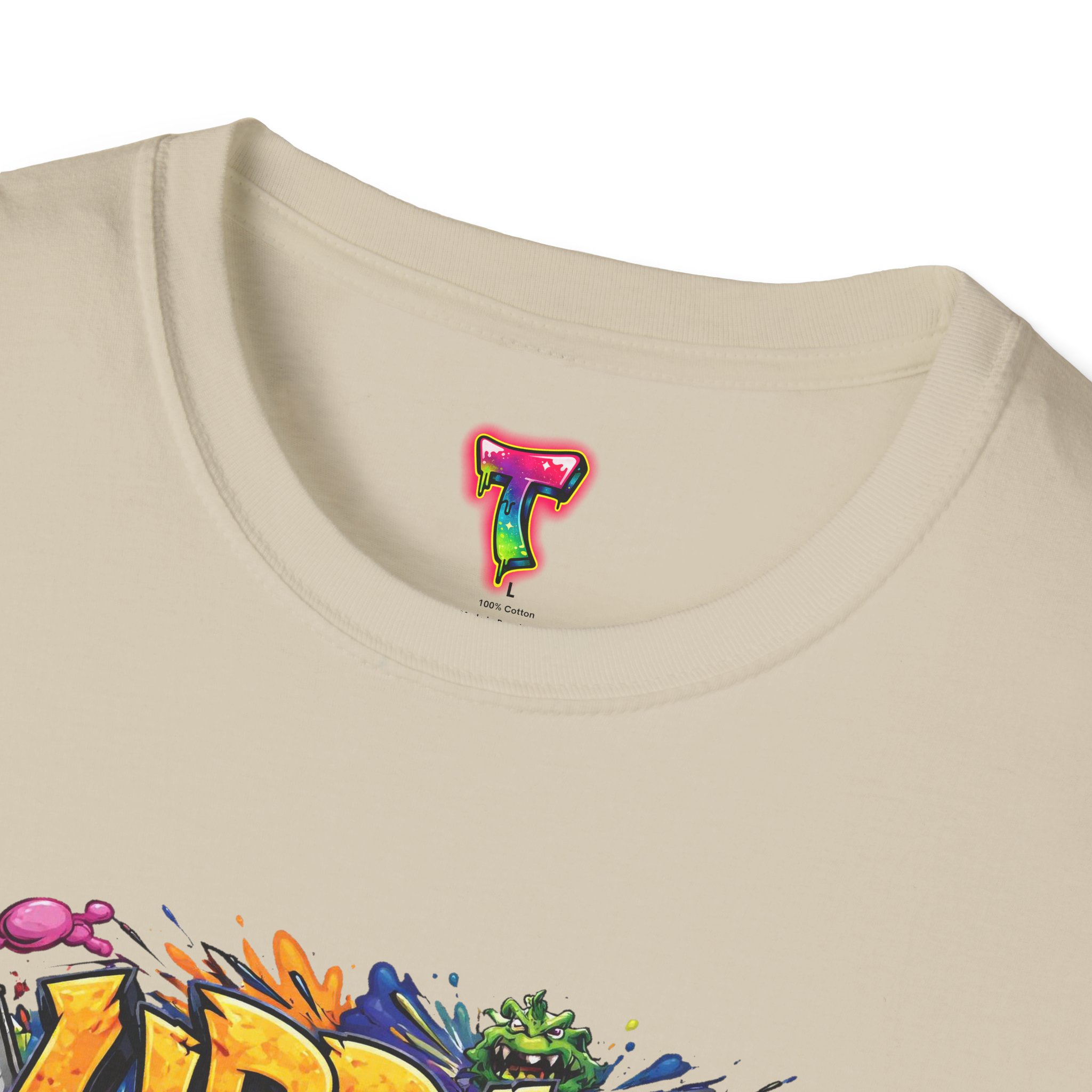 This lightweight cotton tee wears like your favorite go-to—soft, breathable, and built to last. Bright, graffiti-style artwork bursts across the chest in saturated colors and paint-drip accents, giving the shirt an energetic, streetwise vibe. The crew neck and classic fit keep the silhouette clean so the design takes center stage. Subtle natural flecks in the unprocessed colorways add a lived-in, authentic look. Wear it layered under a denim jacket for nights out or paired with joggers for skatepark days—this shirt brings bold color and urban attitude to everyday moments.