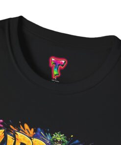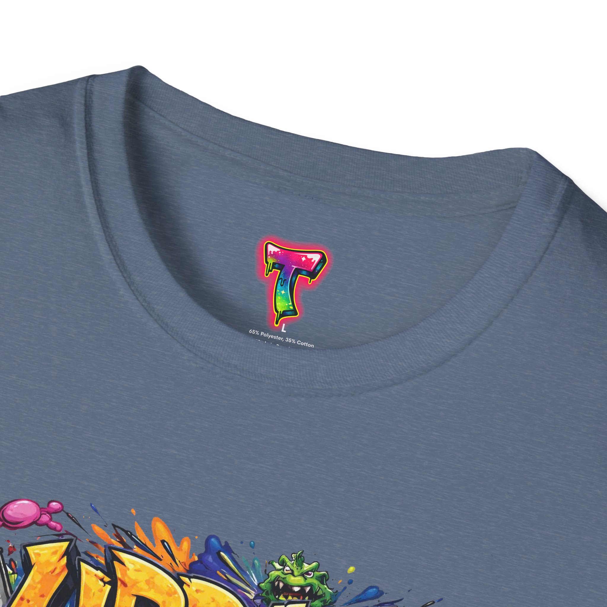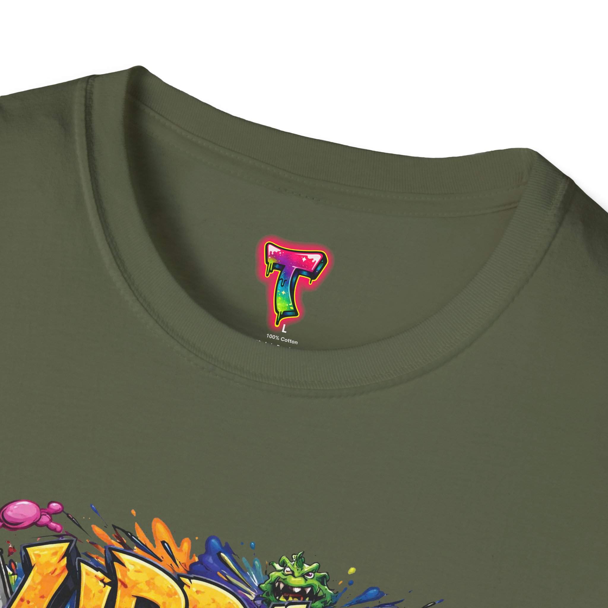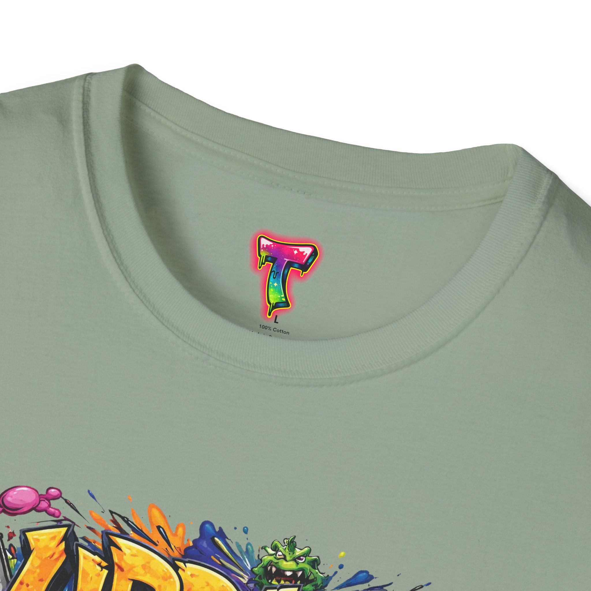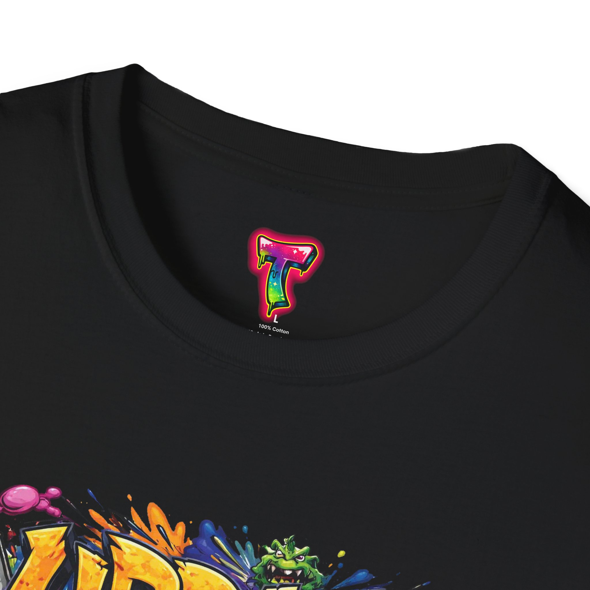 This lightweight cotton tee wears like your favorite go-to—soft, breathable, and built to last. Bright, graffiti-style artwork bursts across the chest in saturated colors and paint-drip accents, giving the shirt an energetic, streetwise vibe. The crew neck and classic fit keep the silhouette clean so the design takes center stage. Subtle natural flecks in the unprocessed colorways add a lived-in, authentic look. Wear it layered under a denim jacket for nights out or paired with joggers for skatepark days—this shirt brings bold color and urban attitude to everyday moments.