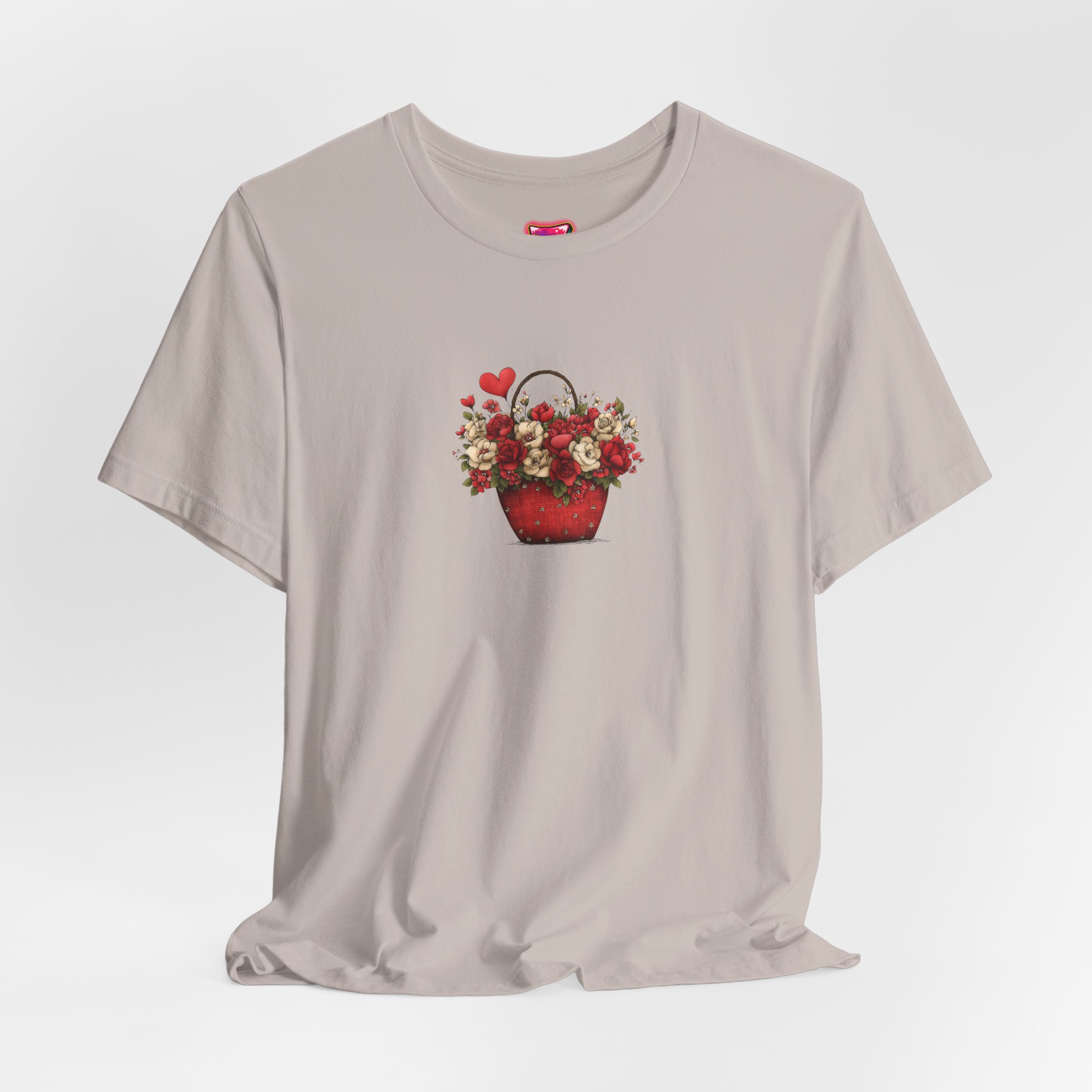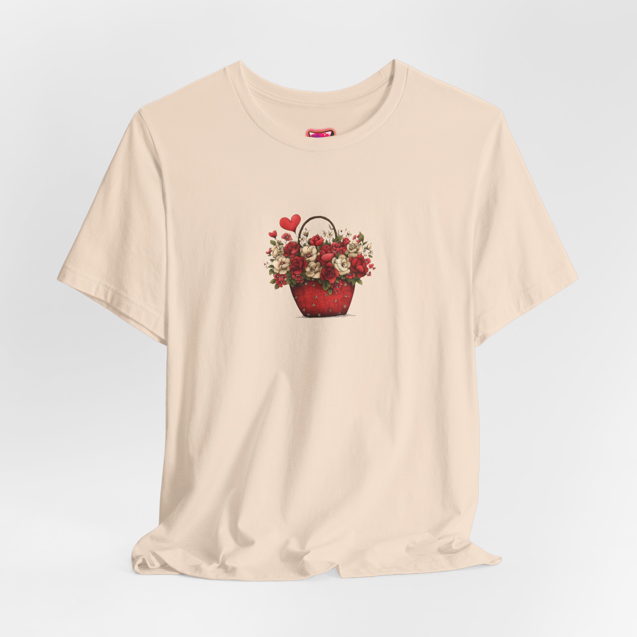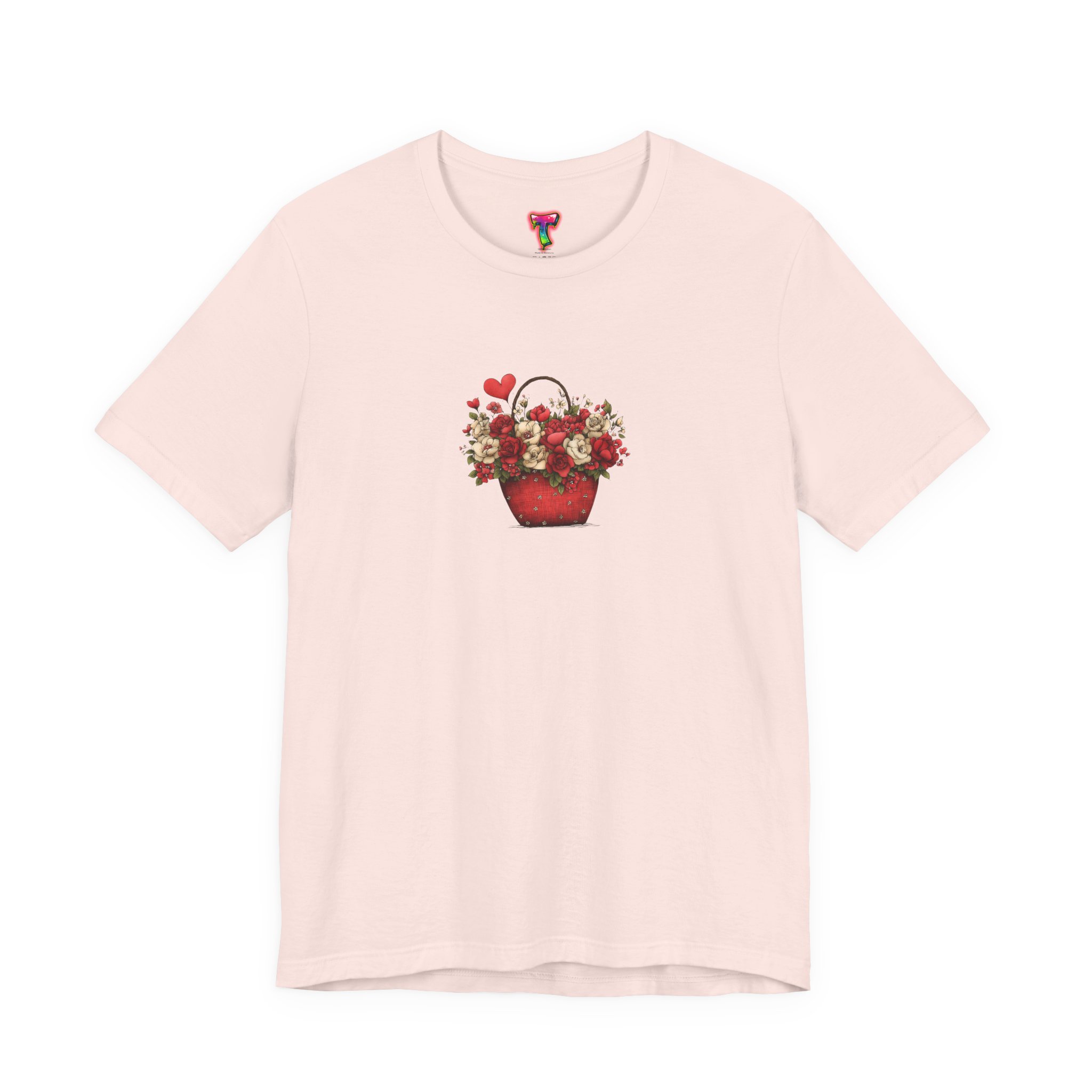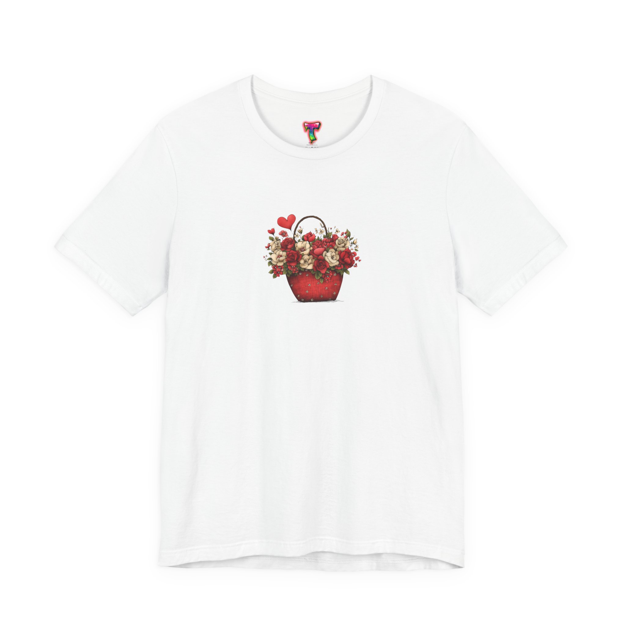 Say it with flowers that never fade with our “Valentine Floral Basket ” Tee! This elegant design features a woven basket overflowing with lush red and pink roses, topped with a delicate floating heart. A timeless symbol of affection, this floral illustration captures the beauty of a fresh spring garden and the warmth of a heartfelt romantic gesture.