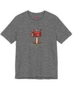 A soft, breathable tee that carries a quiet, homespun story. The small watercolor-style mailbox print—flushed with warm reds, falling leaves and a hint of wildflower grass—settles gently at the chest. Wear it on slow mornings with a mug and a patchwork blanket, or out on neighborhood walks where you notice porch details and hand-lettered signs. The retail-fit crew neck keeps the silhouette classic and easy to layer under jackets or over long-sleeve tees. It’s a shirt for people who savor small rituals: checking the post, swapping notes with neighbors, and collecting moments that feel like home.