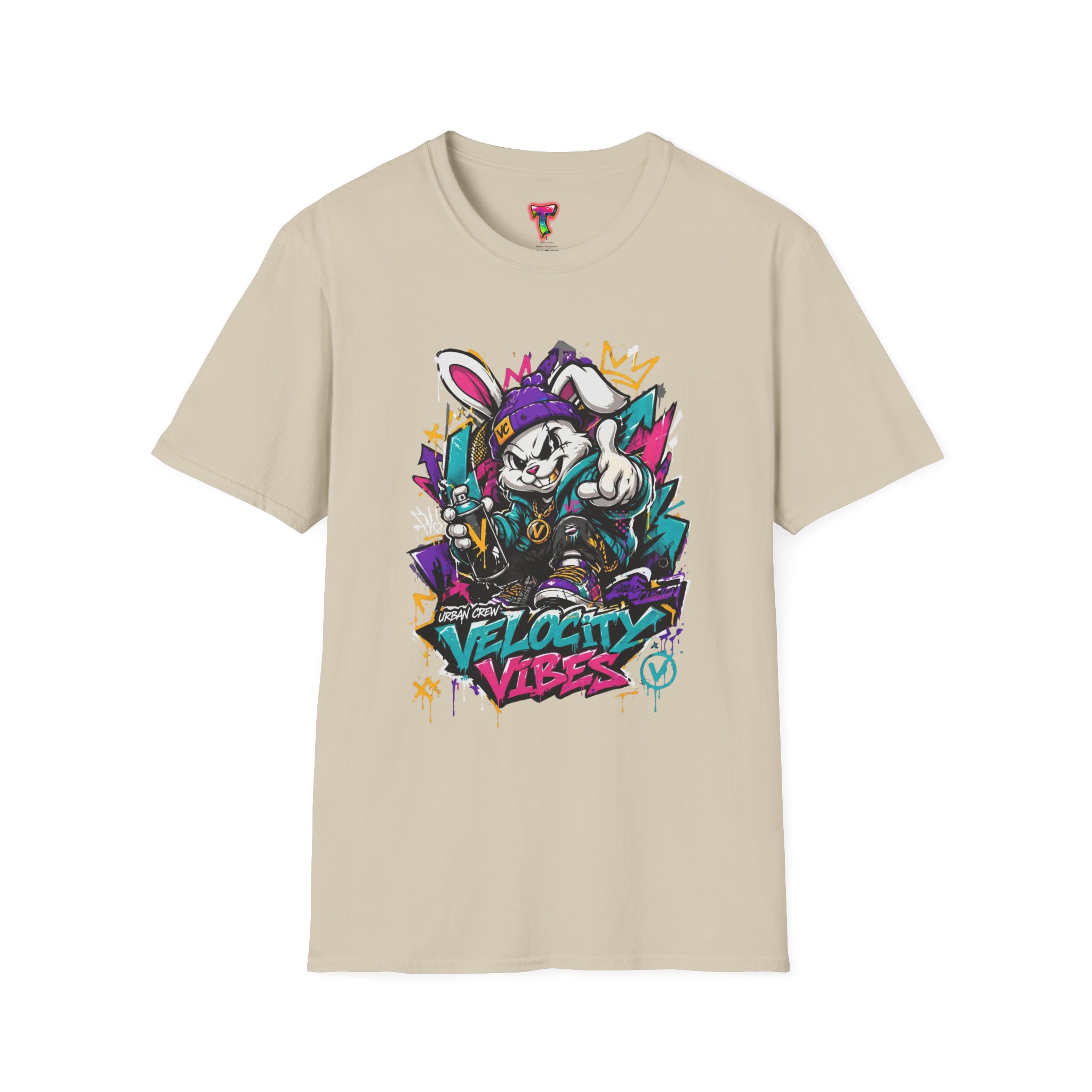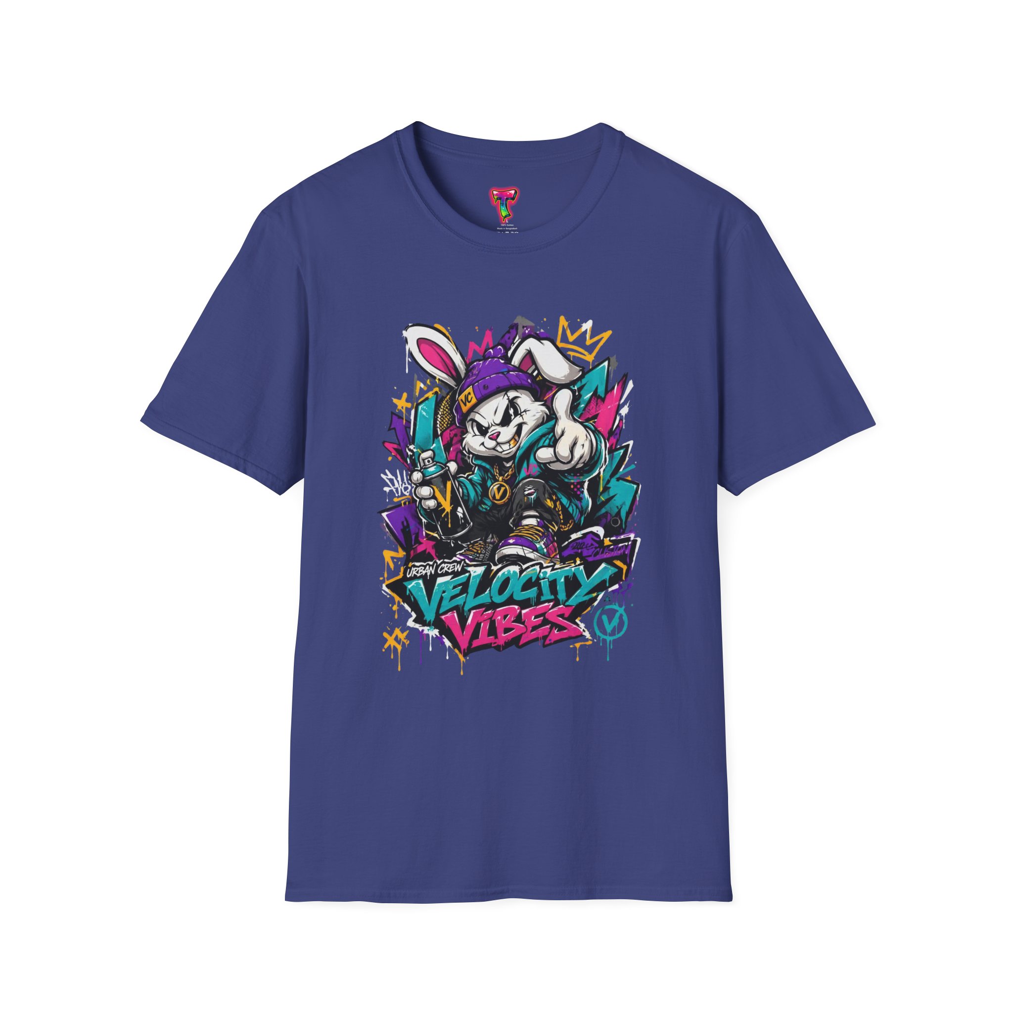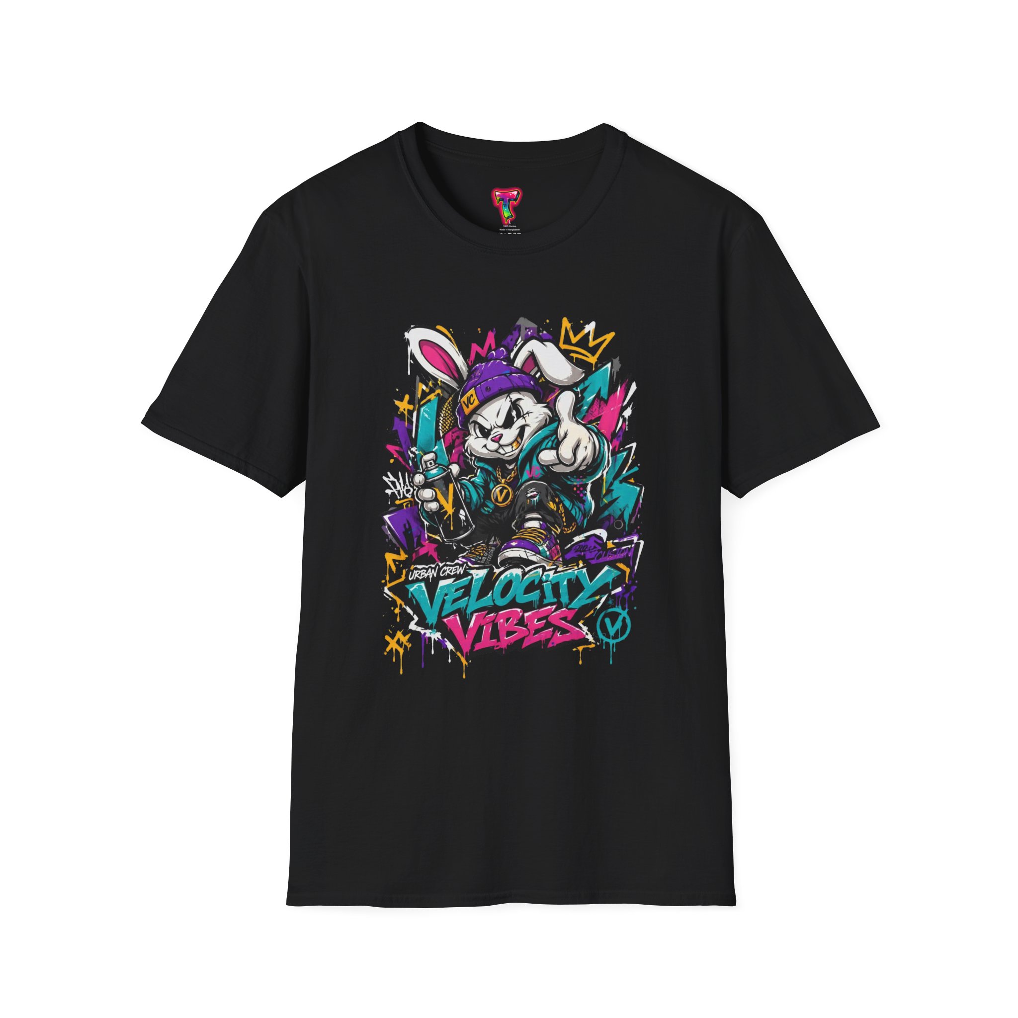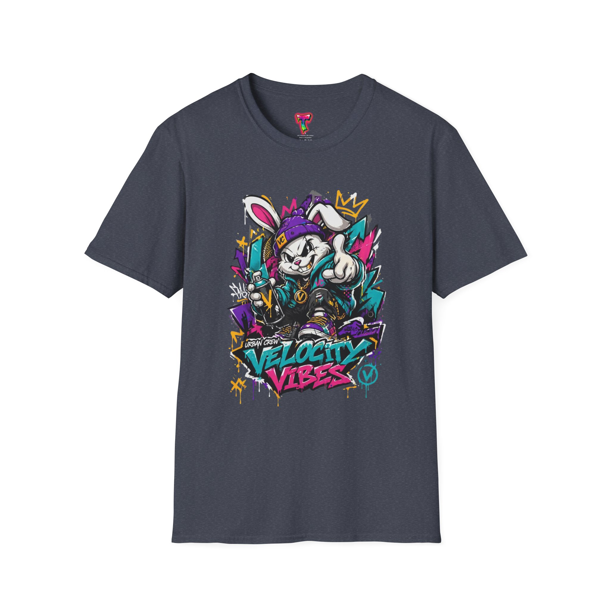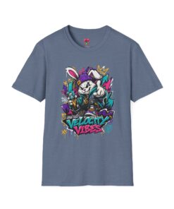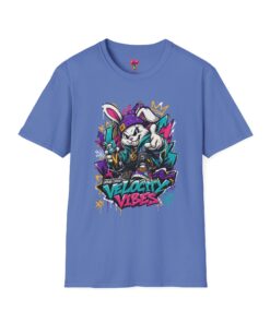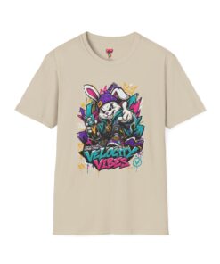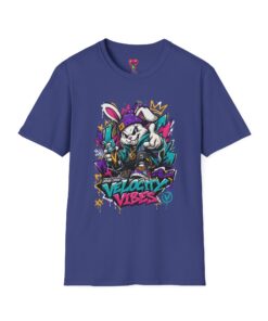 Unleash your energetic side with our “Velocity Vibes” T-shirt. Featuring a “bad-boy” bunny mascot decked out in streetwear gear, this design combines the gritty aesthetic of underground graffiti with a futuristic cyberpunk color palette. Set against a deep burgundy backdrop, the sharp teal and neon pink accents make this graphic a true standout piece.