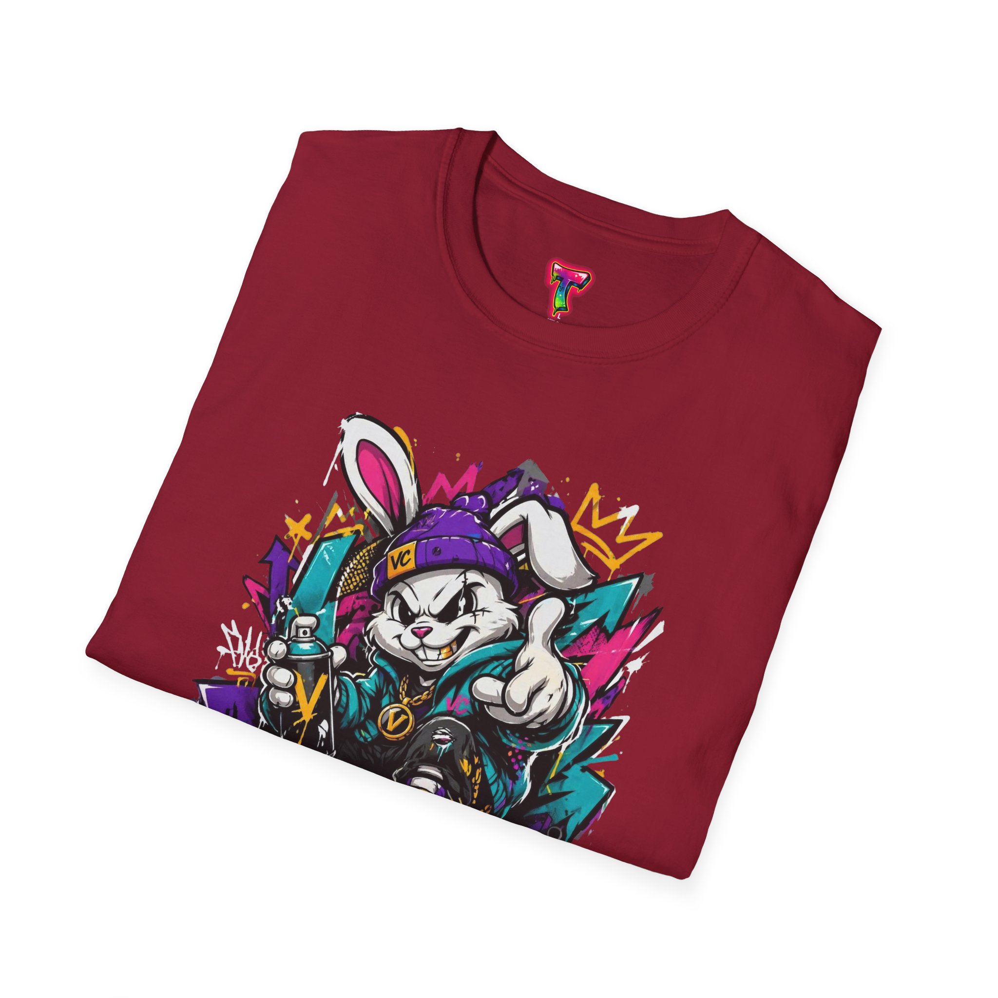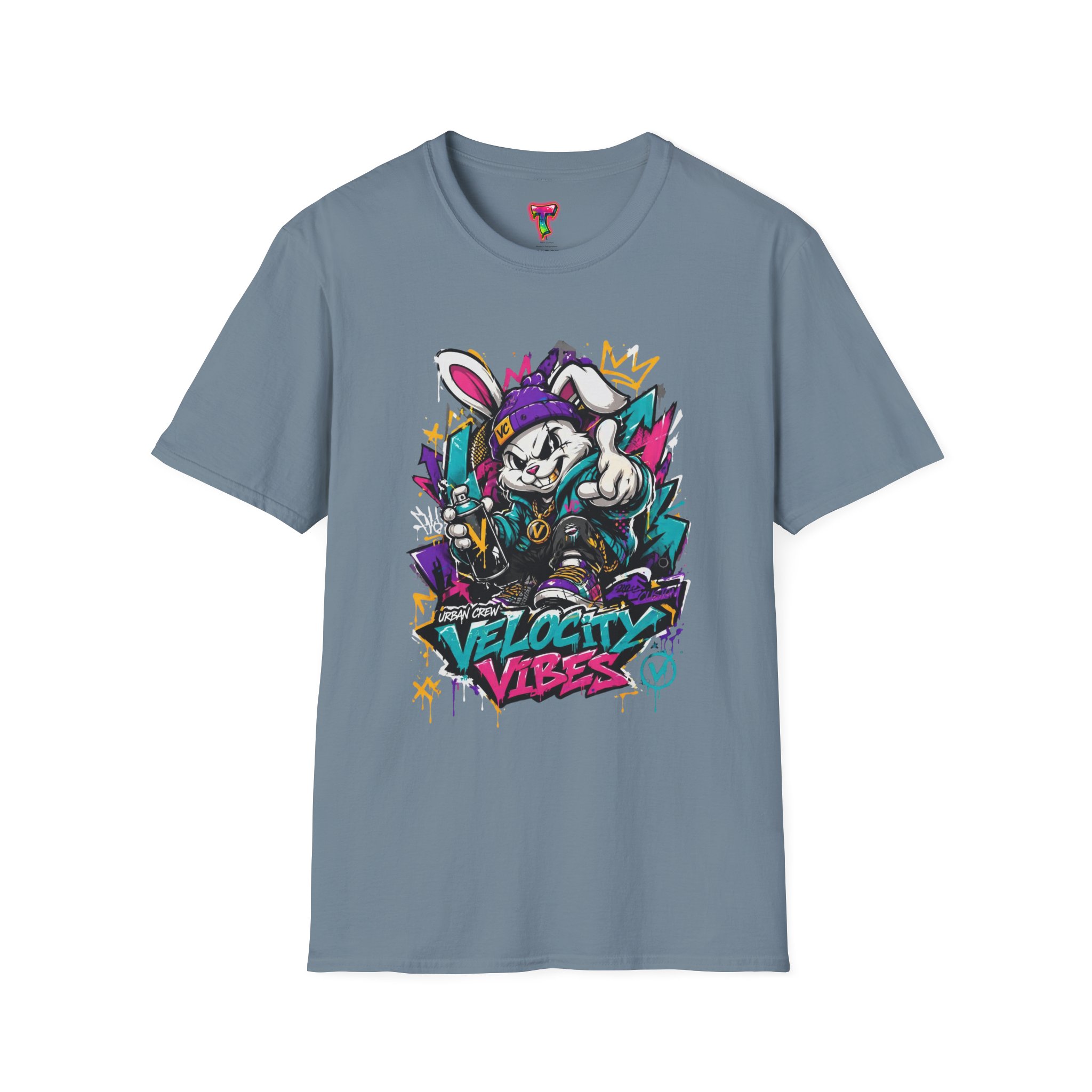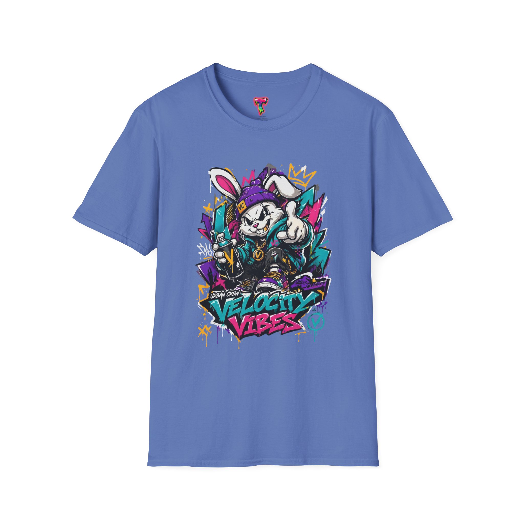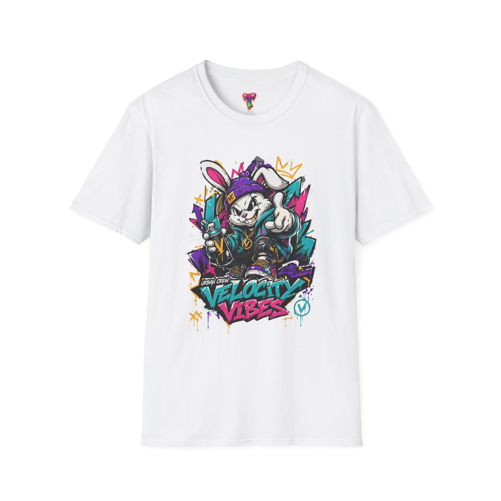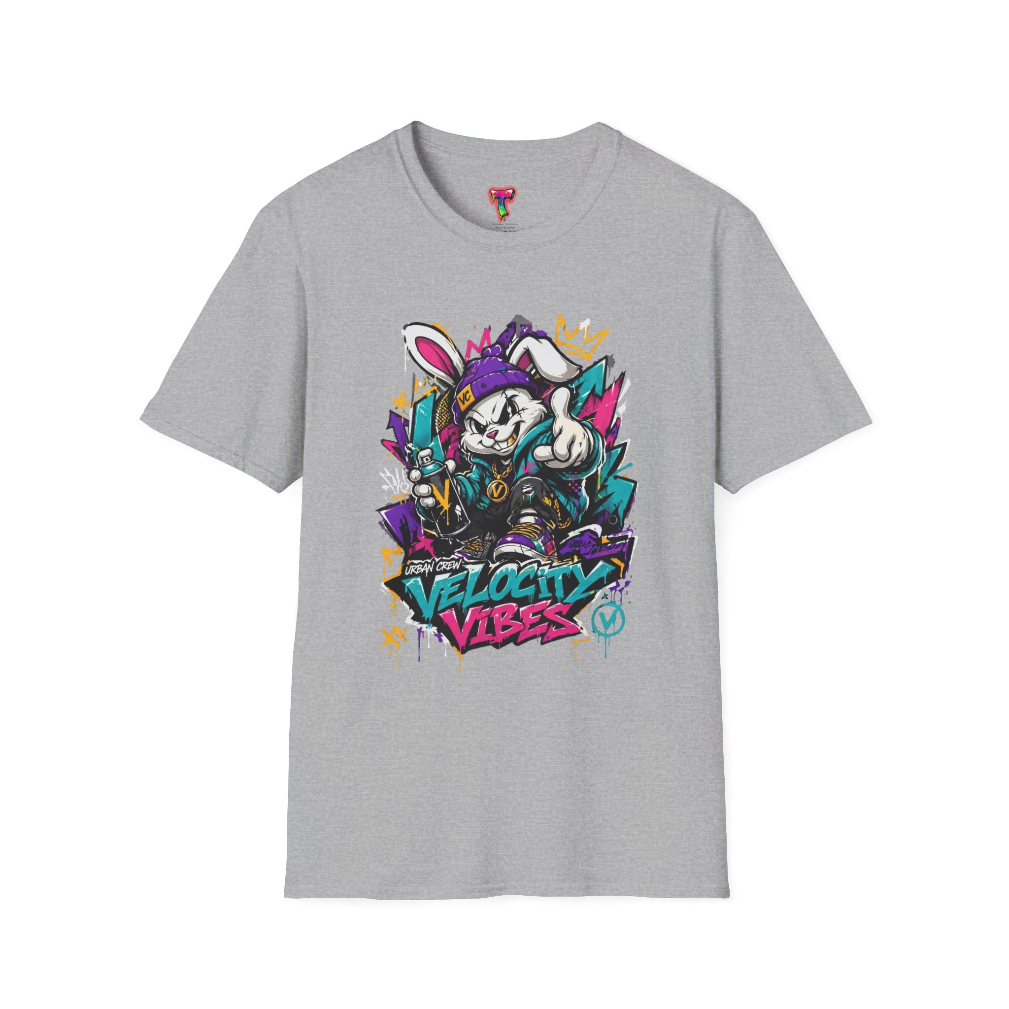 Unleash your energetic side with our “Velocity Vibes” T-shirt. Featuring a “bad-boy” bunny mascot decked out in streetwear gear, this design combines the gritty aesthetic of underground graffiti with a futuristic cyberpunk color palette. Set against a deep burgundy backdrop, the sharp teal and neon pink accents make this graphic a true standout piece.