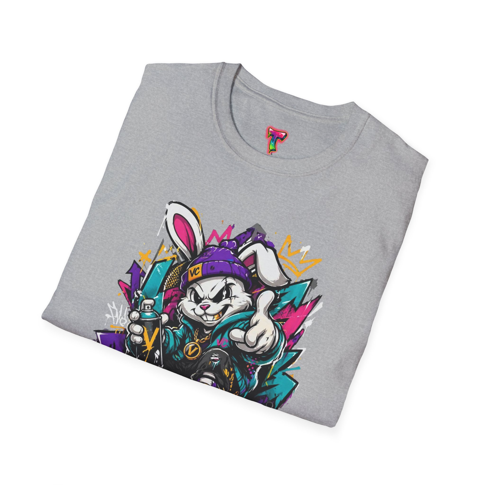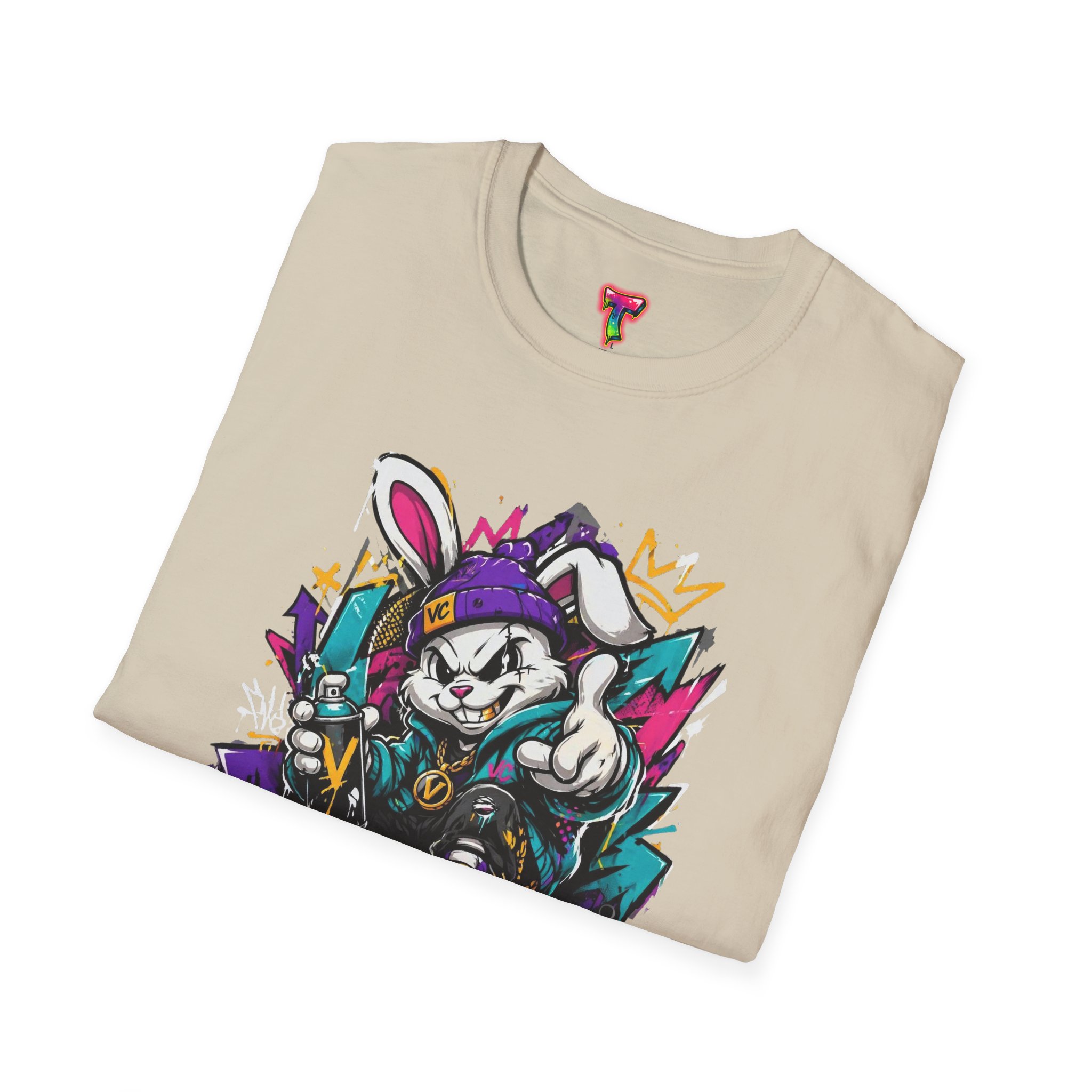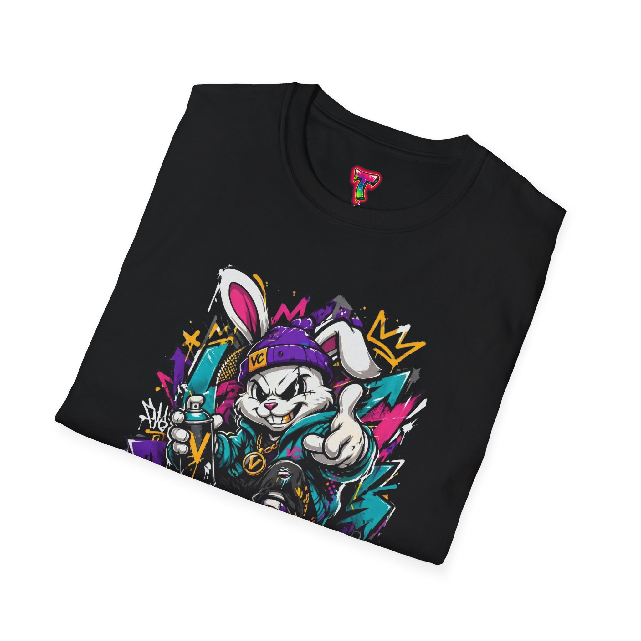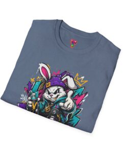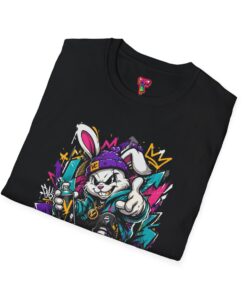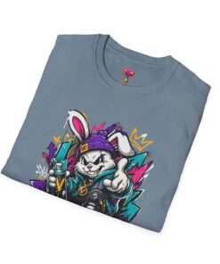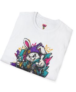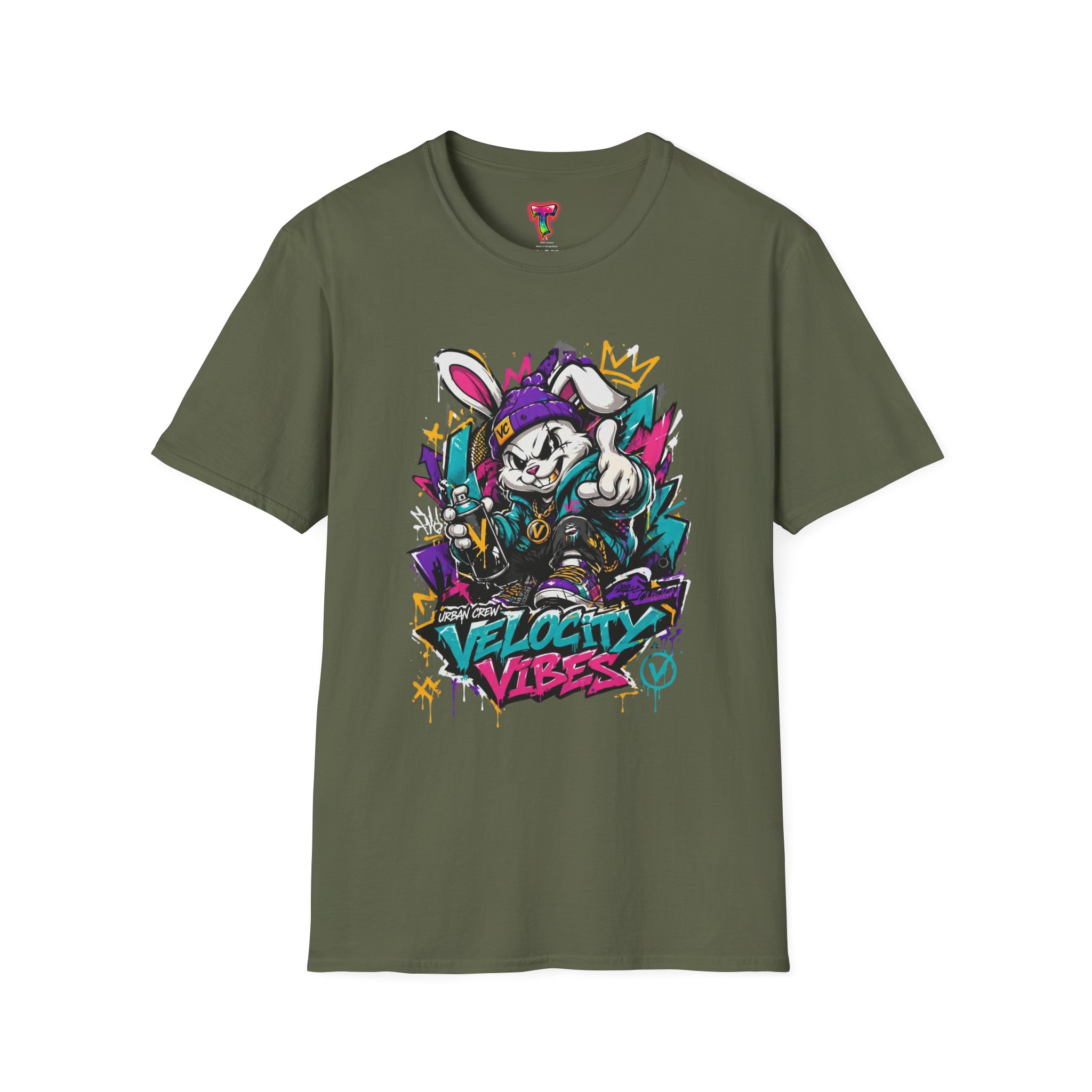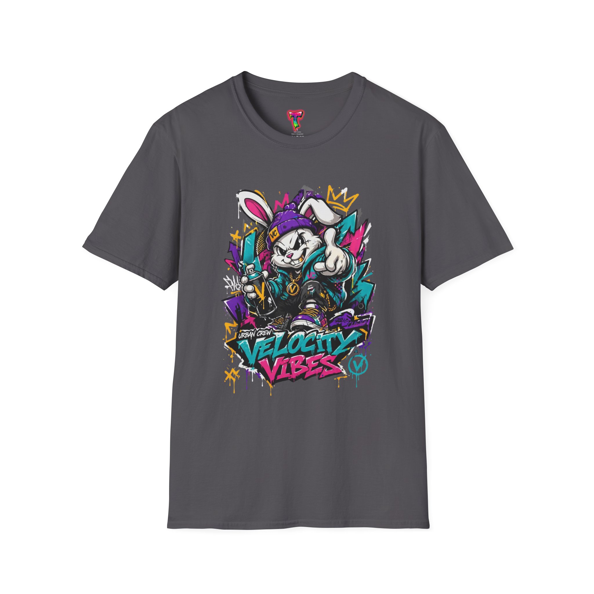 Unleash your energetic side with our “Velocity Vibes” T-shirt. Featuring a “bad-boy” bunny mascot decked out in streetwear gear, this design combines the gritty aesthetic of underground graffiti with a futuristic cyberpunk color palette. Set against a deep burgundy backdrop, the sharp teal and neon pink accents make this graphic a true standout piece.