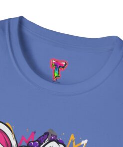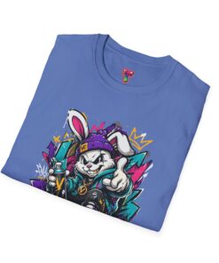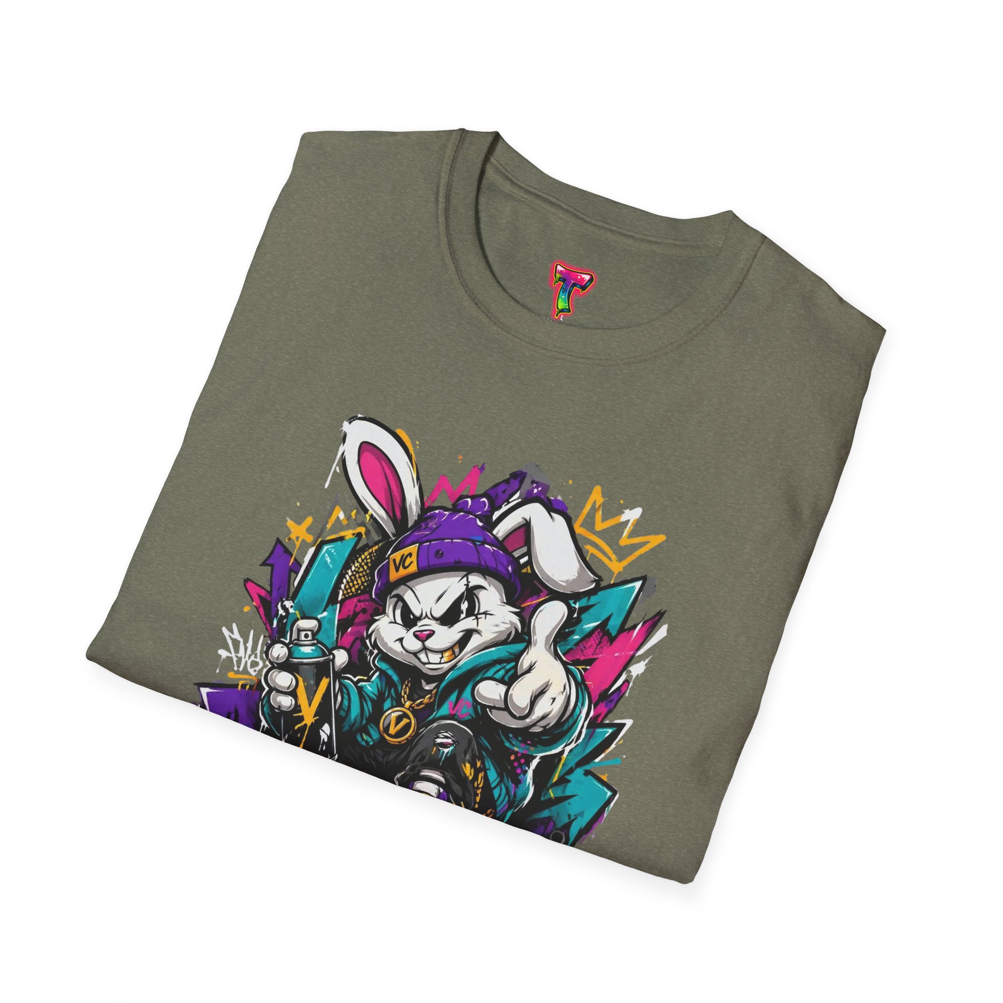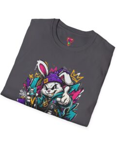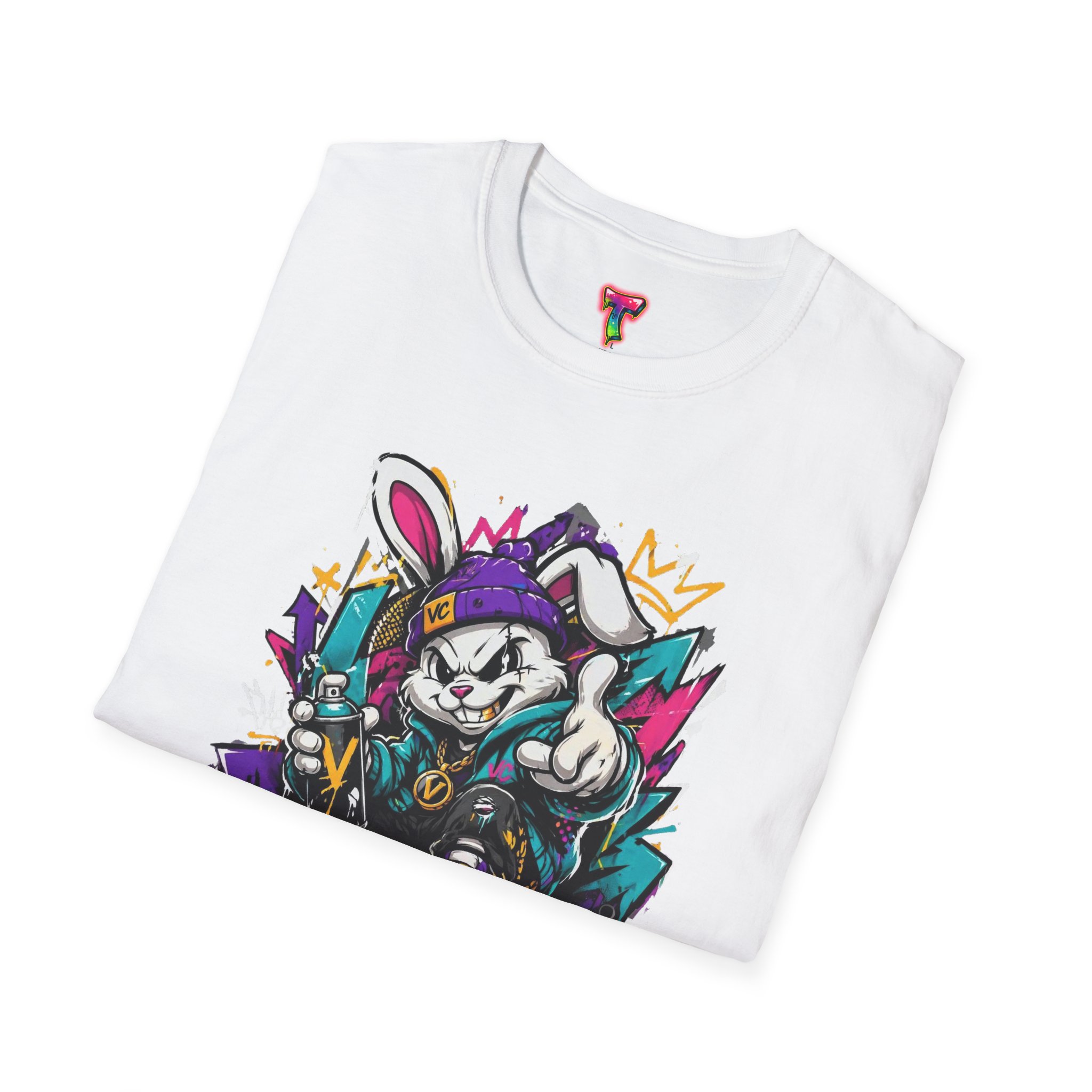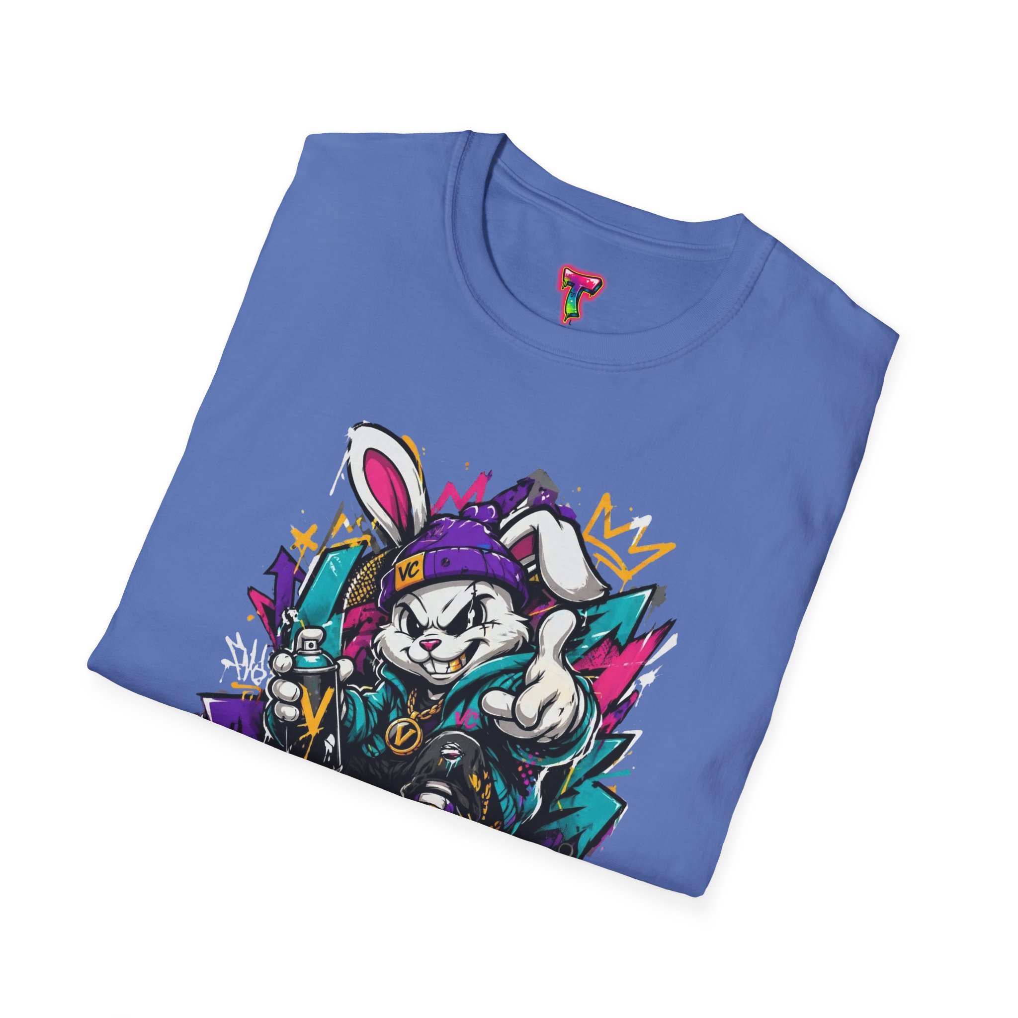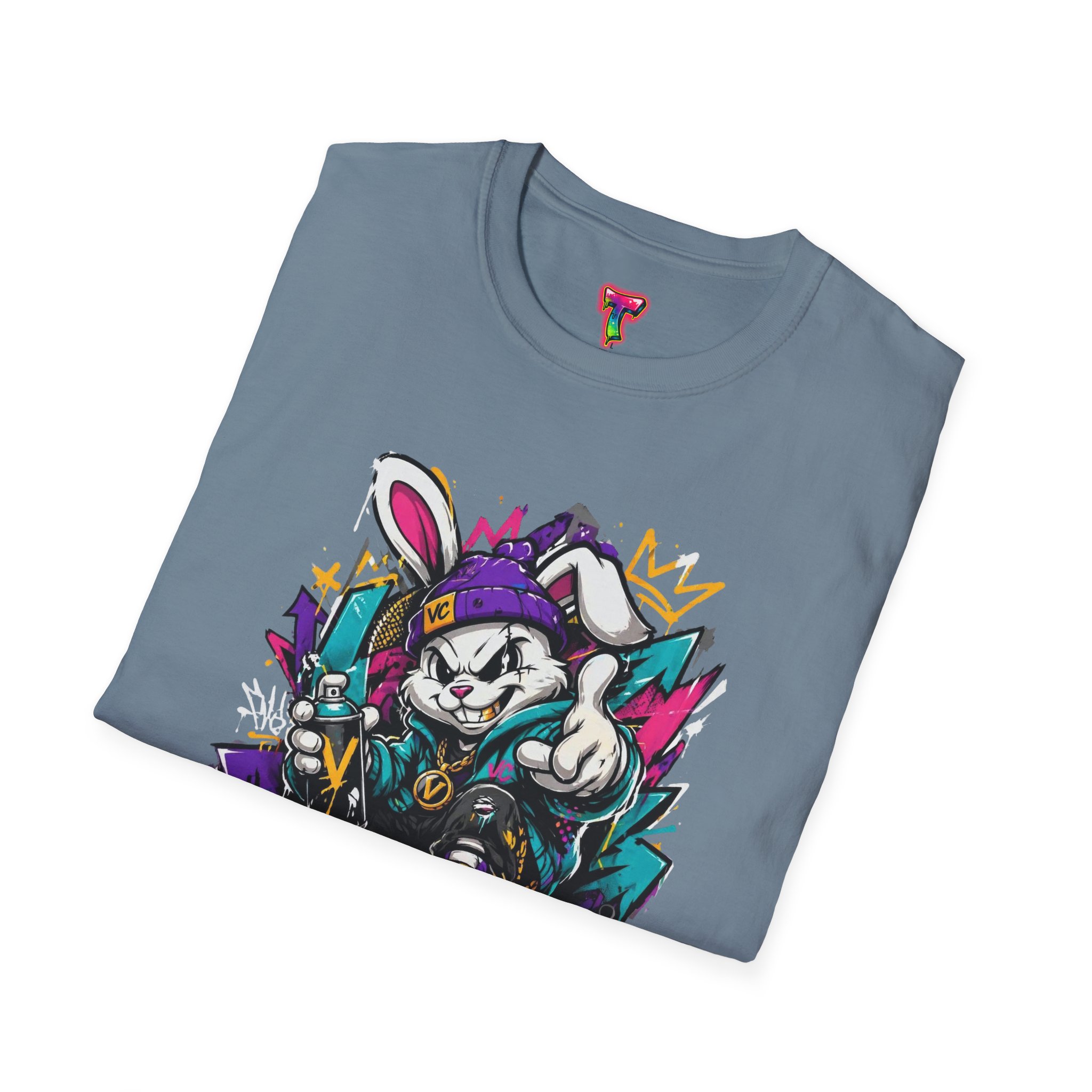 Unleash your energetic side with our “Velocity Vibes” T-shirt. Featuring a “bad-boy” bunny mascot decked out in streetwear gear, this design combines the gritty aesthetic of underground graffiti with a futuristic cyberpunk color palette. Set against a deep burgundy backdrop, the sharp teal and neon pink accents make this graphic a true standout piece.