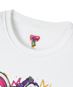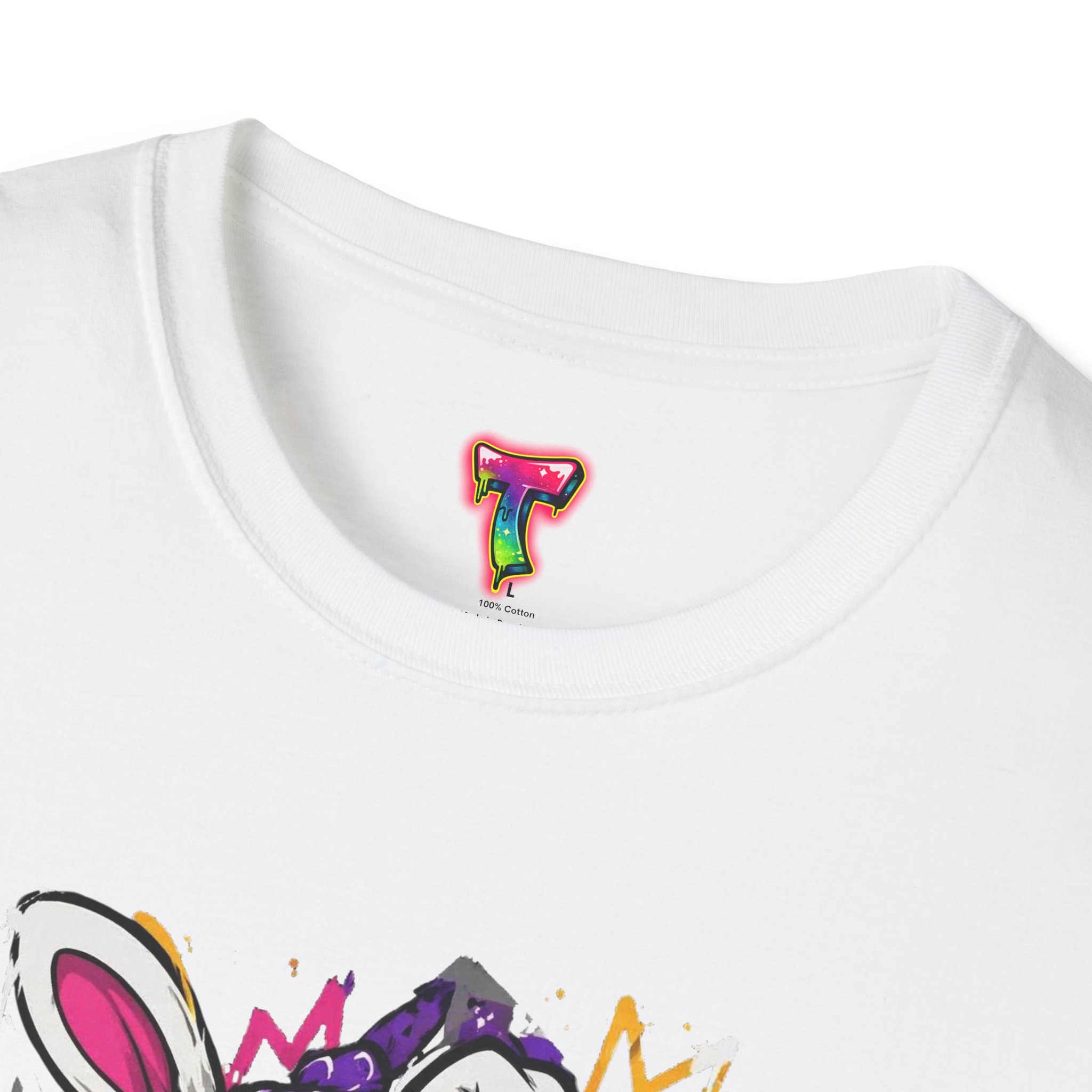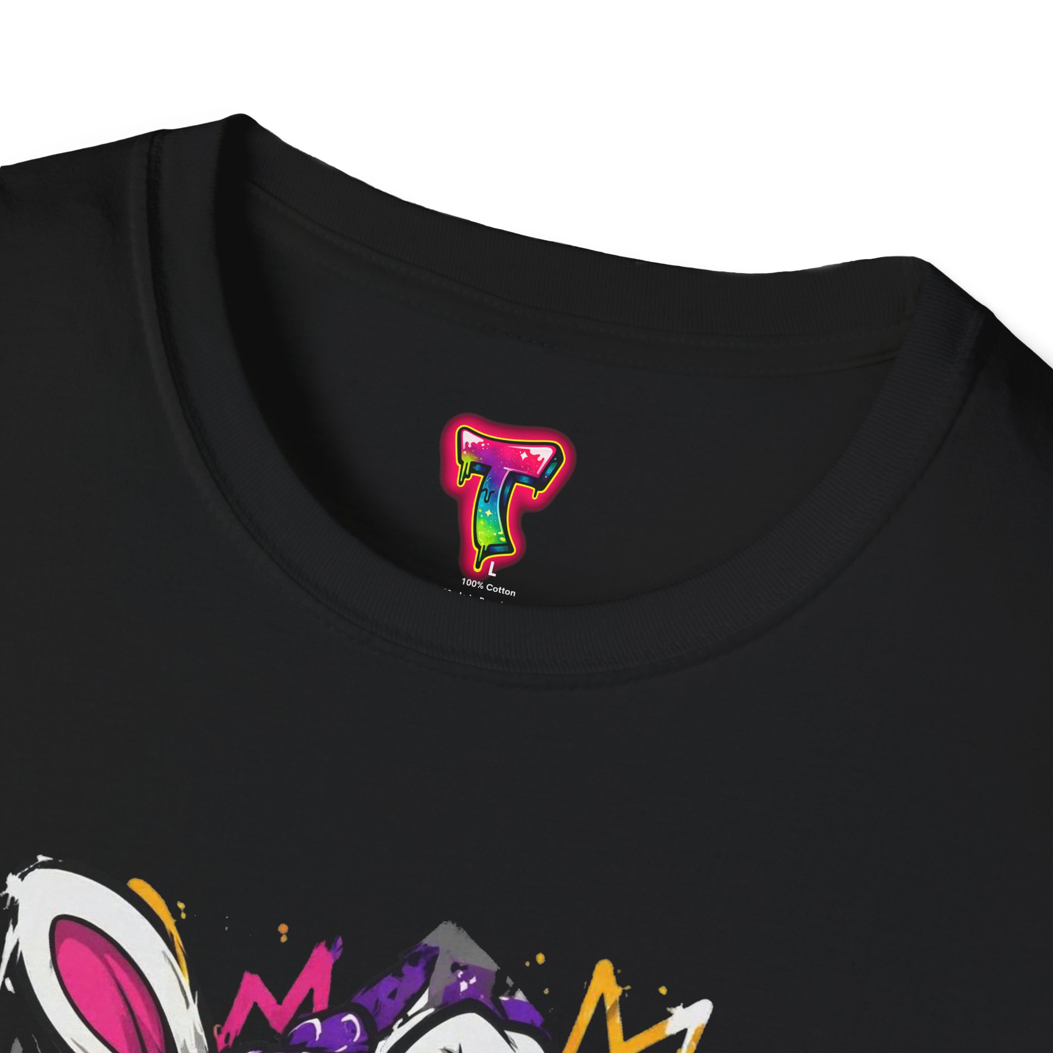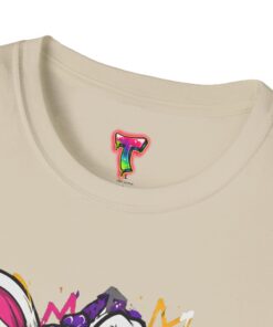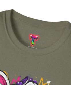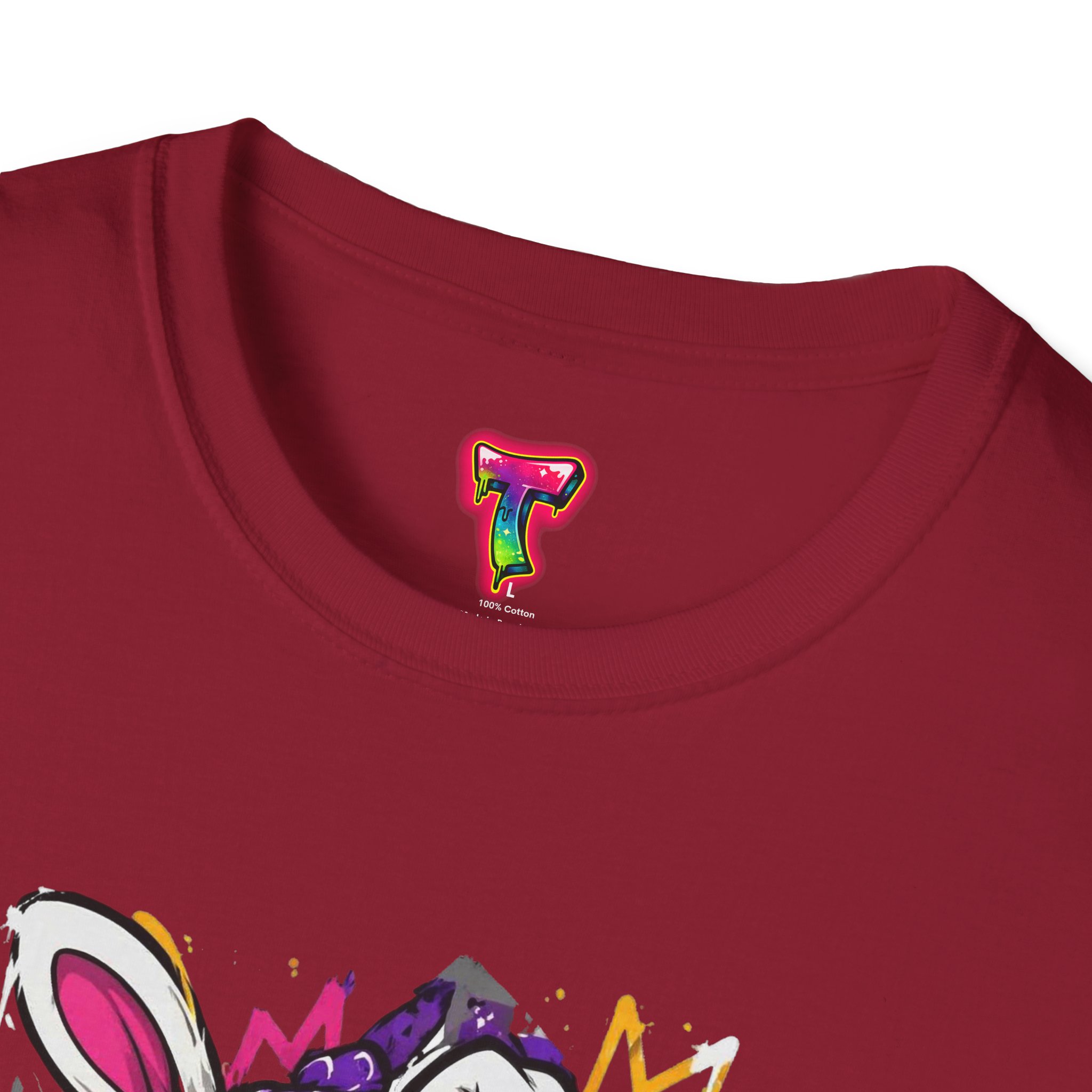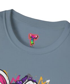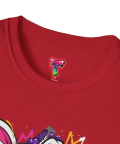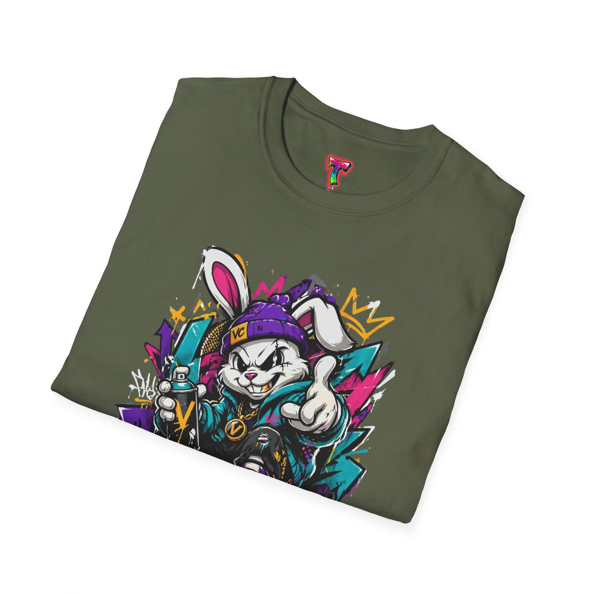 Unleash your energetic side with our “Velocity Vibes” T-shirt. Featuring a “bad-boy” bunny mascot decked out in streetwear gear, this design combines the gritty aesthetic of underground graffiti with a futuristic cyberpunk color palette. Set against a deep burgundy backdrop, the sharp teal and neon pink accents make this graphic a true standout piece.