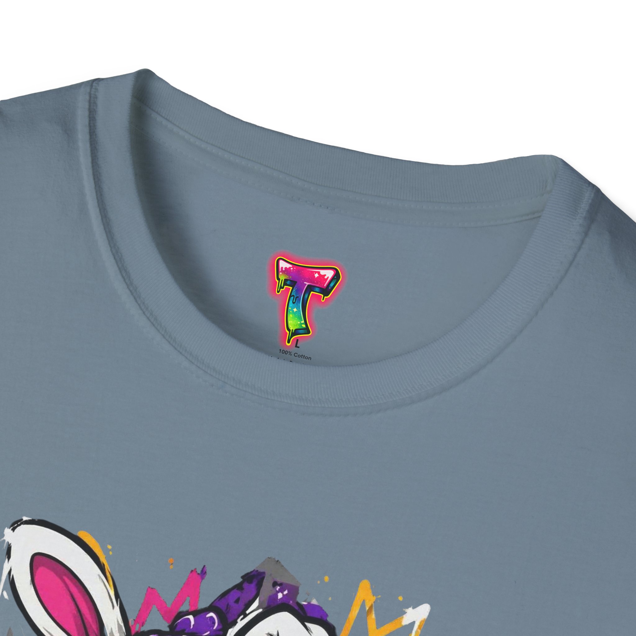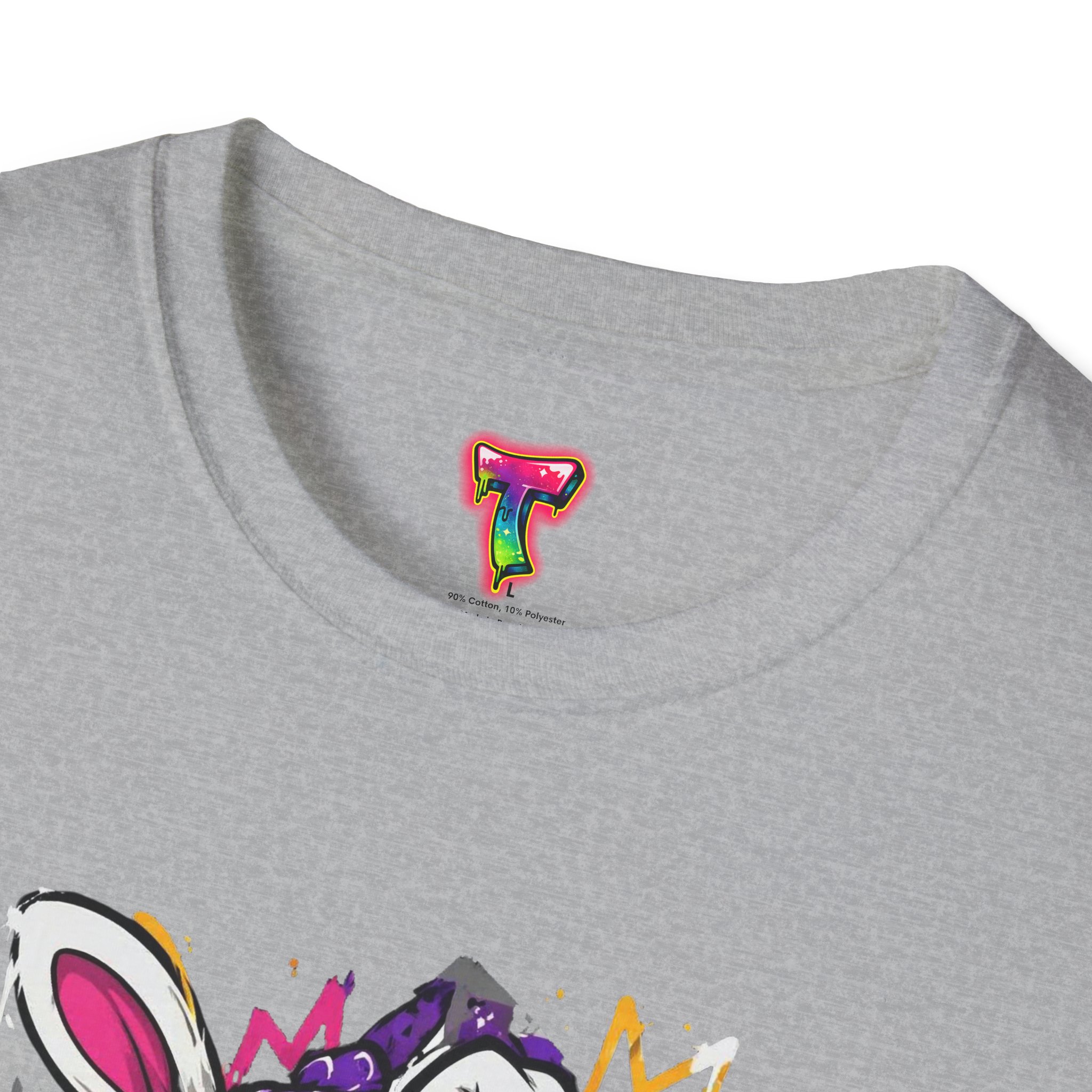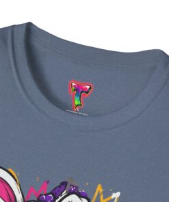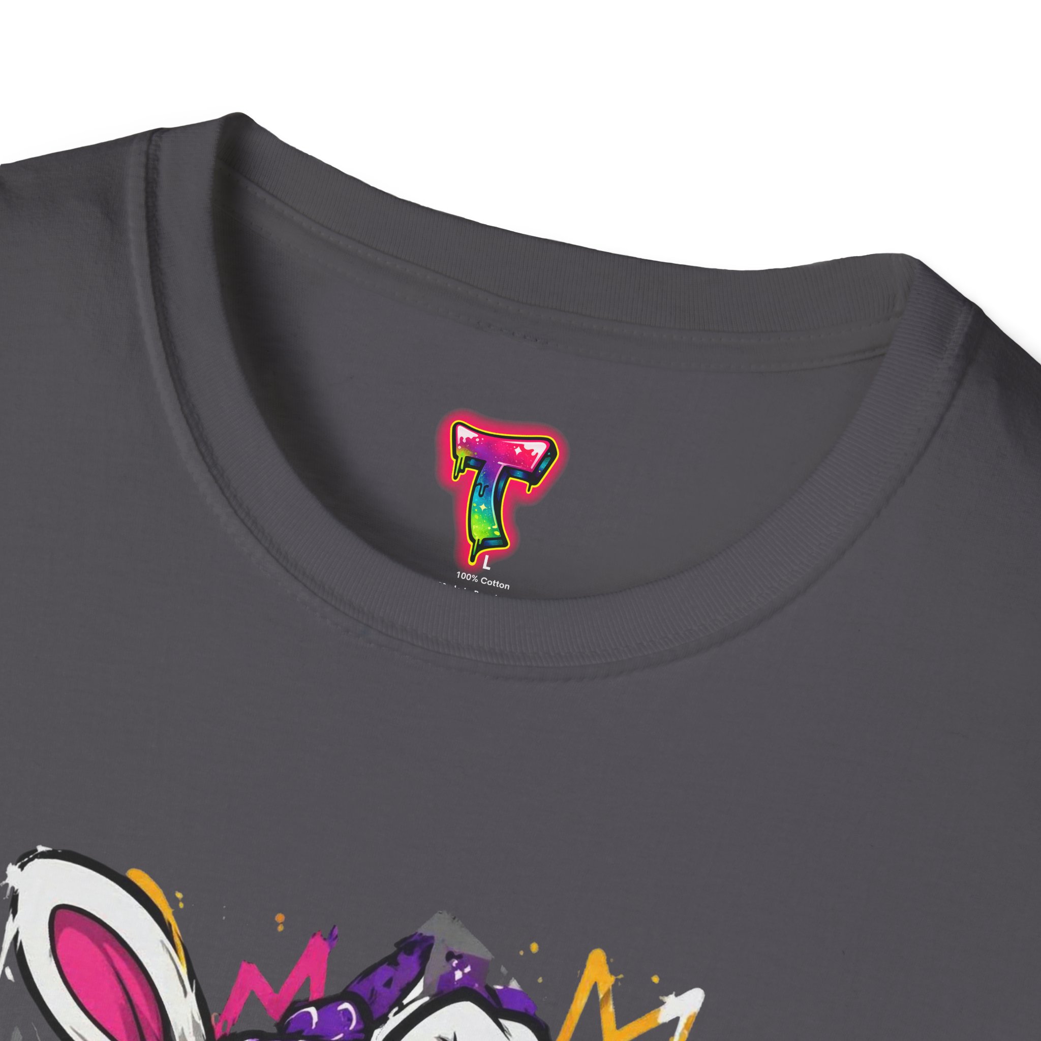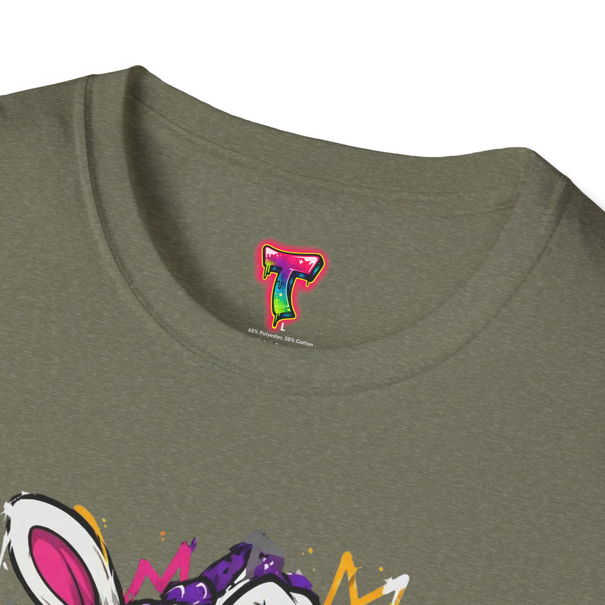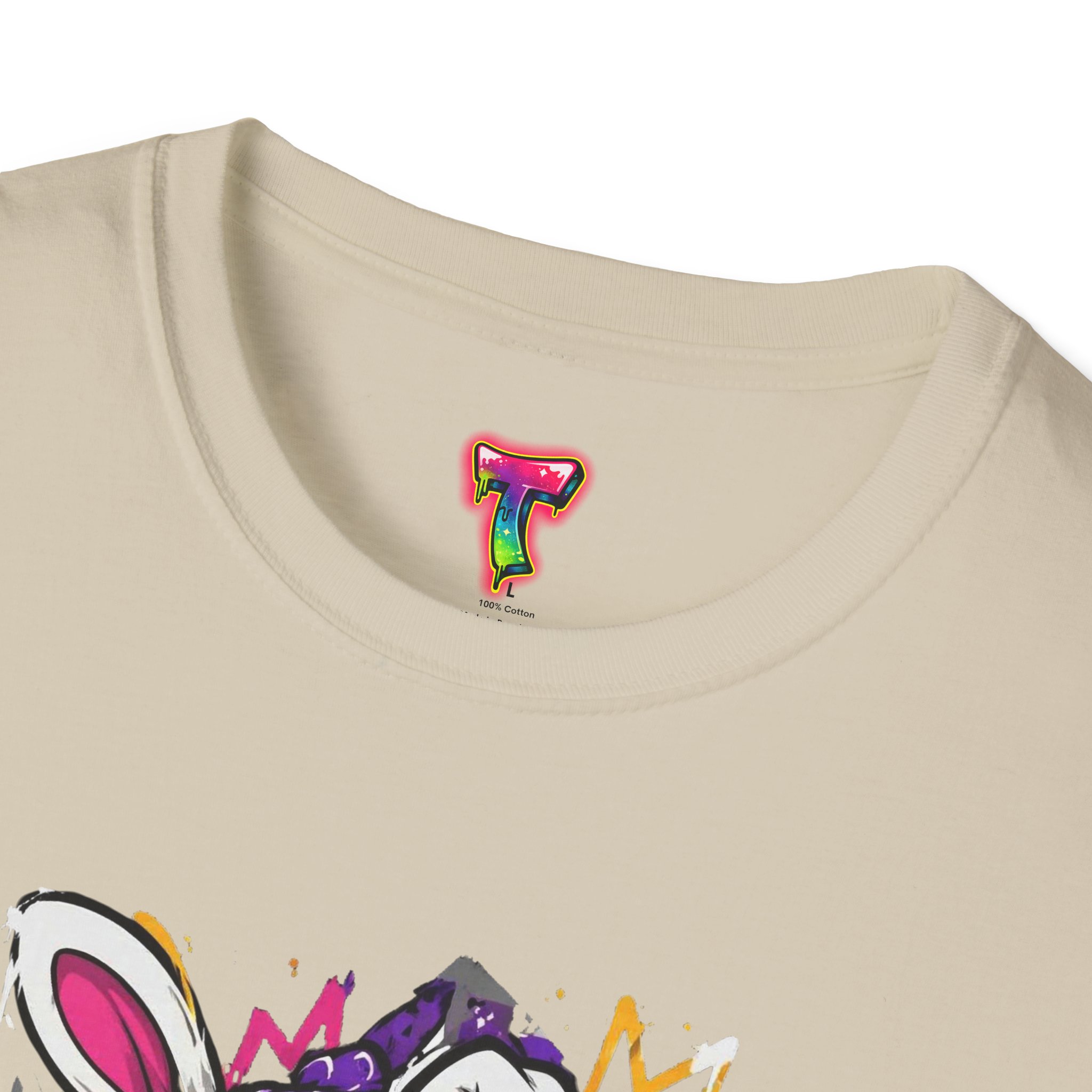 Unleash your energetic side with our “Velocity Vibes” T-shirt. Featuring a “bad-boy” bunny mascot decked out in streetwear gear, this design combines the gritty aesthetic of underground graffiti with a futuristic cyberpunk color palette. Set against a deep burgundy backdrop, the sharp teal and neon pink accents make this graphic a true standout piece.