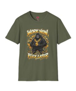 Put in the work now and enjoy the rewards later with this bold “WORK NOW FLEX LATER” graphic t-shirt — built for hustlers, grinders, and those chasing success.