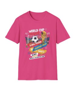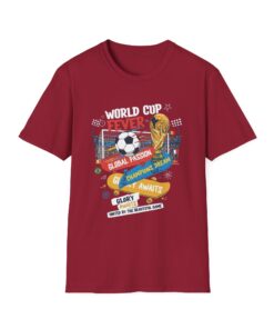 Wear the World Cup with pride. This lightweight crew tee brings the stadium home with a vibrant, vintage-inspired graphic: a soccer ball sailing toward the net, a gleaming trophy, and ribbons shouting “Global Passion” and “Champion’s Dream.” It feels soft against the skin and drapes cleanly thanks to a classic fit and tubular knit. Toss it on for match day, post-game meetups, or travel days when you want a comfortable layer that announces your love of the game without shouting. The tear-away label and ribbed collar keep it easy and comfortable during long viewing sessions, and the durable print methods hold up after washes.