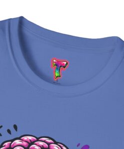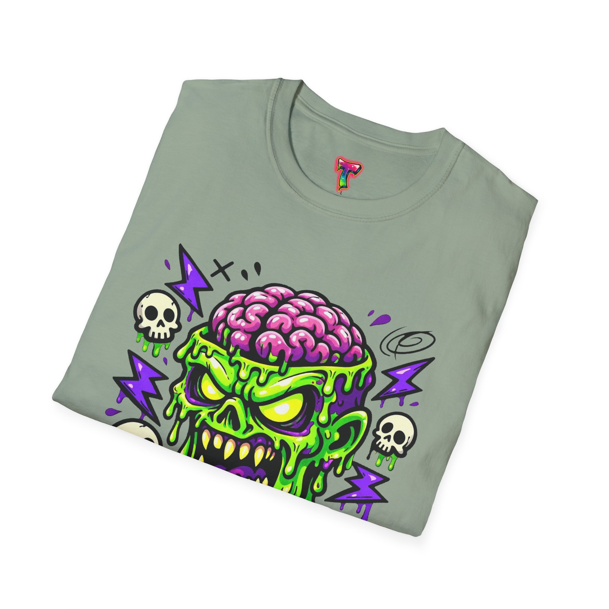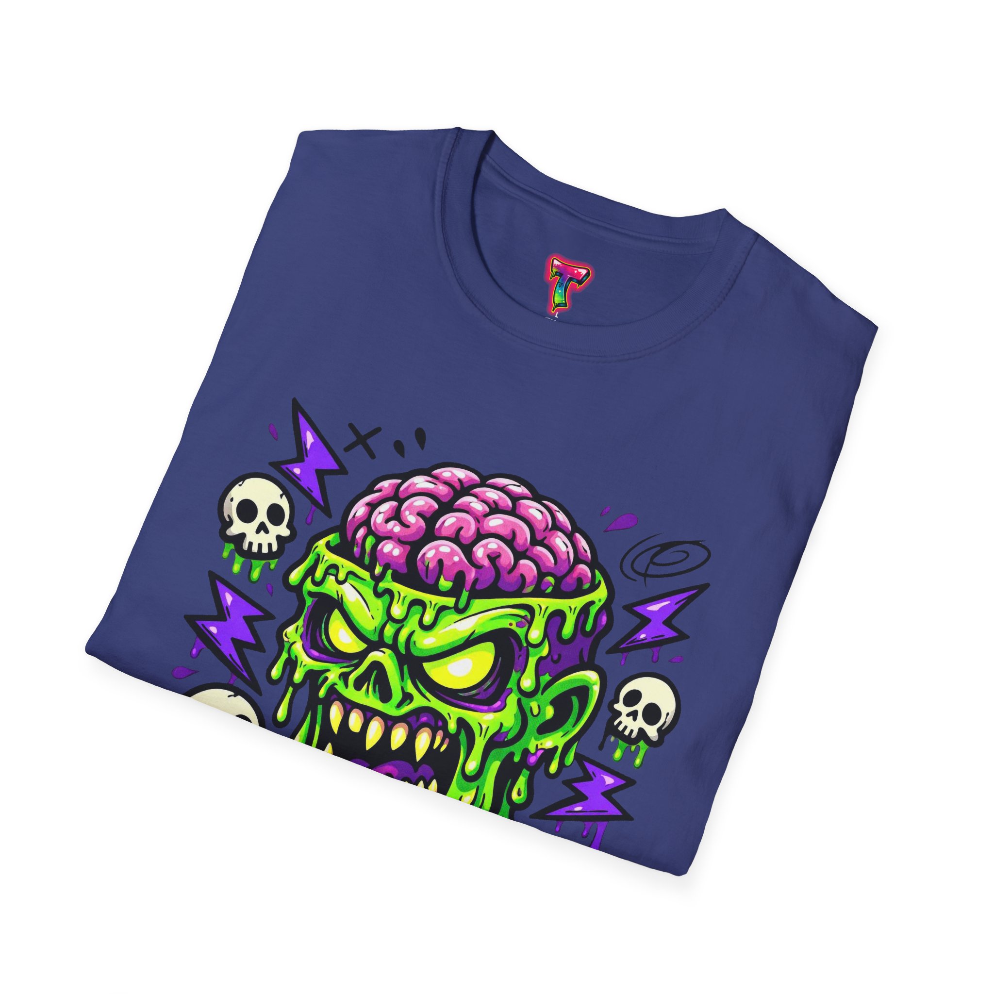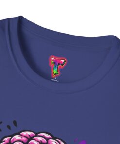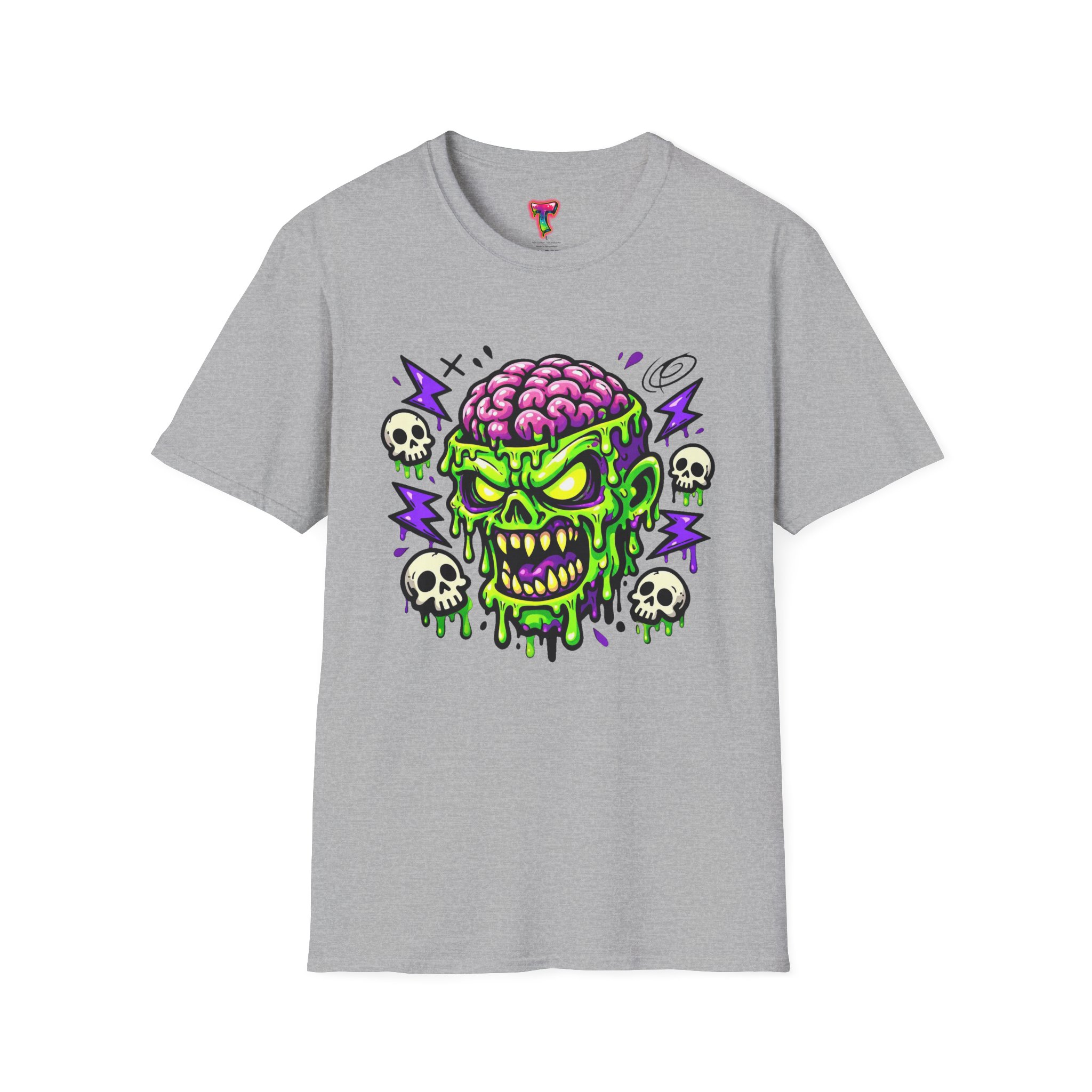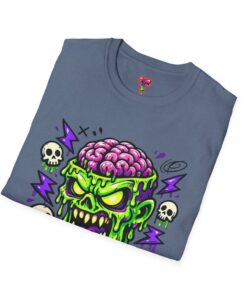 This lightweight cotton tee carries a bold, neon-horror illustration that reads like a midnight comic panel — a goo-dripping skull with exposed brain, electric purple flashes and tiny orbiting skulls. It sits cleanly on the chest so the design stays the center of attention without feeling oversized. Wear it to cut through bland festival crowds, to animate late-night skate sessions, or to anchor a layered streetwear look. The fabric feels soft against skin and breathes easily, so the shirt keeps its edge whether you’re moving through a summer mosh or hanging out at a dim-lit arcade. It’s a statement piece for anyone who likes loud art, punk-tinged aesthetics, and a little horror-show whimsy in their everyday wardrobe.