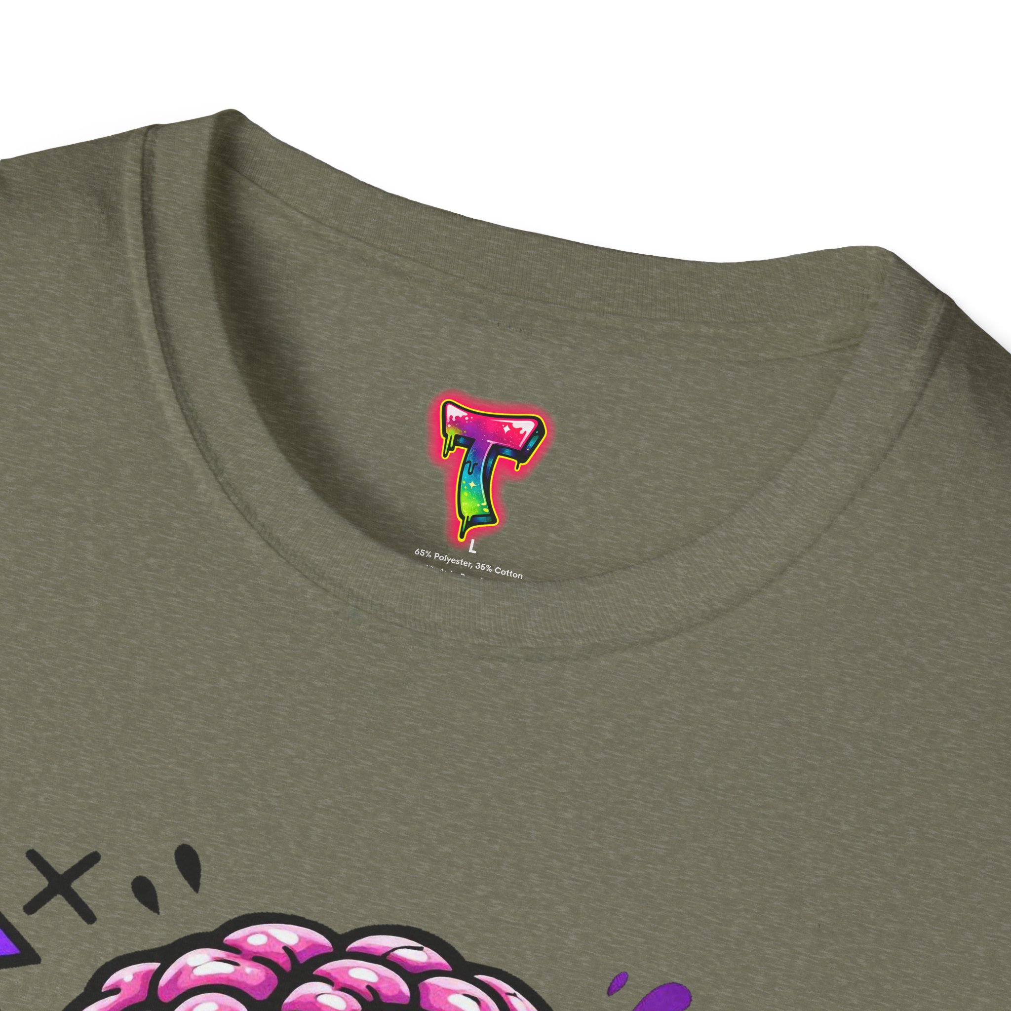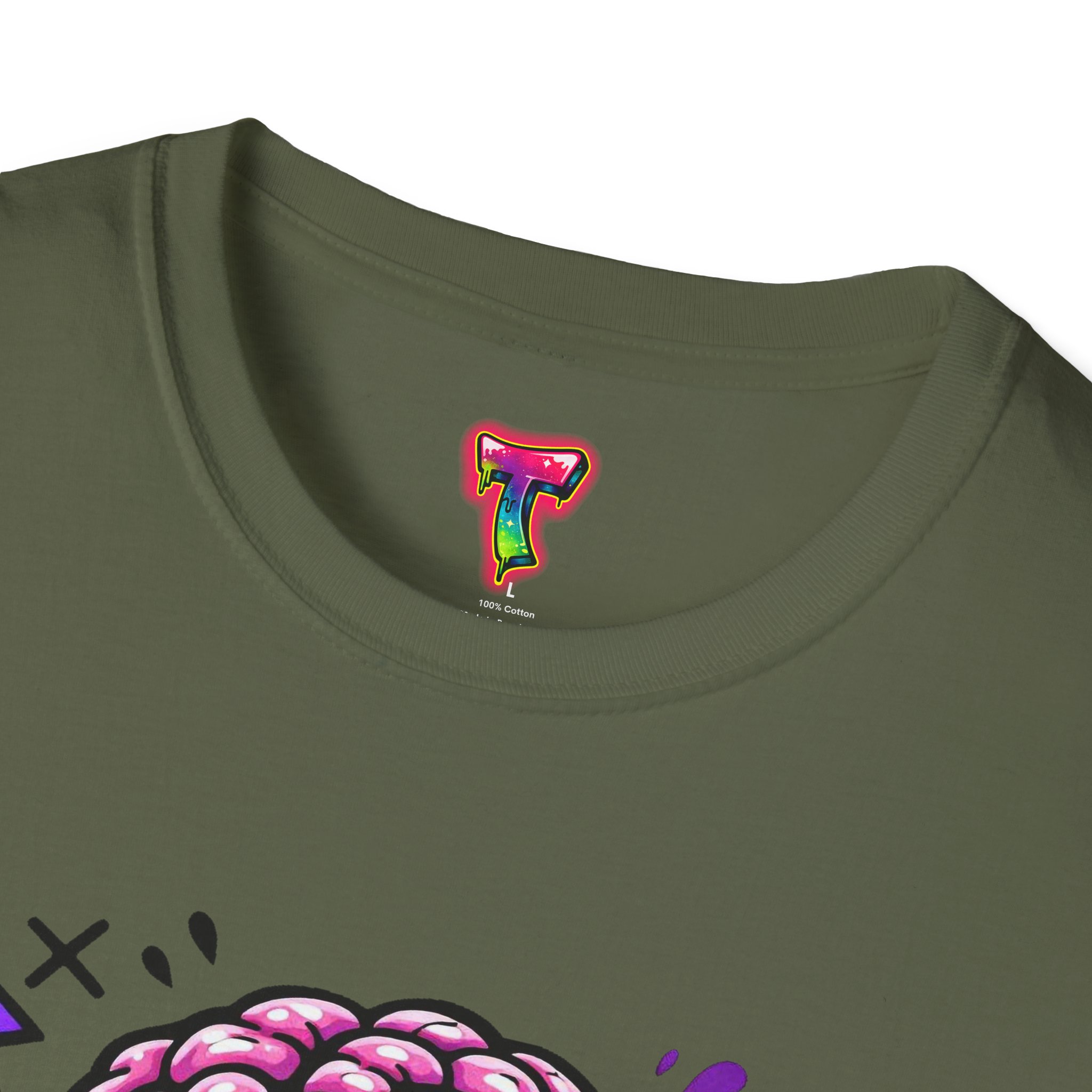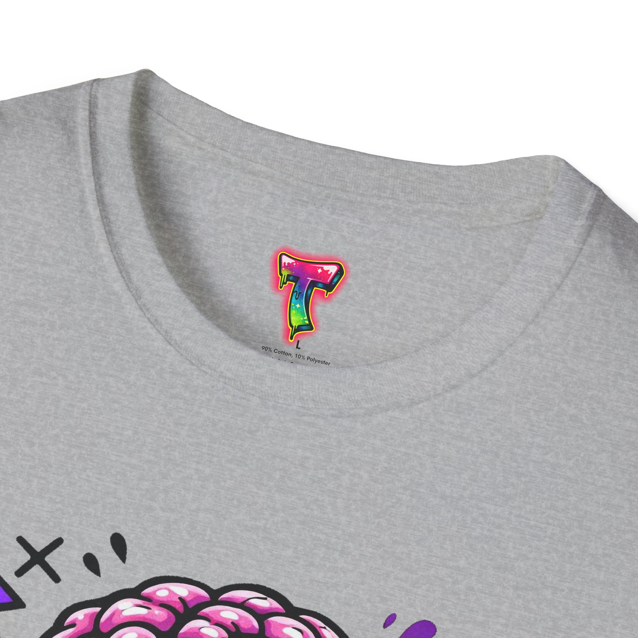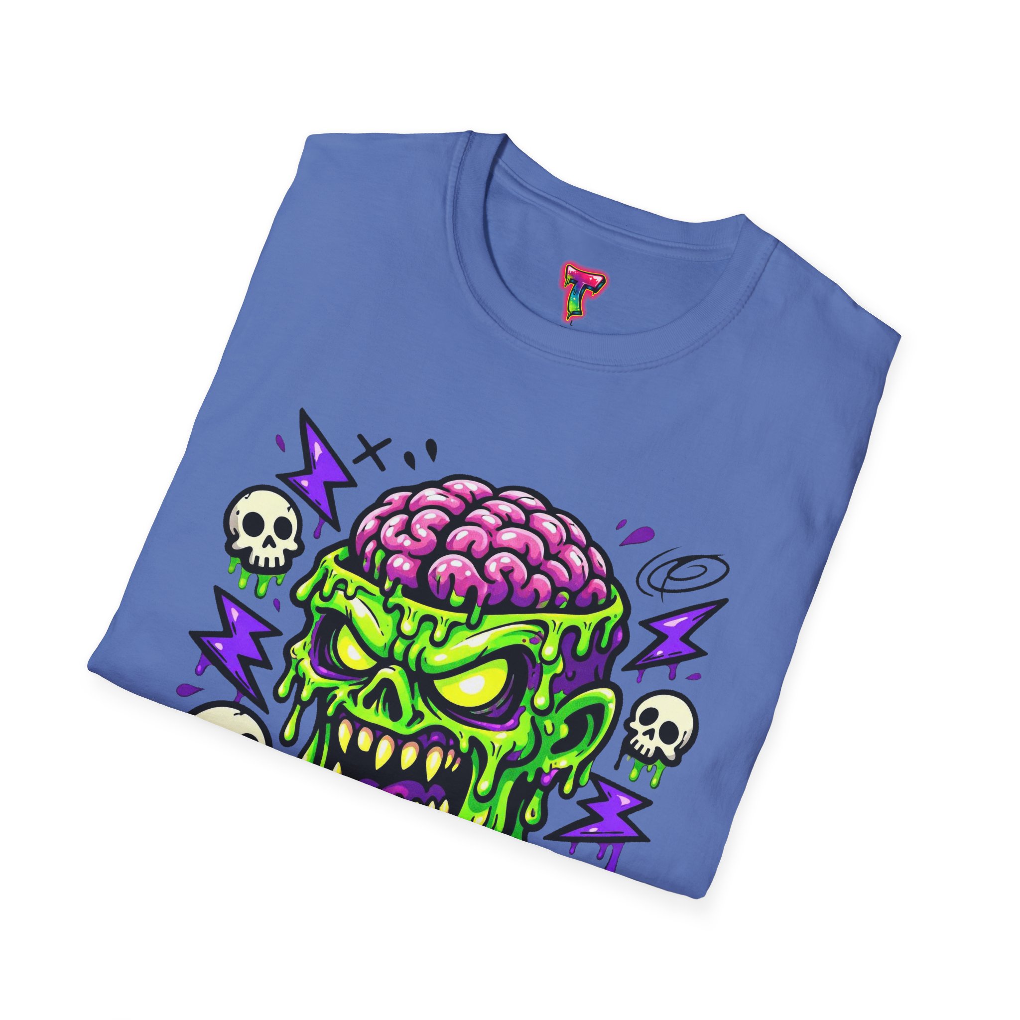 This lightweight cotton tee carries a bold, neon-horror illustration that reads like a midnight comic panel — a goo-dripping skull with exposed brain, electric purple flashes and tiny orbiting skulls. It sits cleanly on the chest so the design stays the center of attention without feeling oversized. Wear it to cut through bland festival crowds, to animate late-night skate sessions, or to anchor a layered streetwear look. The fabric feels soft against skin and breathes easily, so the shirt keeps its edge whether you’re moving through a summer mosh or hanging out at a dim-lit arcade. It’s a statement piece for anyone who likes loud art, punk-tinged aesthetics, and a little horror-show whimsy in their everyday wardrobe.