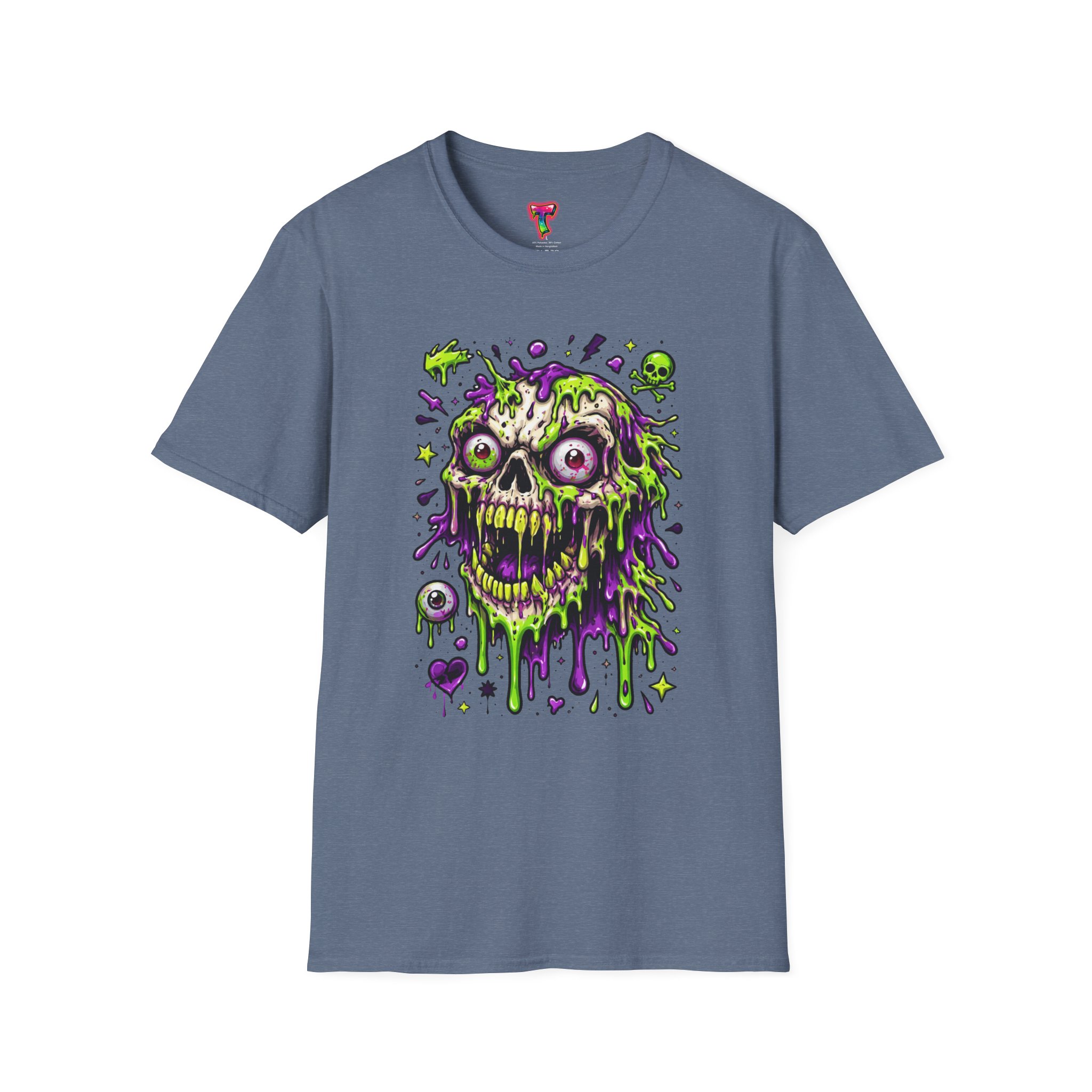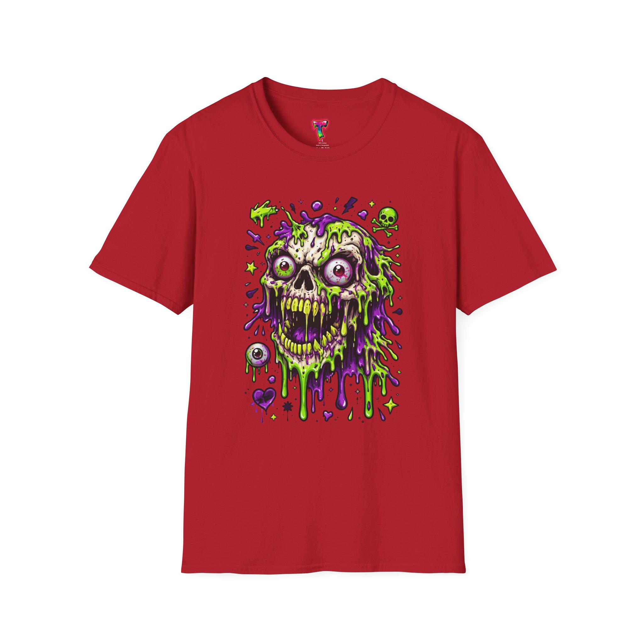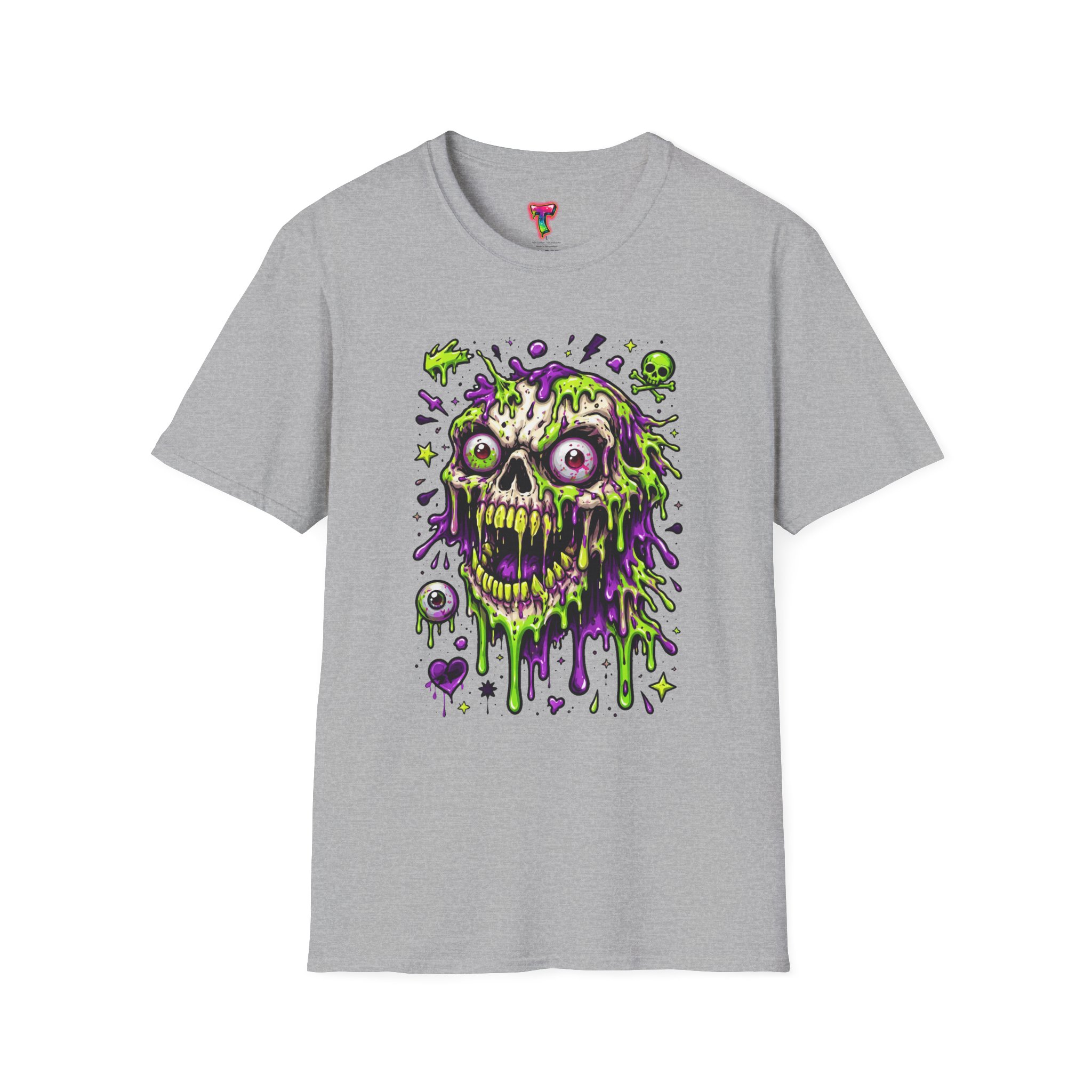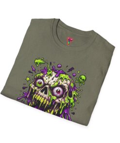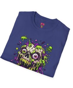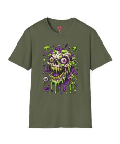 This lightweight crew-neck tee brings a bold, horror-punk edge to everyday wear. The front features a dripping, neon-green-and-purple skull illustration with gooey textures, floating eyeballs and tiny accent icons that look hand-drawn and slightly chaotic. The shirt breathes easily in warm weather and layers cleanly under jackets. Wear it to show off a love for retro horror art, night ride meetups, skate park hangs, or late-night shows — it reads like a wearable poster for anyone who prefers grime, color, and attitude over quiet basics. The fabric feels soft against the skin and holds print detail crisply, so the vibrant artwork stays sharp wash after wash.