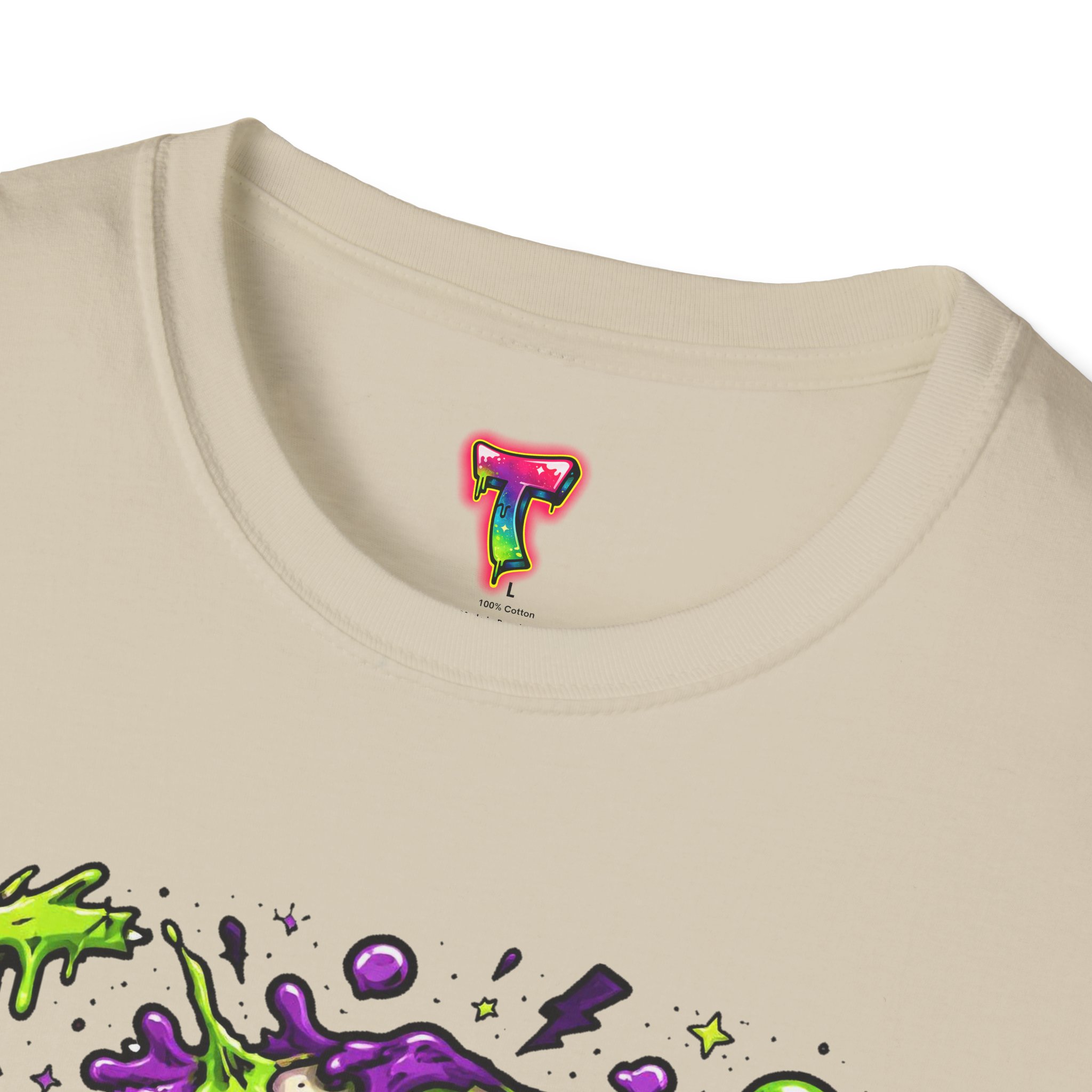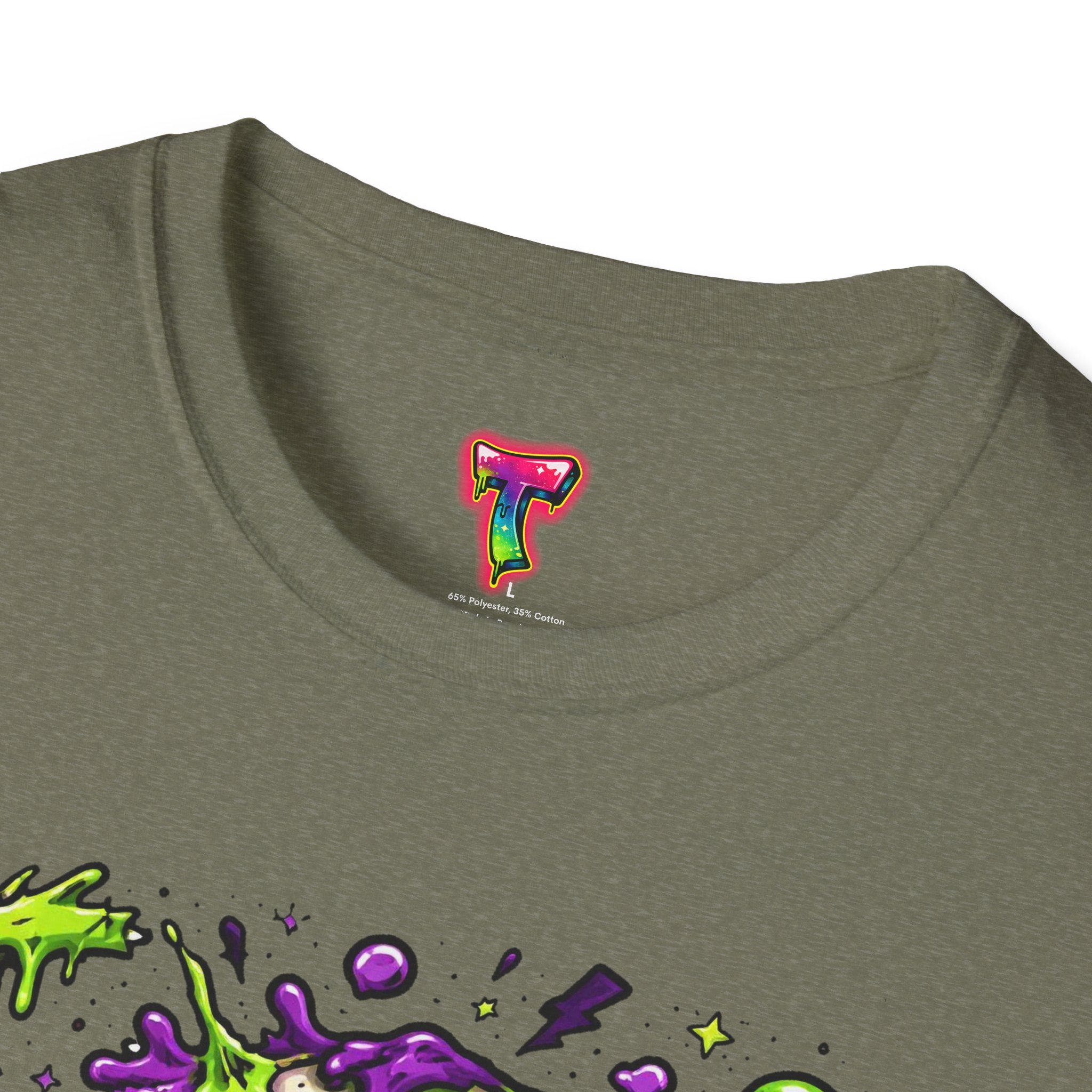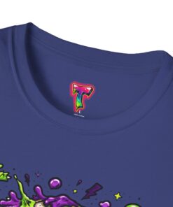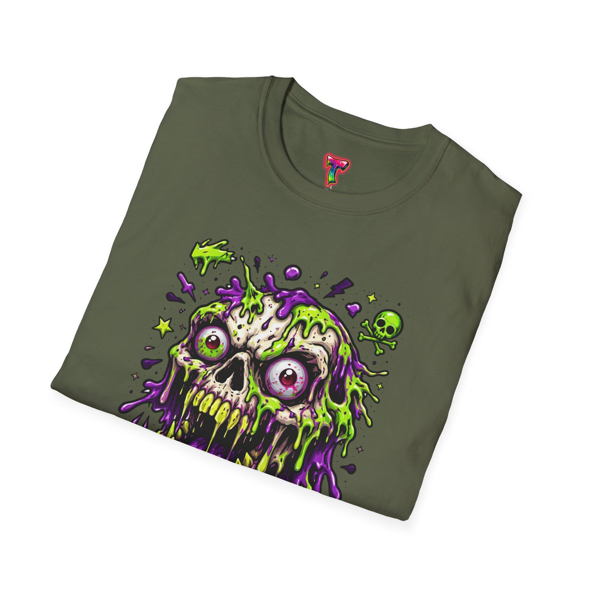 This lightweight crew-neck tee brings a bold, horror-punk edge to everyday wear. The front features a dripping, neon-green-and-purple skull illustration with gooey textures, floating eyeballs and tiny accent icons that look hand-drawn and slightly chaotic. The shirt breathes easily in warm weather and layers cleanly under jackets. Wear it to show off a love for retro horror art, night ride meetups, skate park hangs, or late-night shows — it reads like a wearable poster for anyone who prefers grime, color, and attitude over quiet basics. The fabric feels soft against the skin and holds print detail crisply, so the vibrant artwork stays sharp wash after wash.